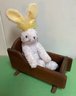A handmade wooden doll's cradle with sweet rabbit. The cradle is 8" long by 5" high by 4 3/4" deep. The rabbit is 9 1/2" tall. The name on his tag is "Carrots". Both are in good condition.