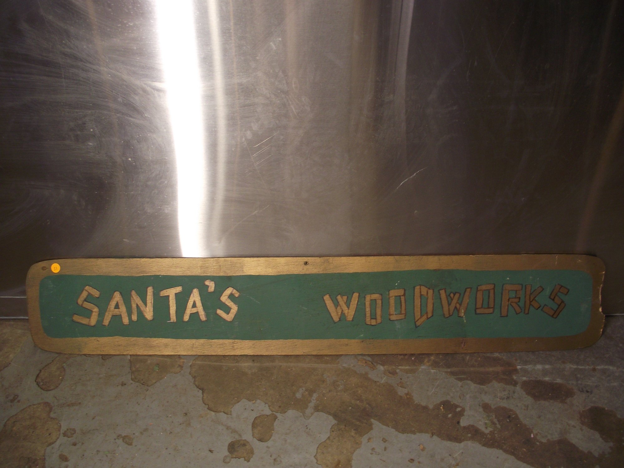 VINTAGE WOODEN HAND PAINTED SANTAS WOODWORKS SIGN. PLEASE SEE PHOTOS FOR CONDITION.