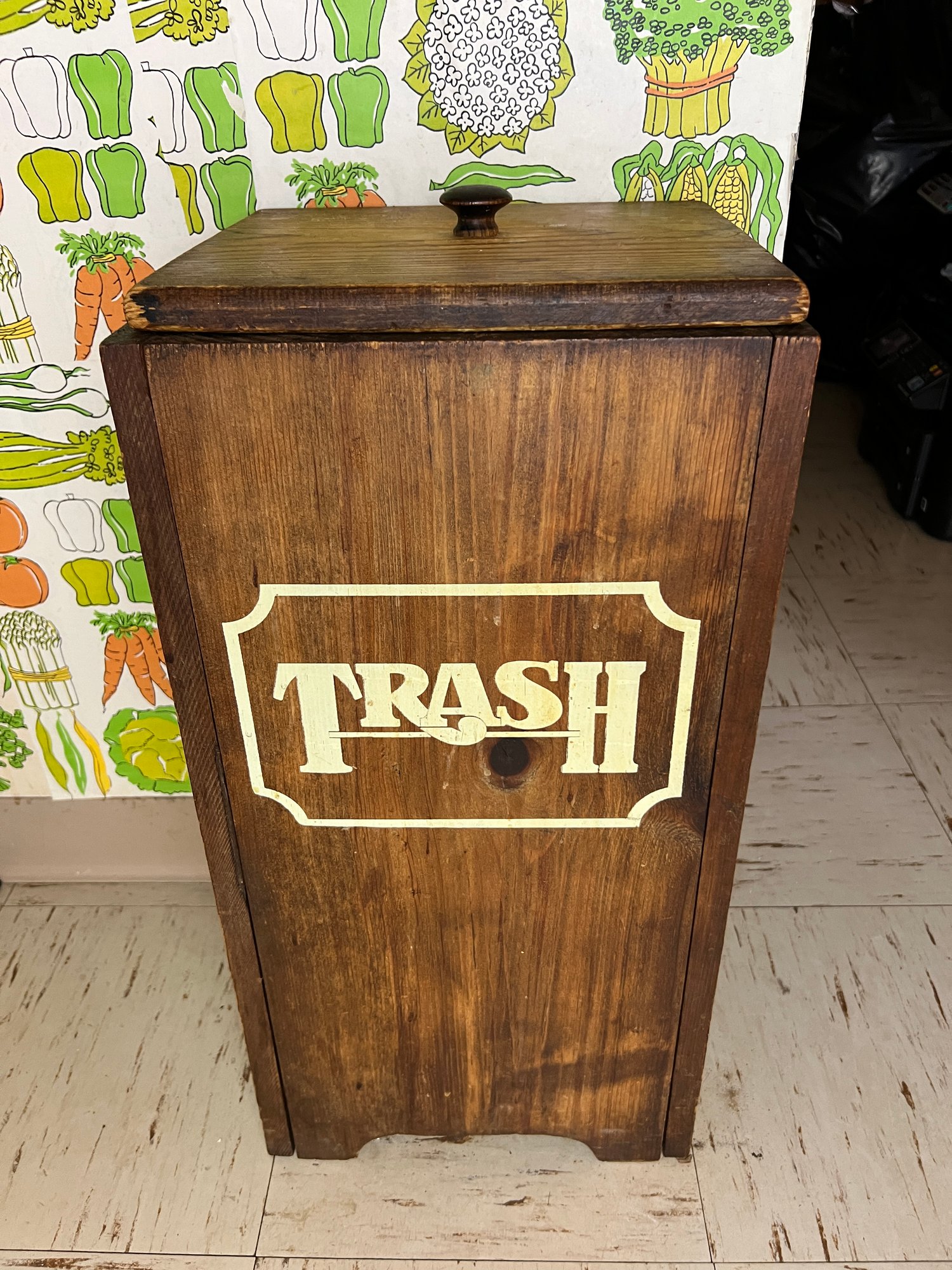 Vintage kitchen trash can with lid constructed of solid pine with the lettering Trash on the front in a retro '70s font.