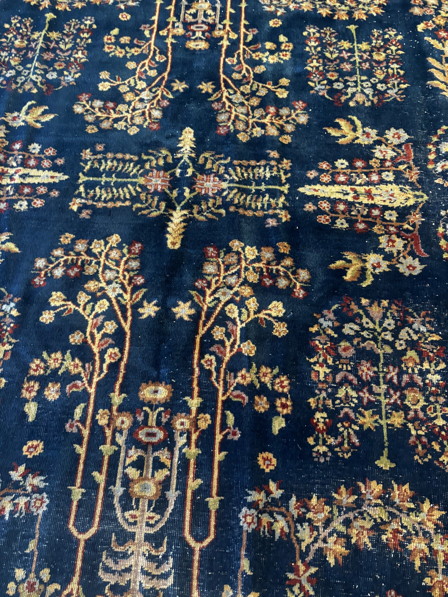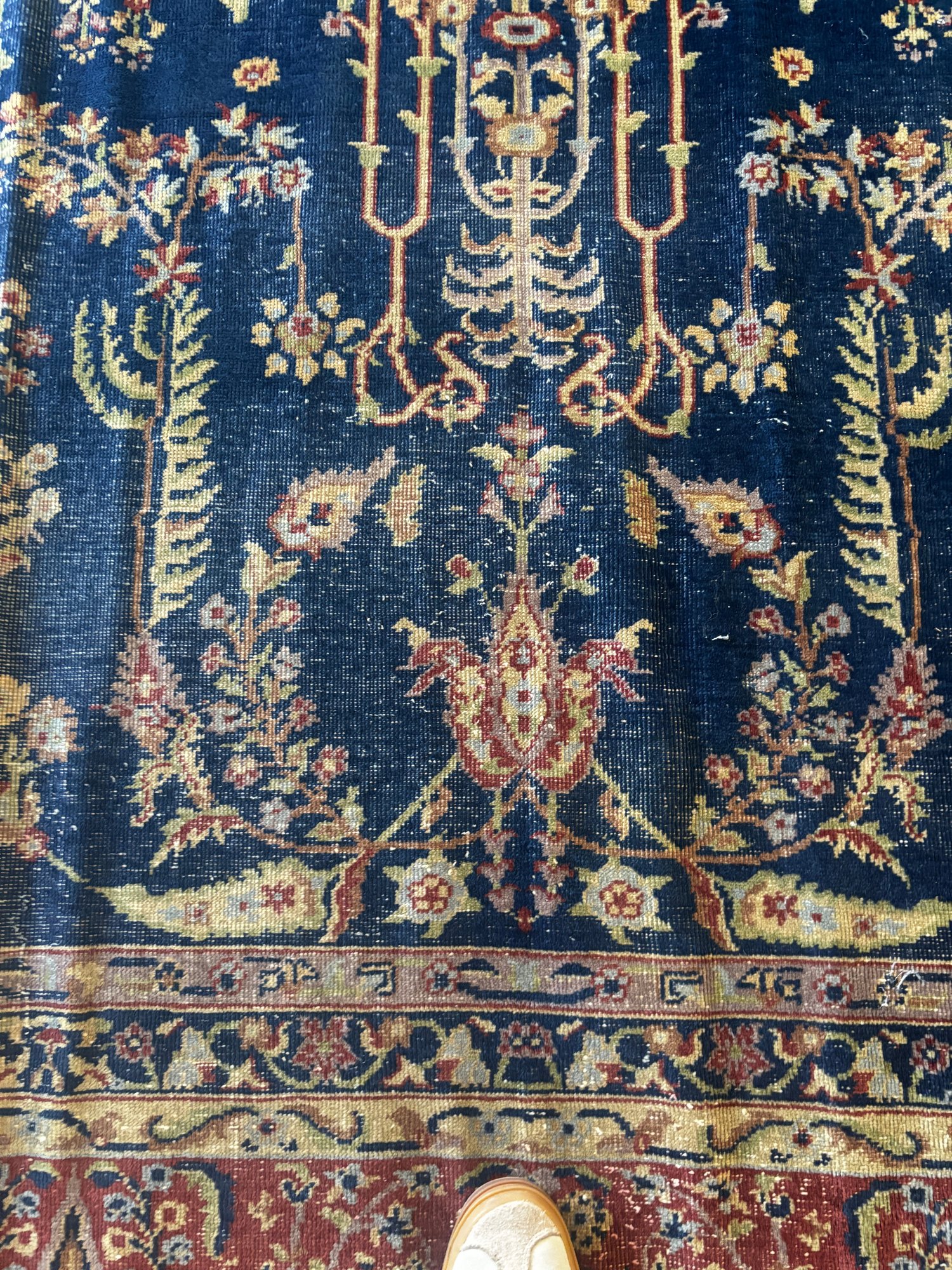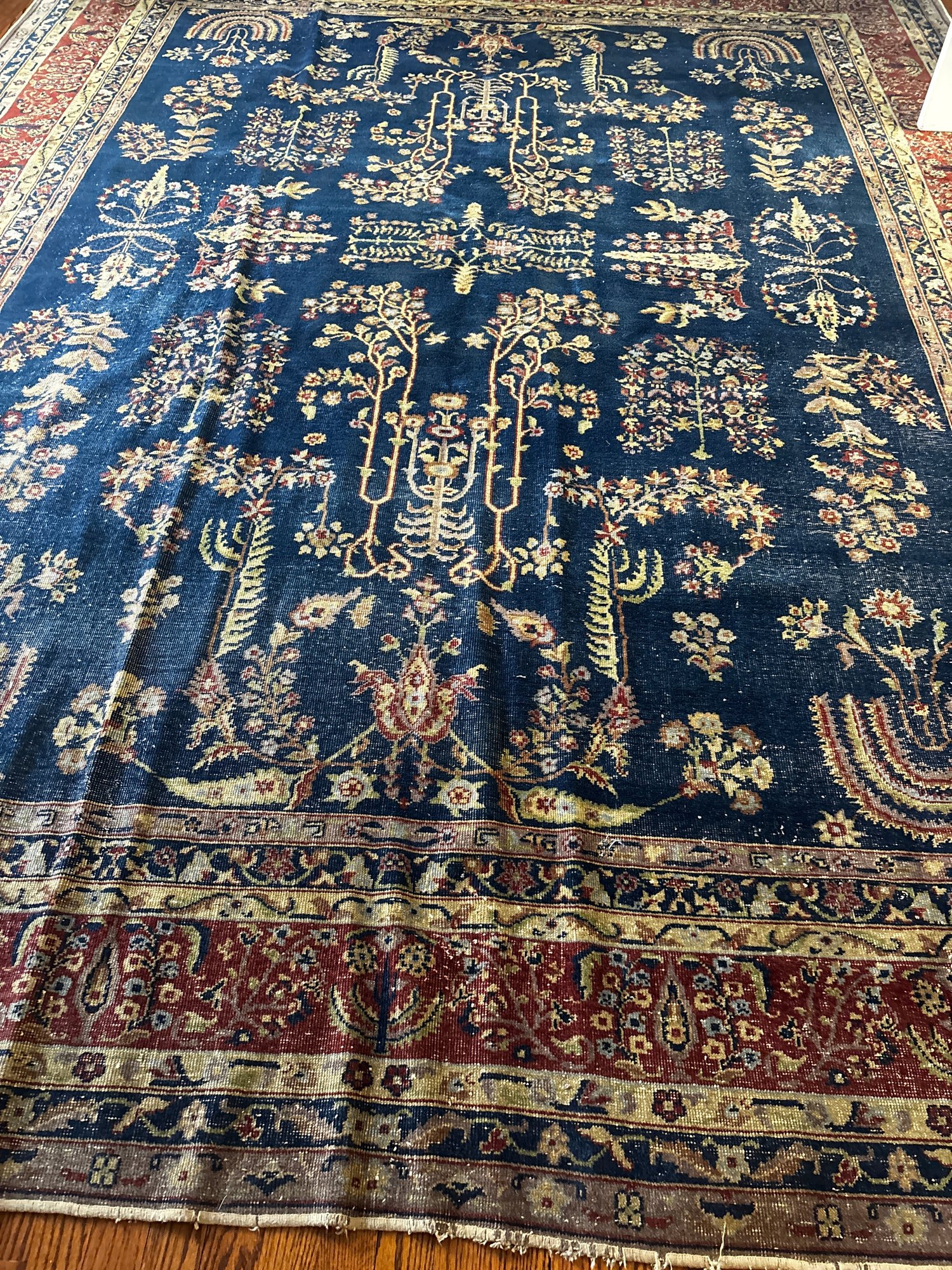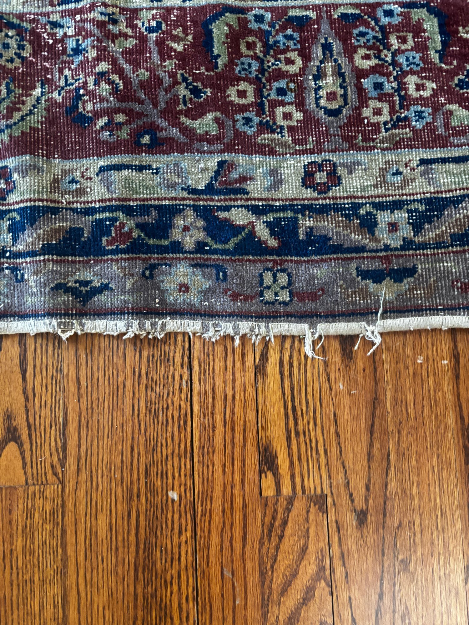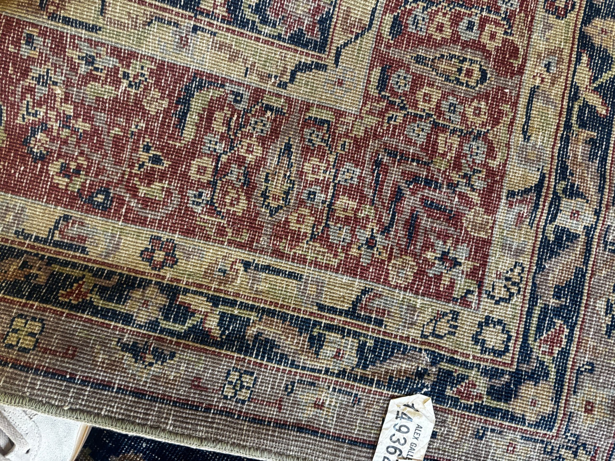 Measures 108" X 138". Note wear to rug and fringe in photos