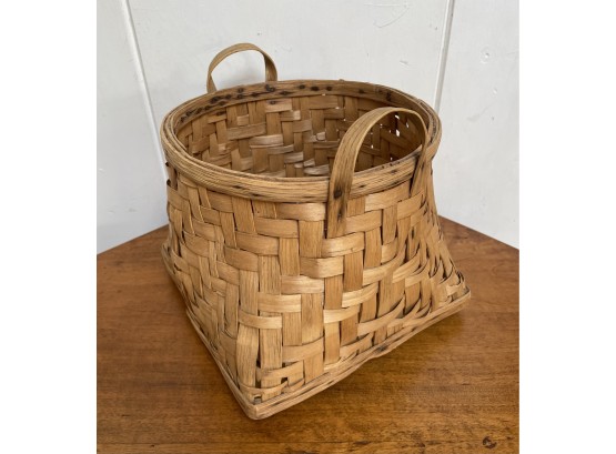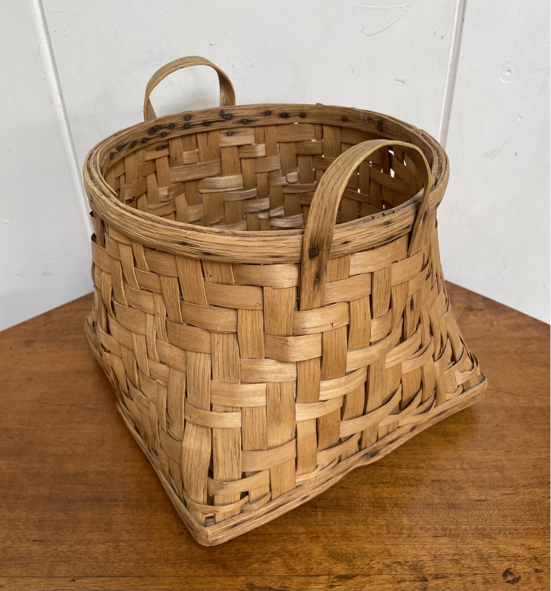 A very unusual shape vintage basket. The slats that create the basket are both bent and woven. Small metal tacks hold the basket together. It's in good vintage condition with some wear as shown in the final photo, but overall quite good. The basket measures 9 1/4" square at the base and 8" in diameter at the top. It is 8 1/2" tall.