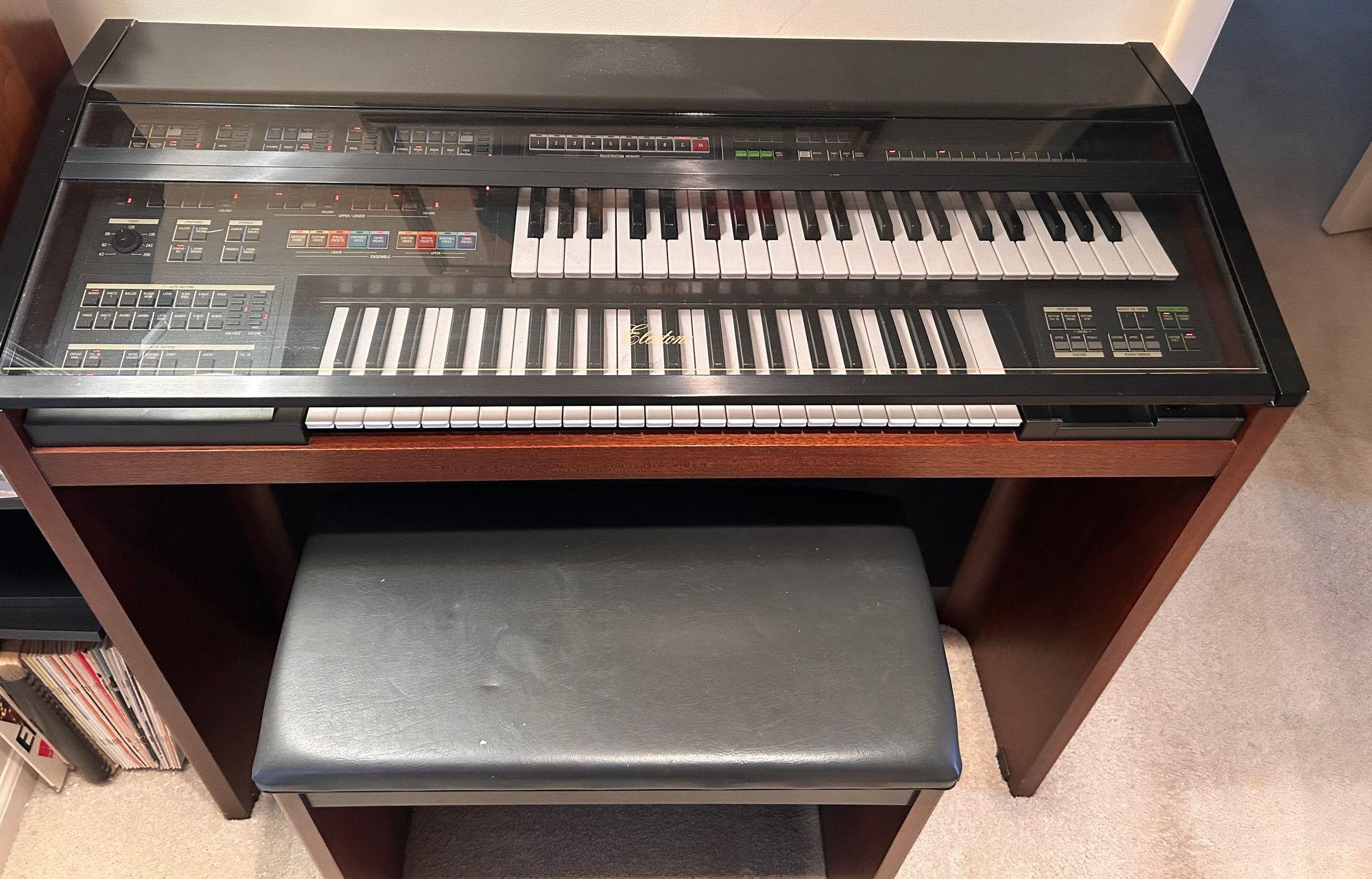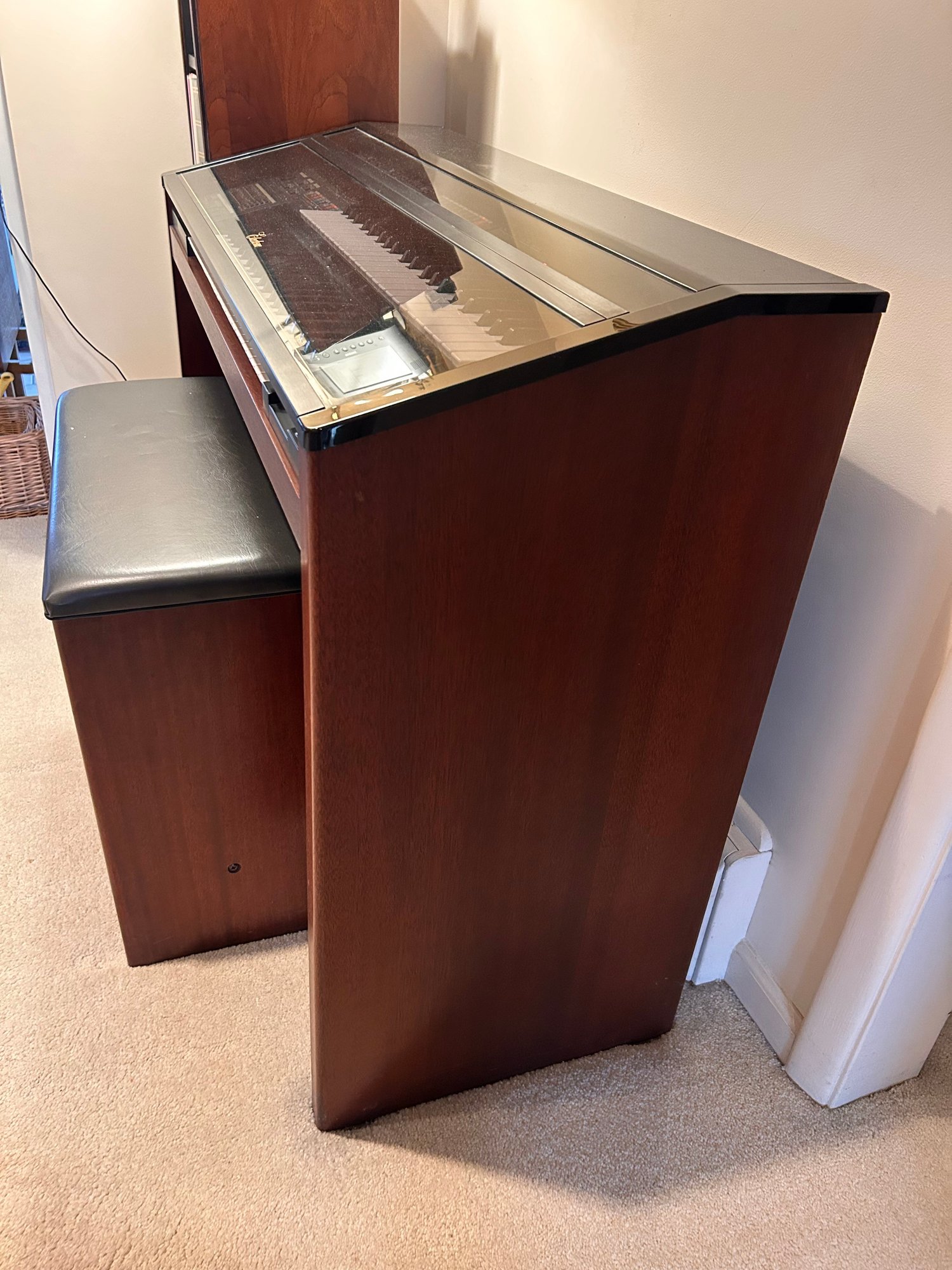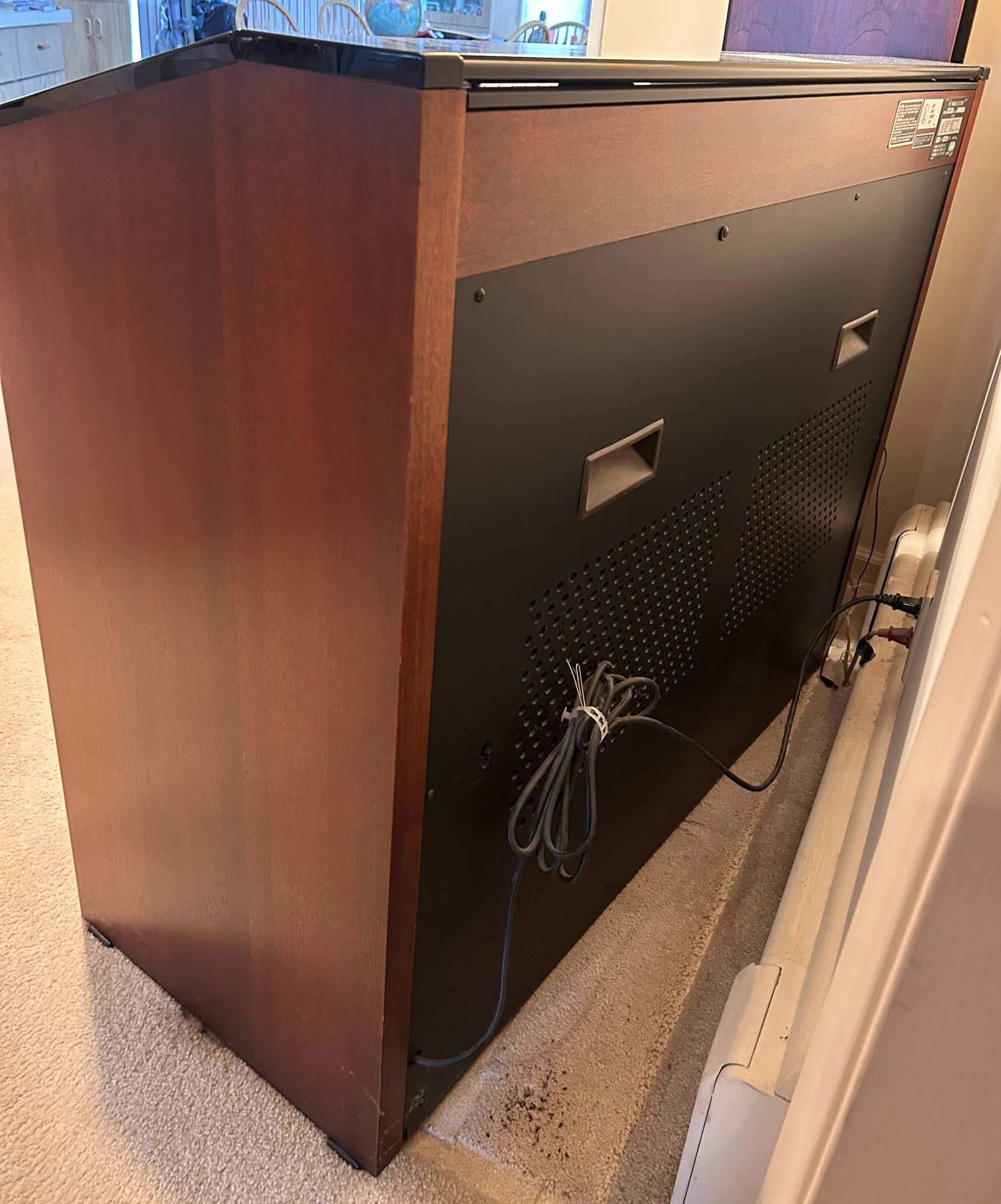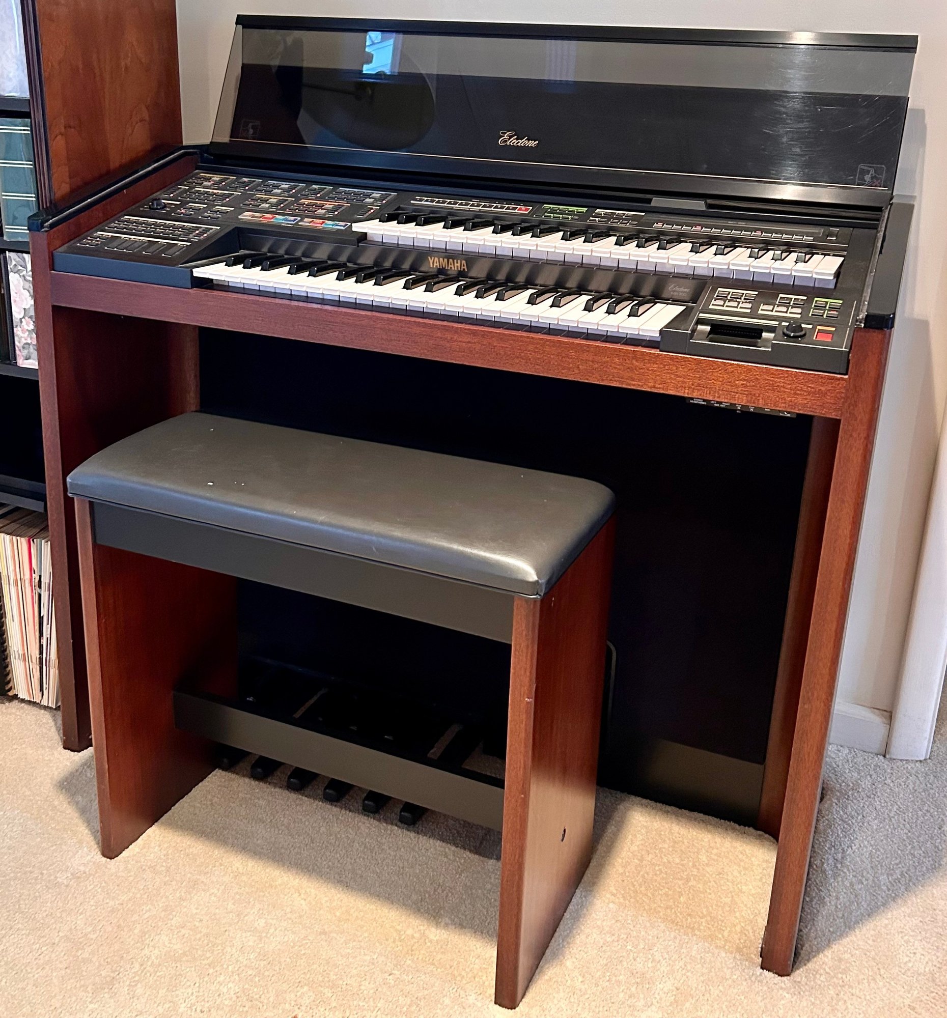 Tested and working, this unit appears clean and well kept. It includes headphones and has a folding glass top with a beautiful wooden finish. Measures approximately 42.5” wide, 17.5” deep with a height of 35”.