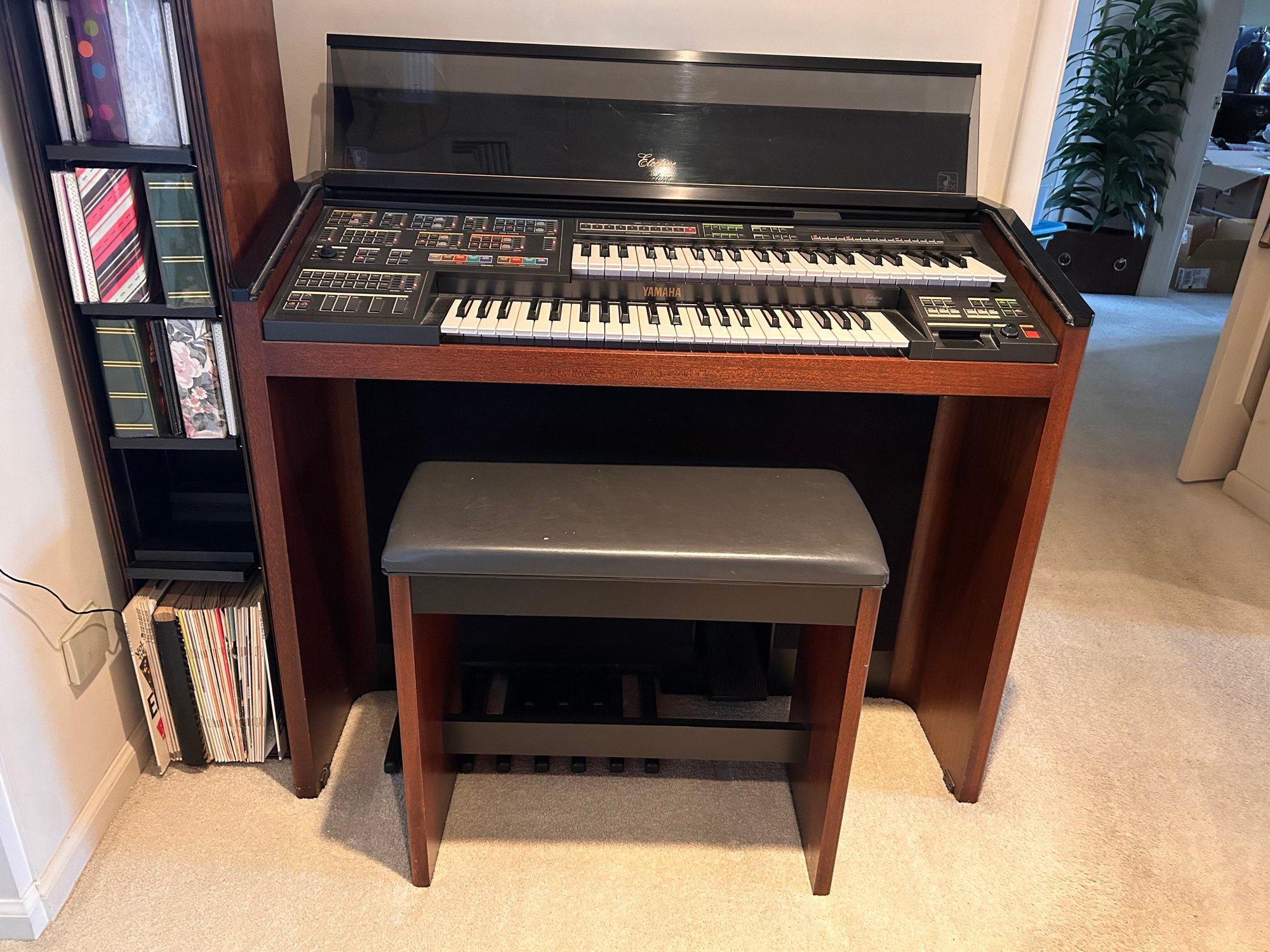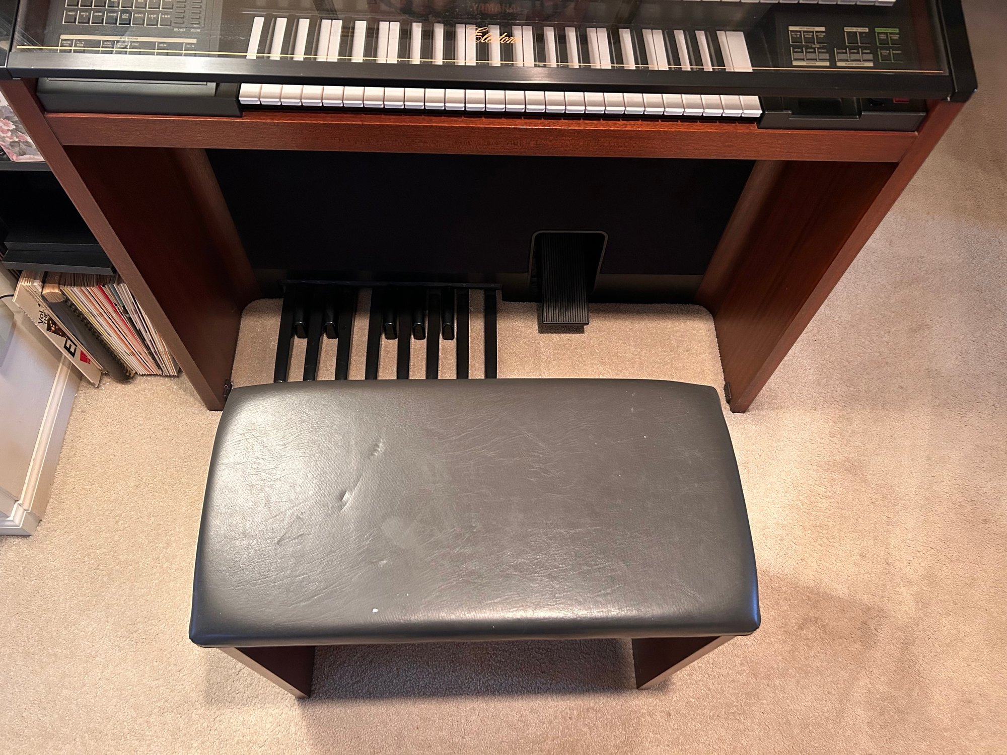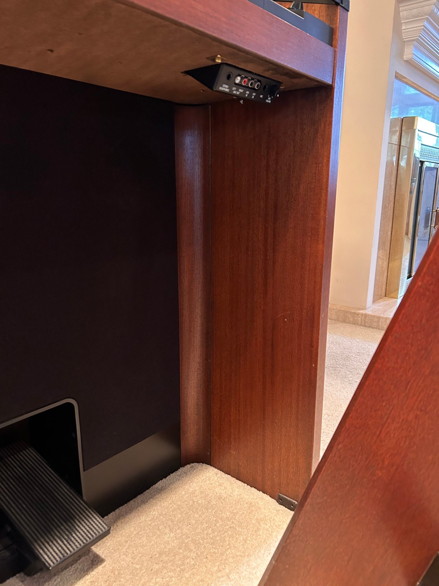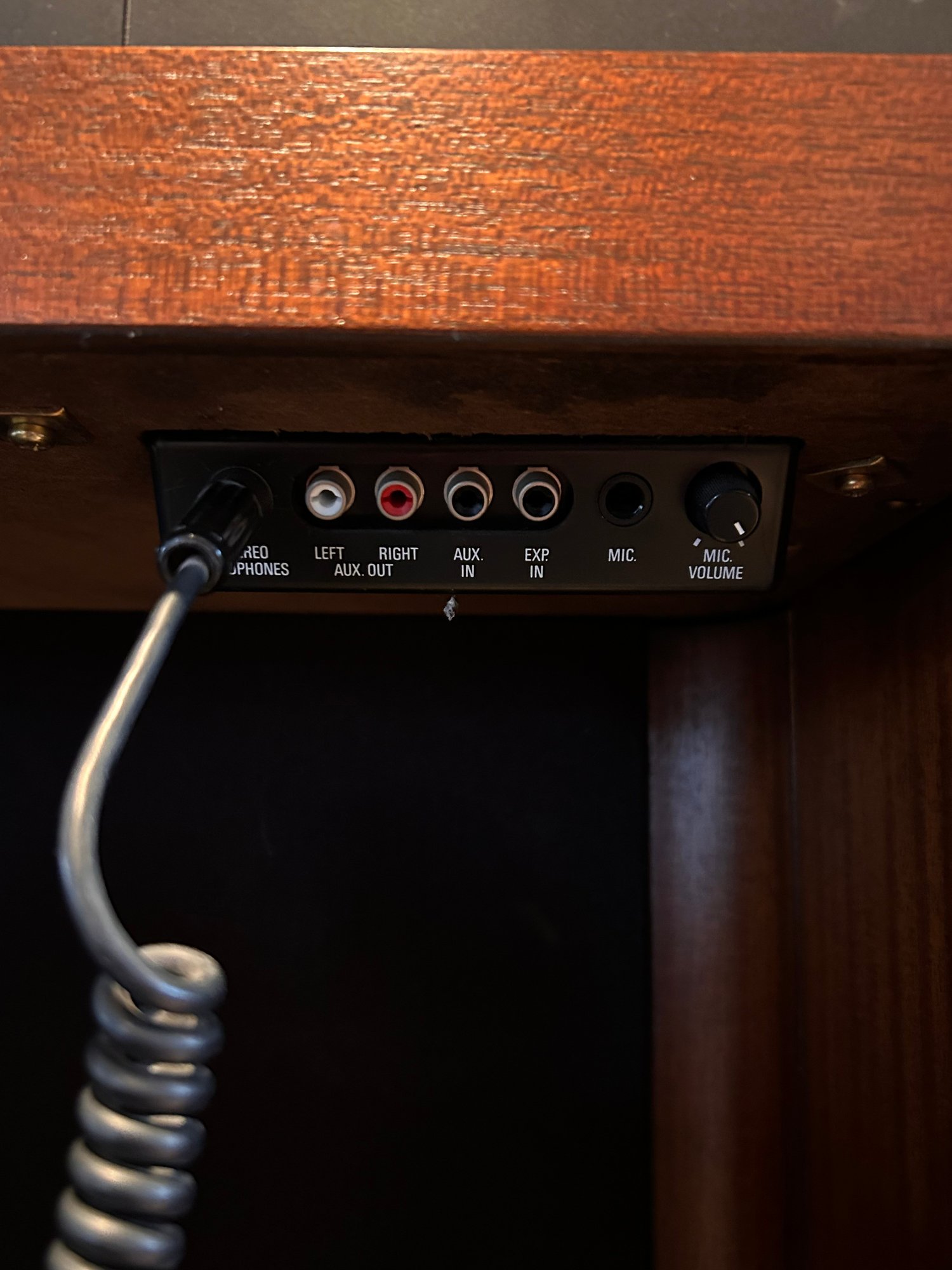 Tested and working, this unit appears clean and well kept. It includes headphones and has a folding glass top with a beautiful wooden finish. Measures approximately 42.5” wide, 17.5” deep with a height of 35”.