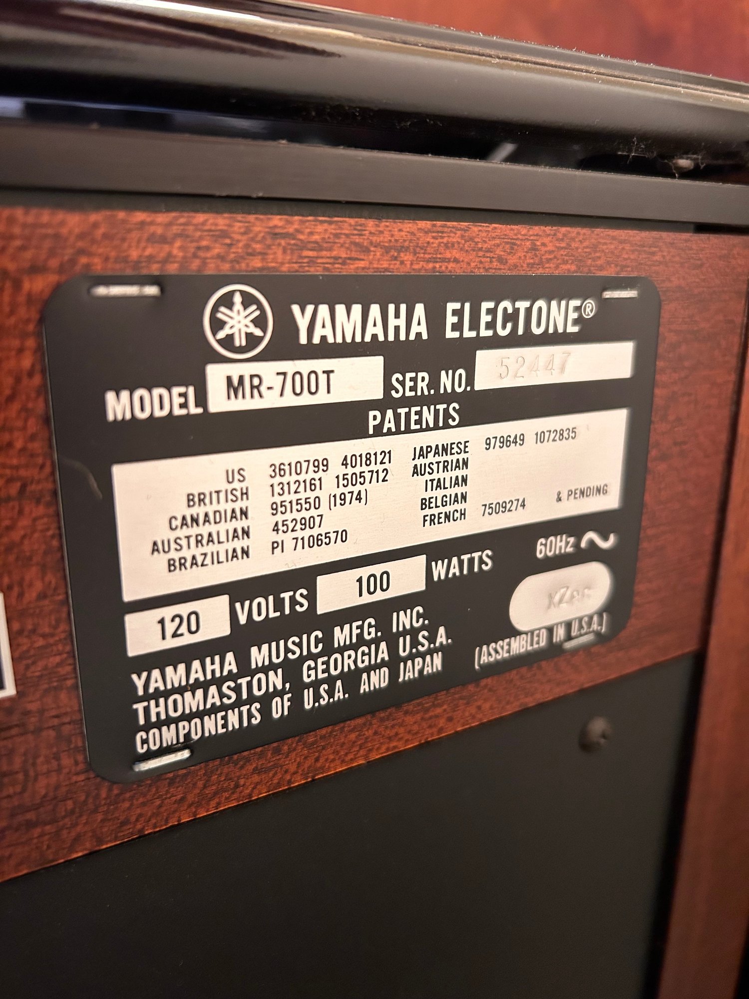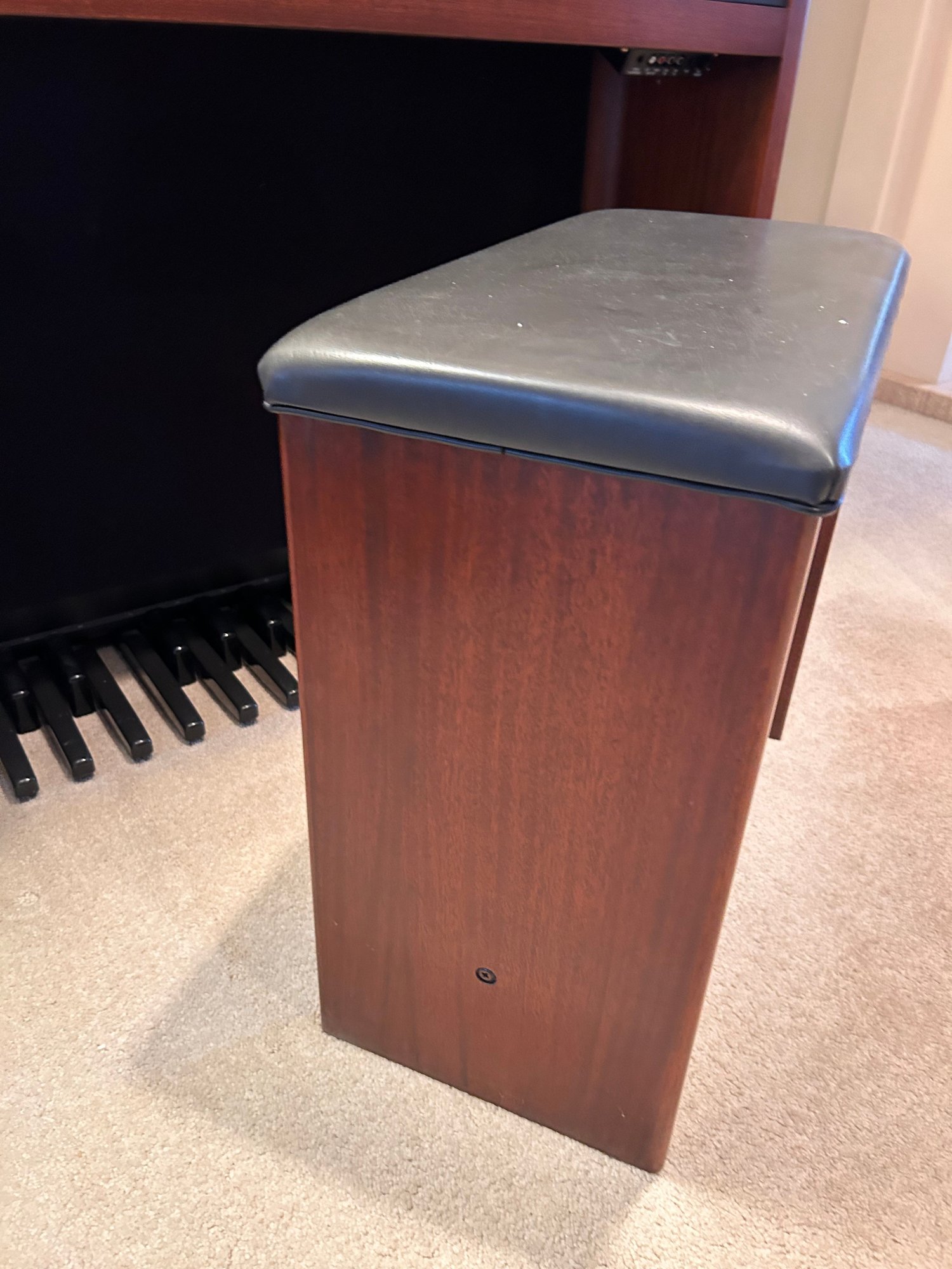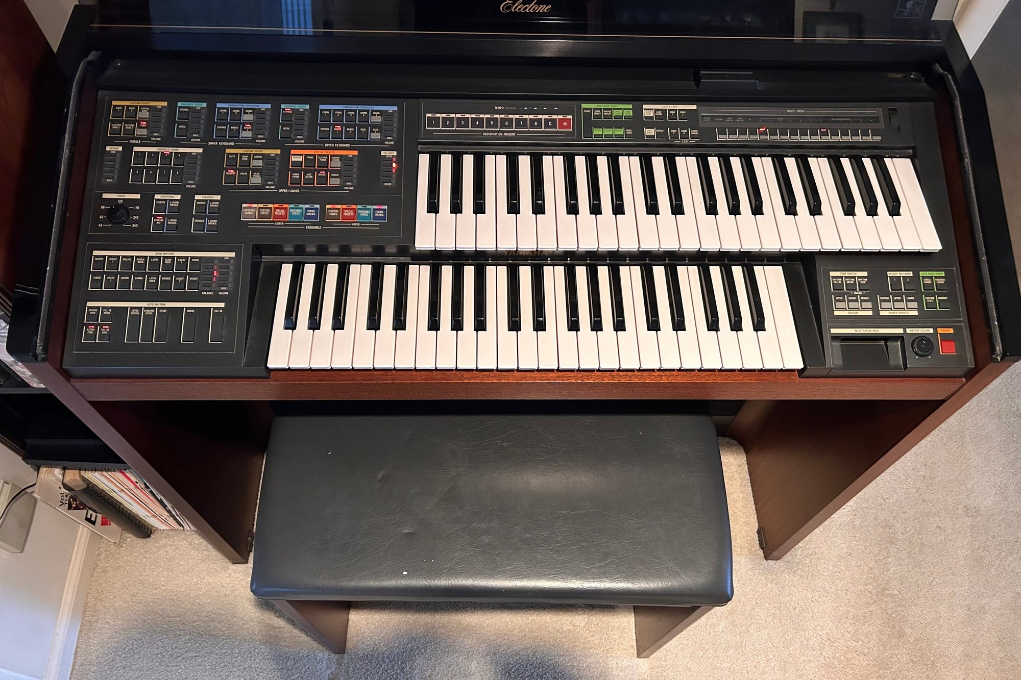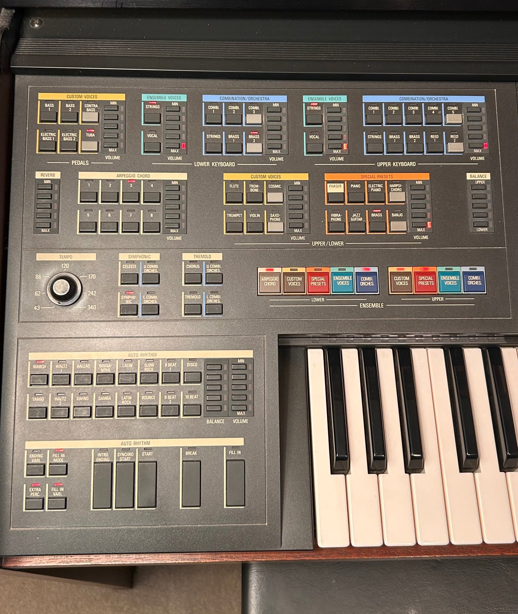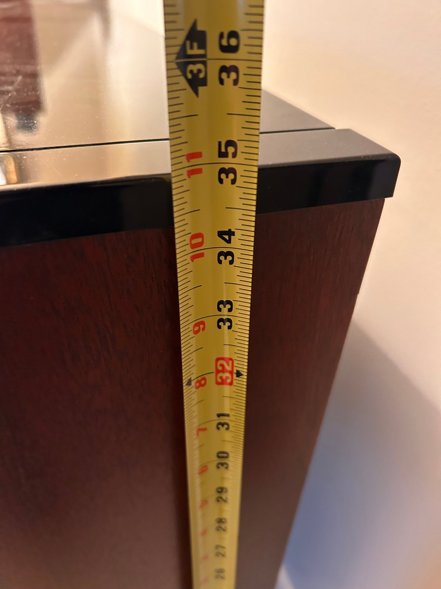 Tested and working, this unit appears clean and well kept. It includes headphones and has a folding glass top with a beautiful wooden finish. Measures approximately 42.5” wide, 17.5” deep with a height of 35”.