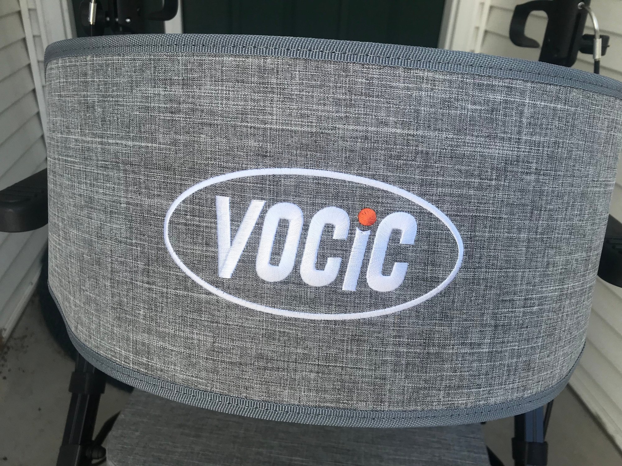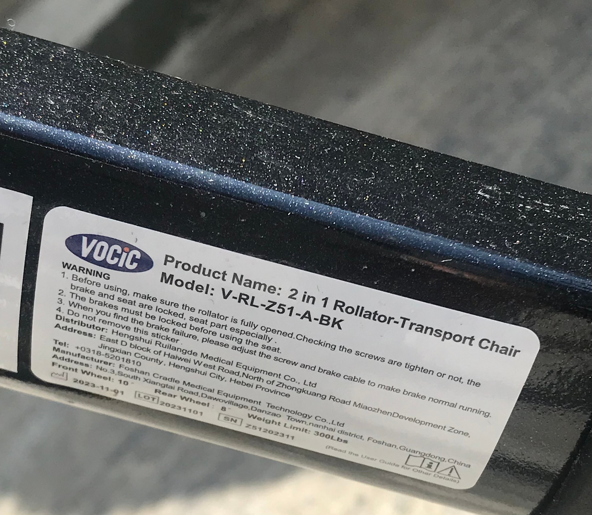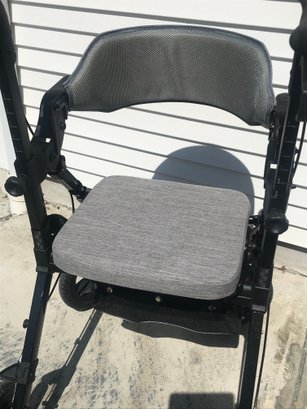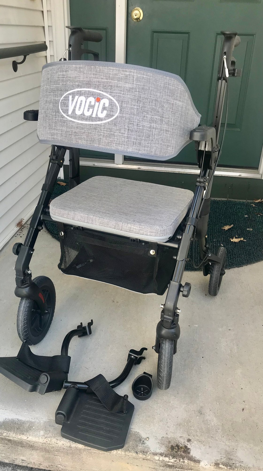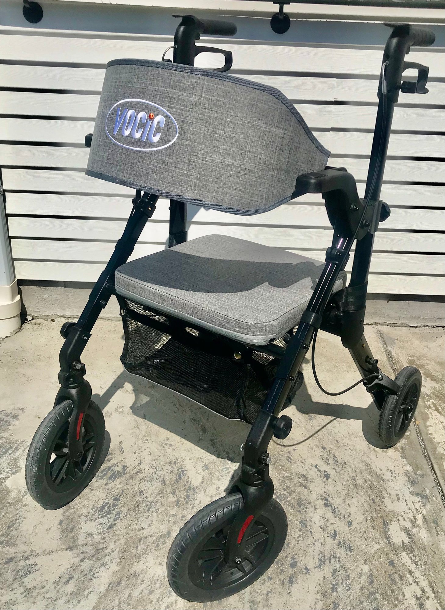 This versatile VOCIC (Model V-RL-Z51-A-BK) serves as both a rolling walker and a temporary transport chair, offering maximum mobility and convenience. Designed with a sleek black frame and gray fabric accents, it features a padded seat and a wide, supportive backrest for comfort during rest breaks.