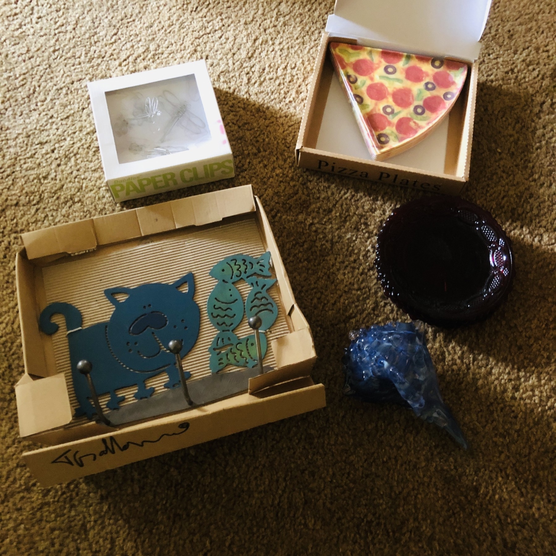 Wall Hook, plates and art glass shell lot. Also includes decorative paper clips.