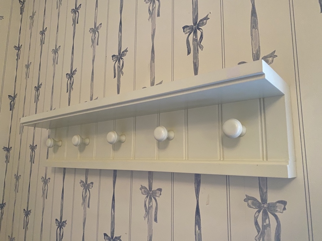 So sweet for a baby or girl's room or can be painted to match any decor. Hanging wall shelf with 5 lower knobs. 30" long.