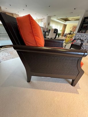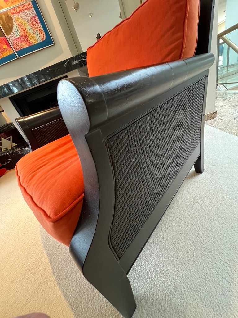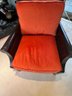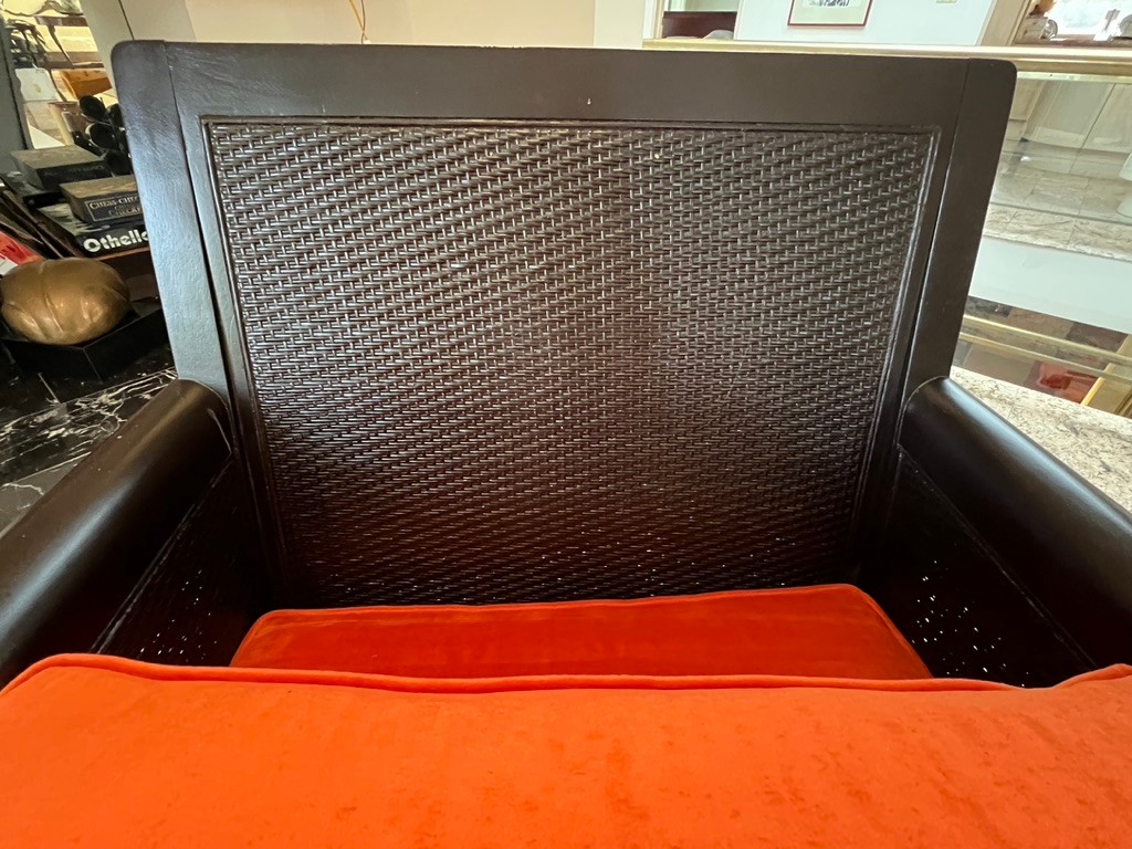Walnut & Rattan, w/velour cushions in orange, so plush, so comfy, warm, and toasty, this is by Bloomingdales, in such wonderful condition, always covered, lovely
