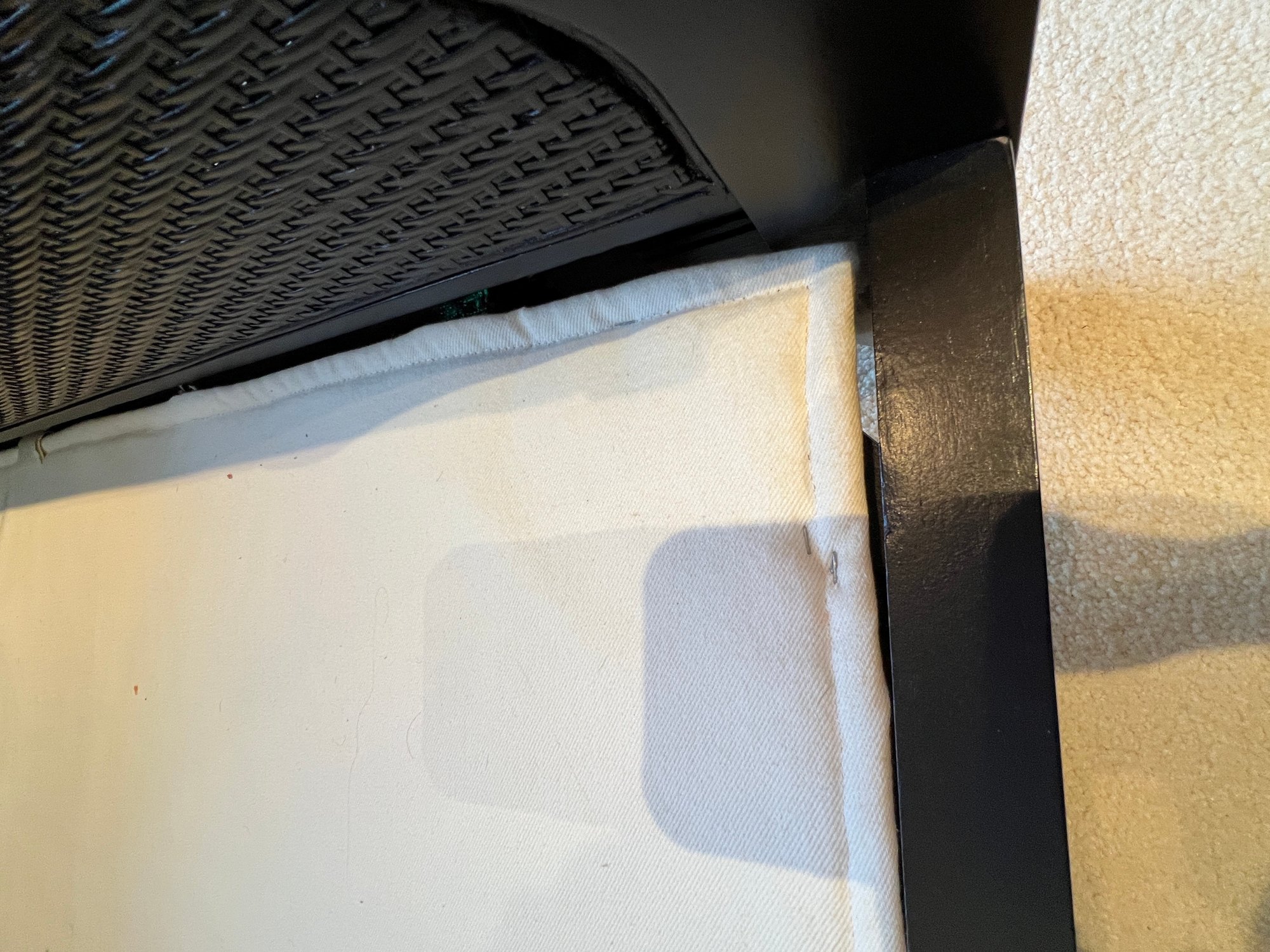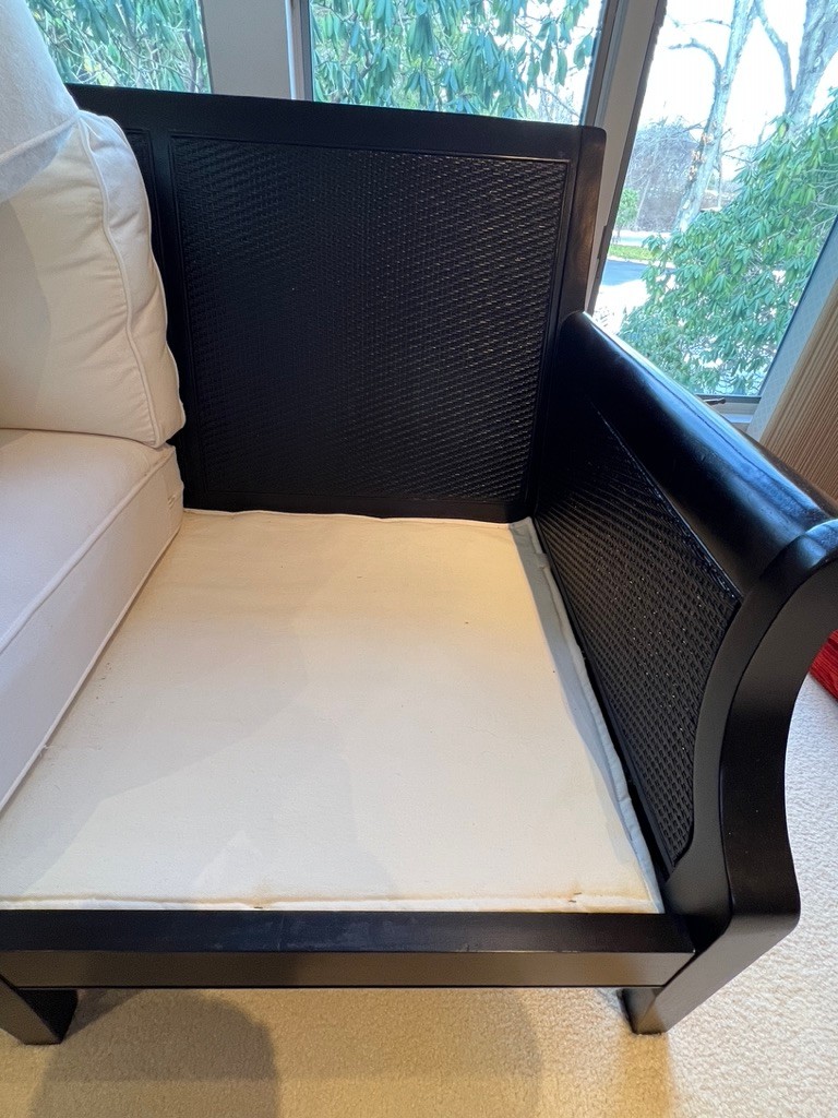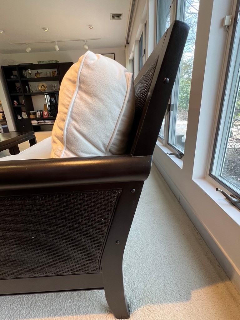 STUNNINGLY beautiful, white canvas, clean, cushions w/ walnut and rattan sofa, in fabulous condition, ready for any room, beautifully made with 4 supports across the front and rear, rolled arms, plush and lush!
