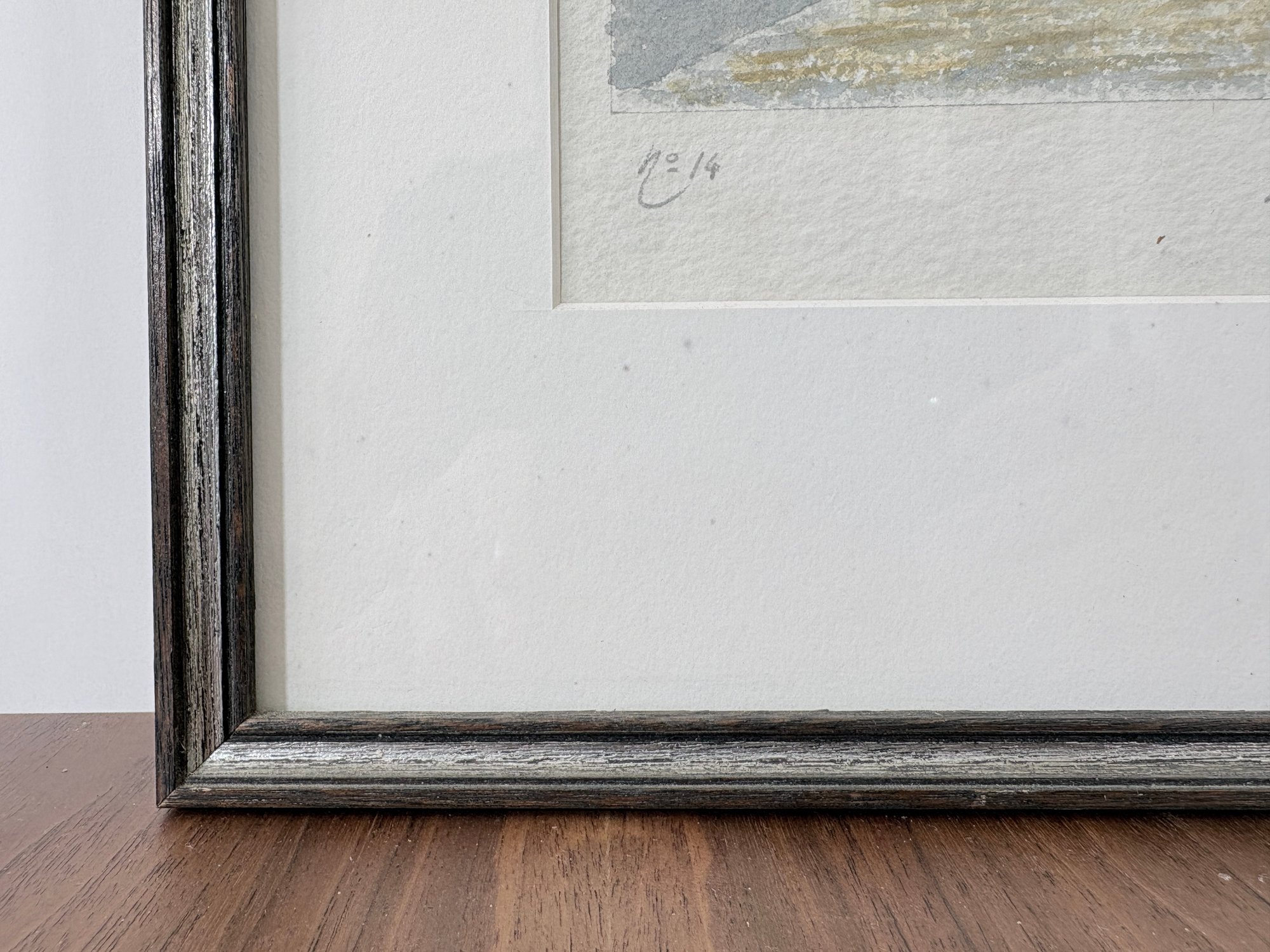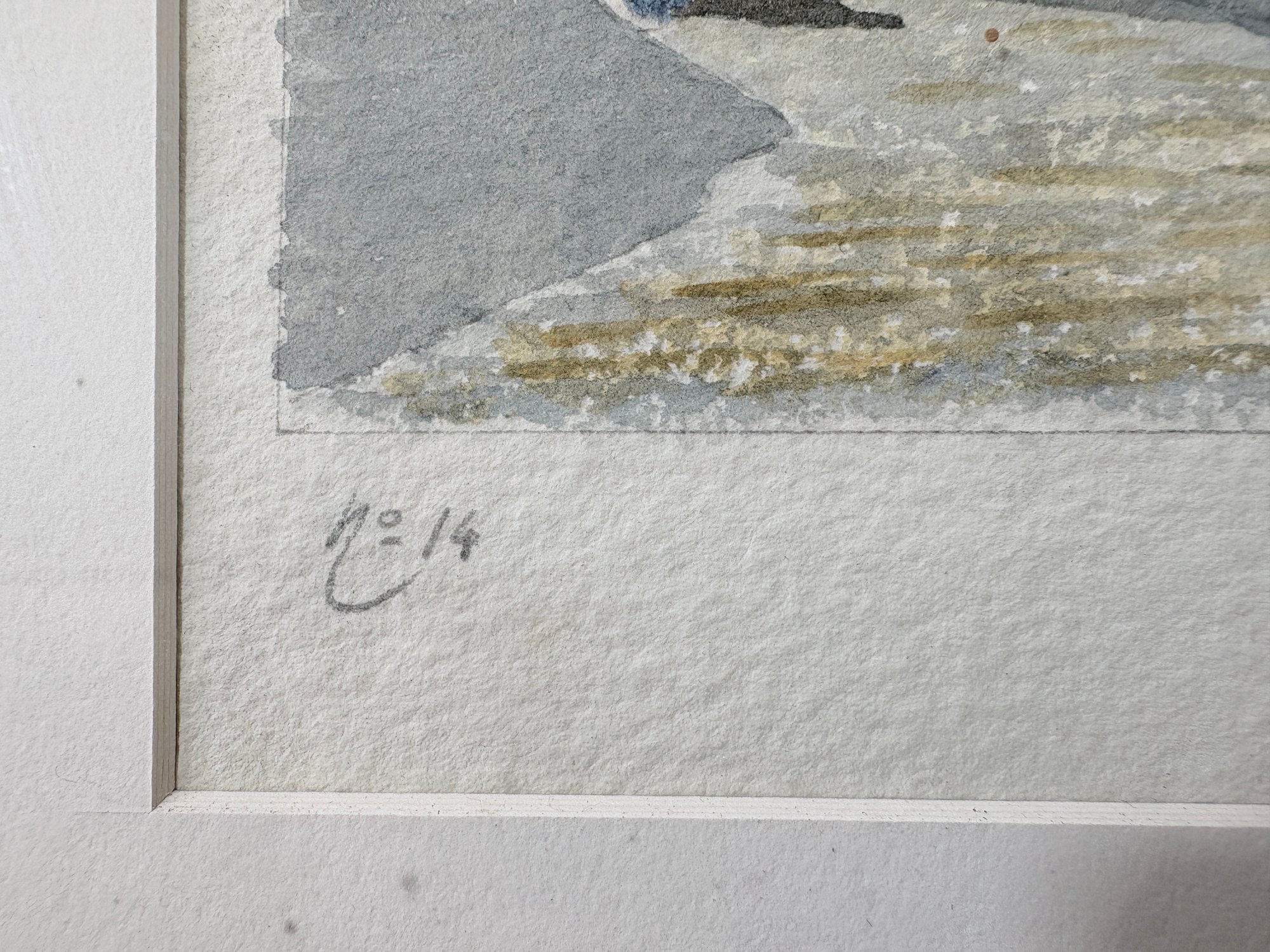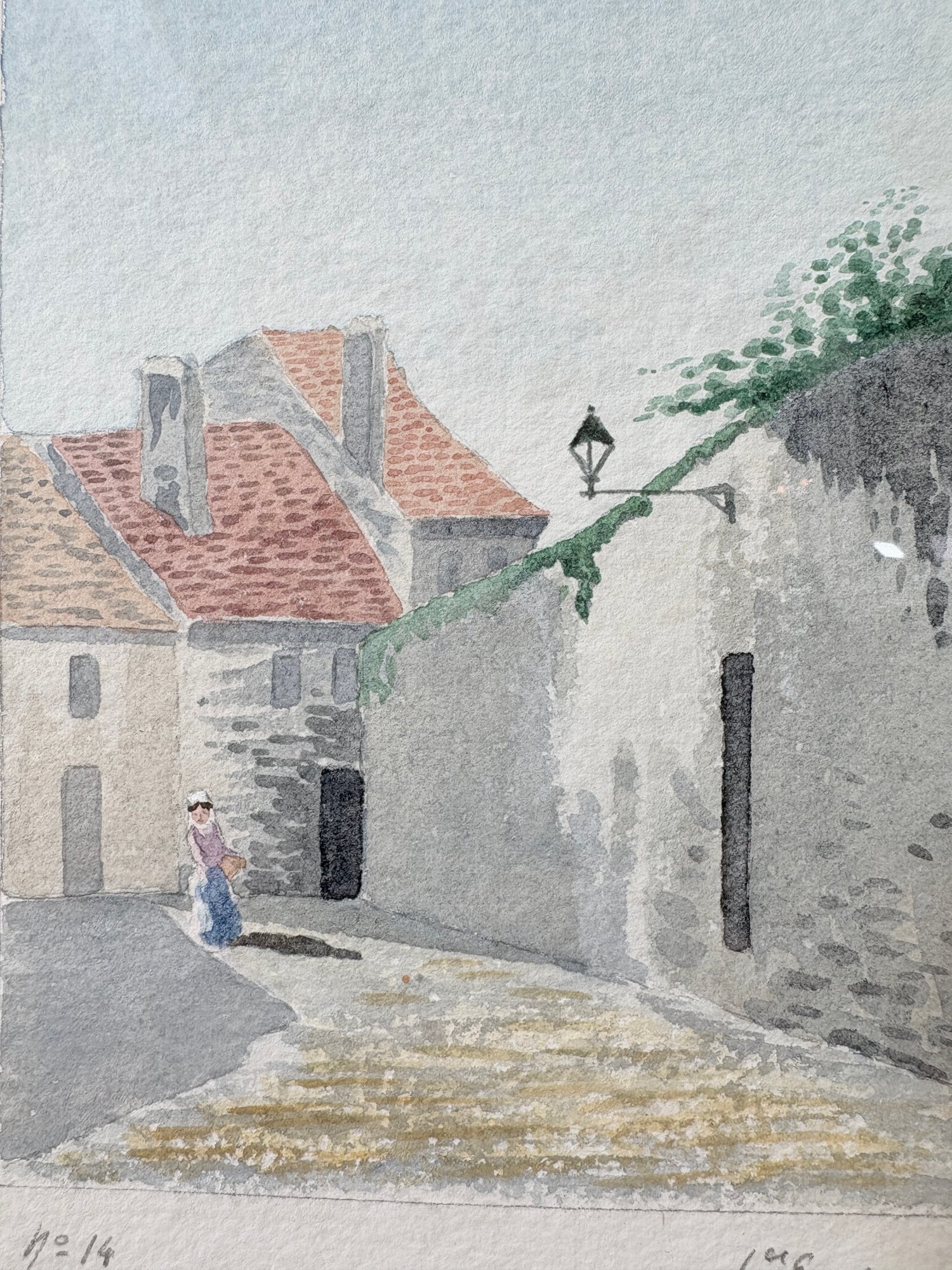 Charming interwar watercolor depicting a quiet stone lane in Èze, dated April 10, 1936. The composition captures the village’s medieval architecture—sun-washed stone walls, terracotta rooftops, and a solitary figure—rendered in a soft, atmospheric palette characteristic of plein-air travel studies of the French Riviera during the 1930s. Signed with a stylized monogram lower right and inscribed “L’Èze” with date; numbered lower left (No. 14). Watercolor on paper, matted and framed. A refined and evocative period view of the Côte d’Azur.