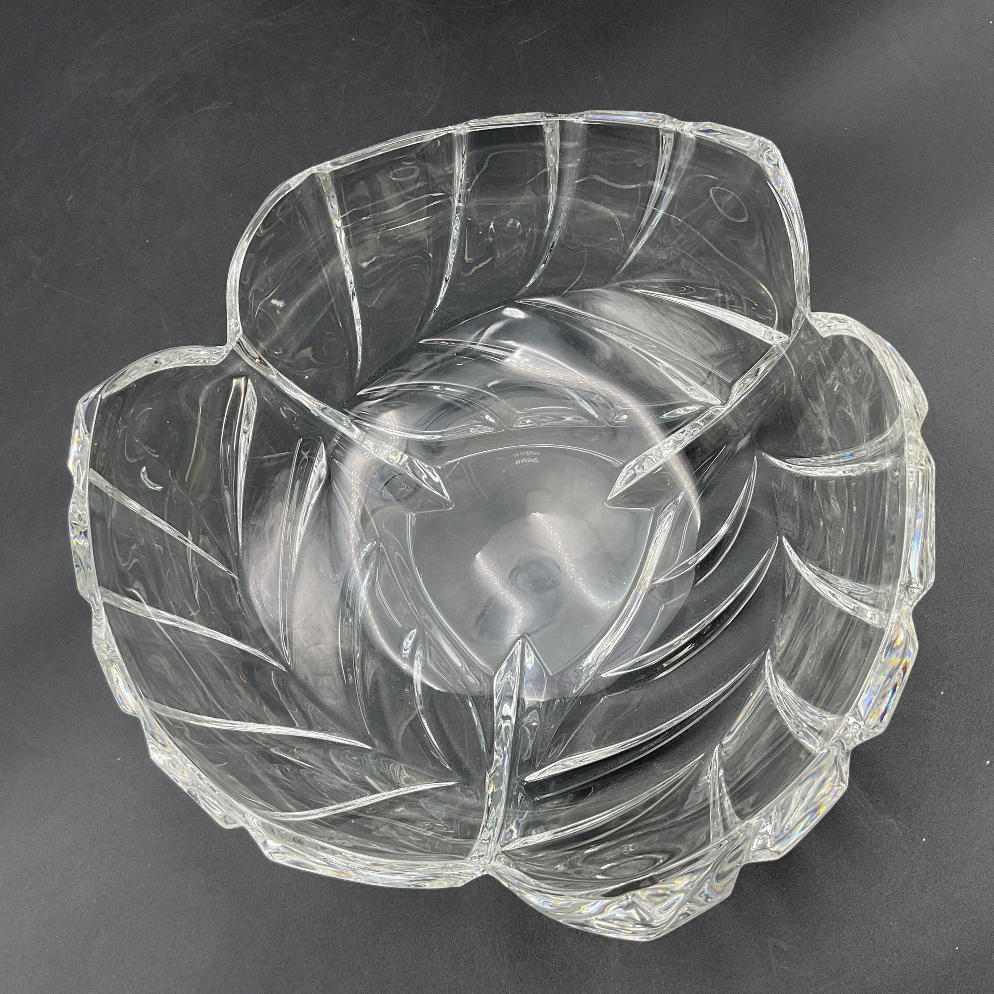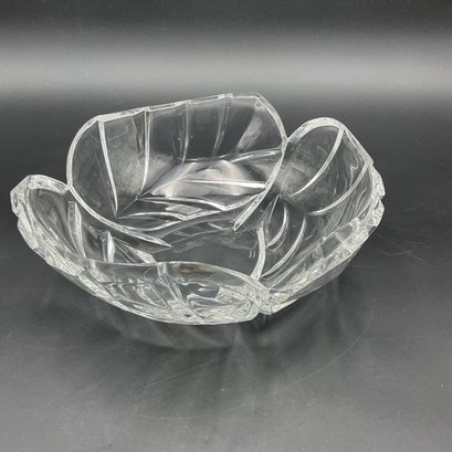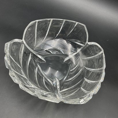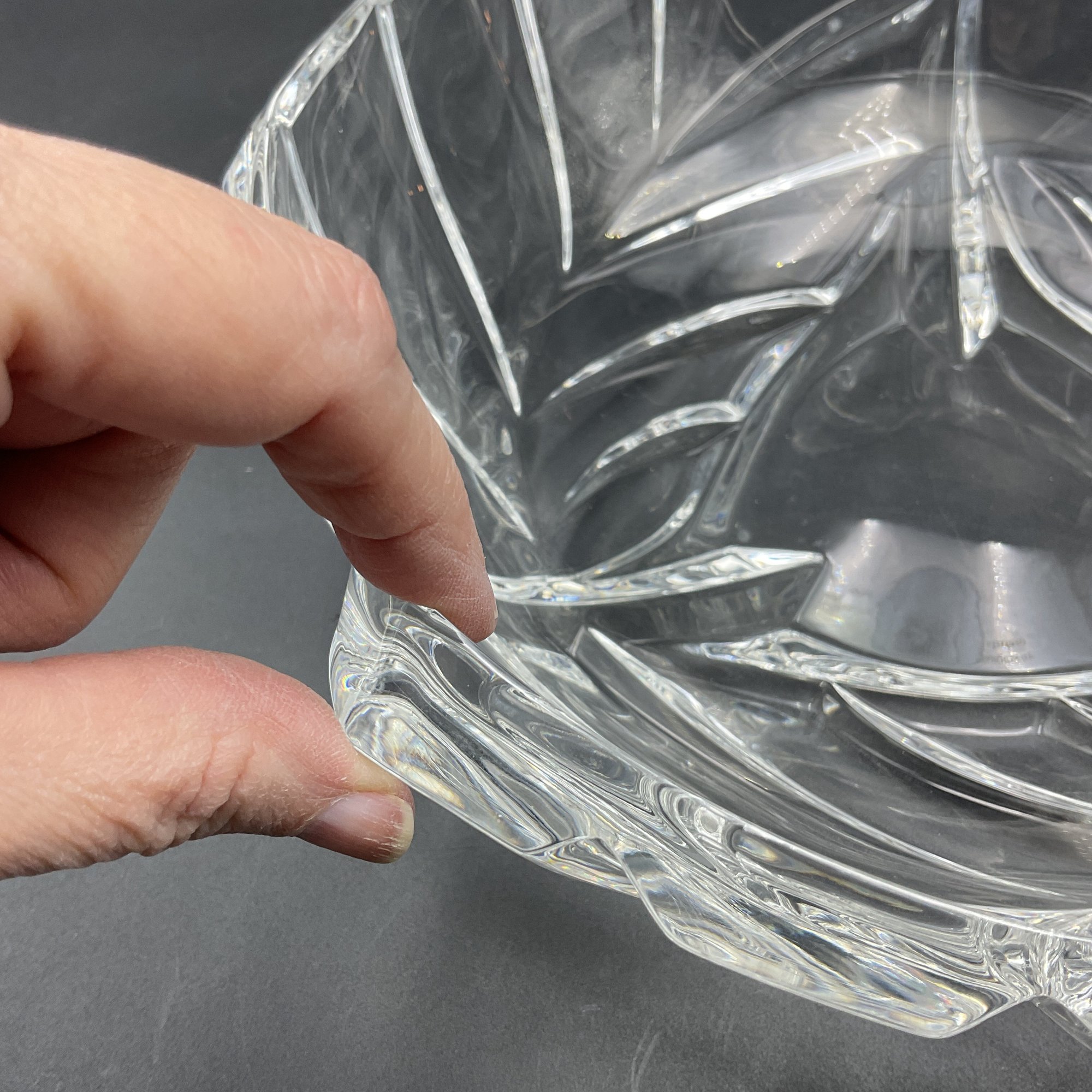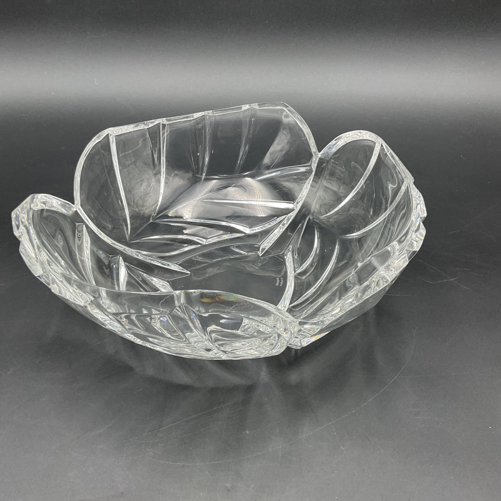 Beautiful and elegant heavy crystal bowl from Marquis by Waterford in the PALMA pattern. It features a distinctive leaf motif and three-sided design. This is the largest piece in the line and has a very thick crystal edge. This is in great condition but does have 2 tiny rim chips only discovered through a very close inspection (not seen visually). See photos.