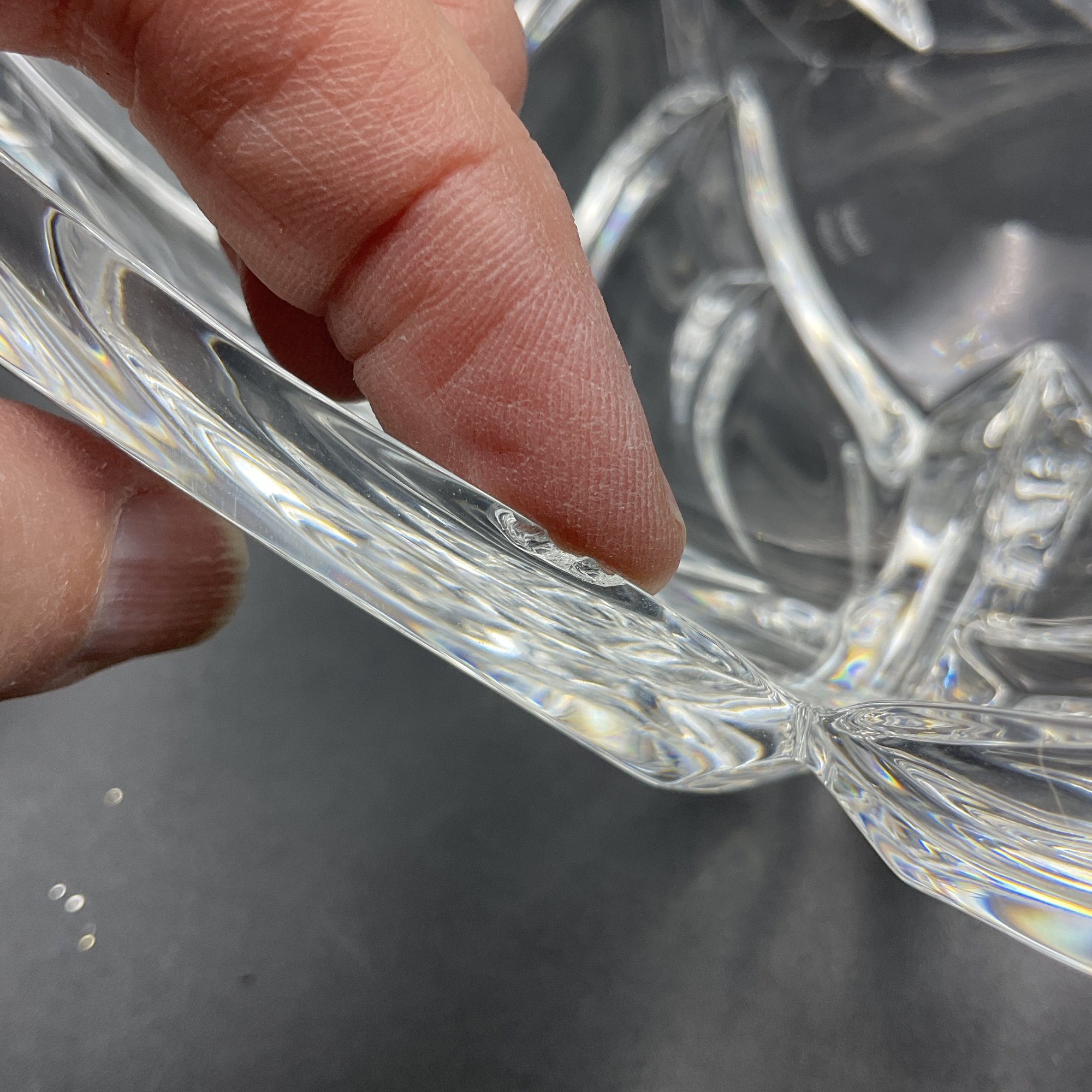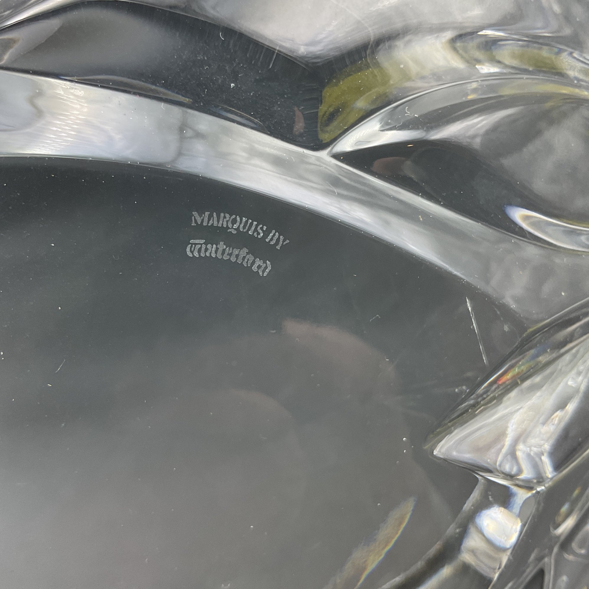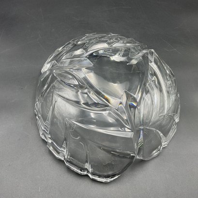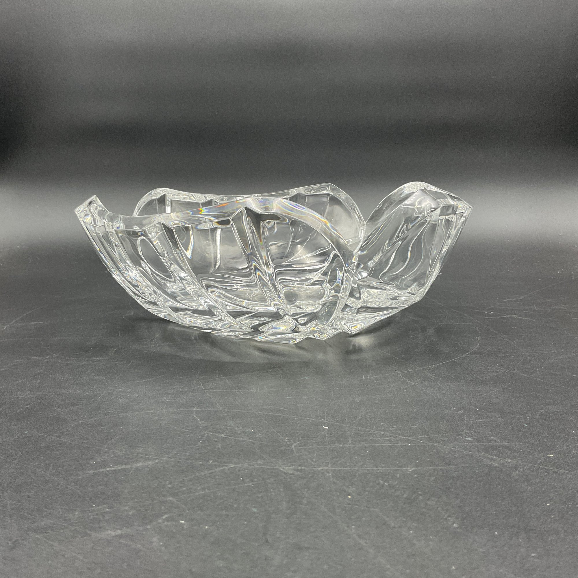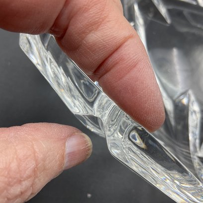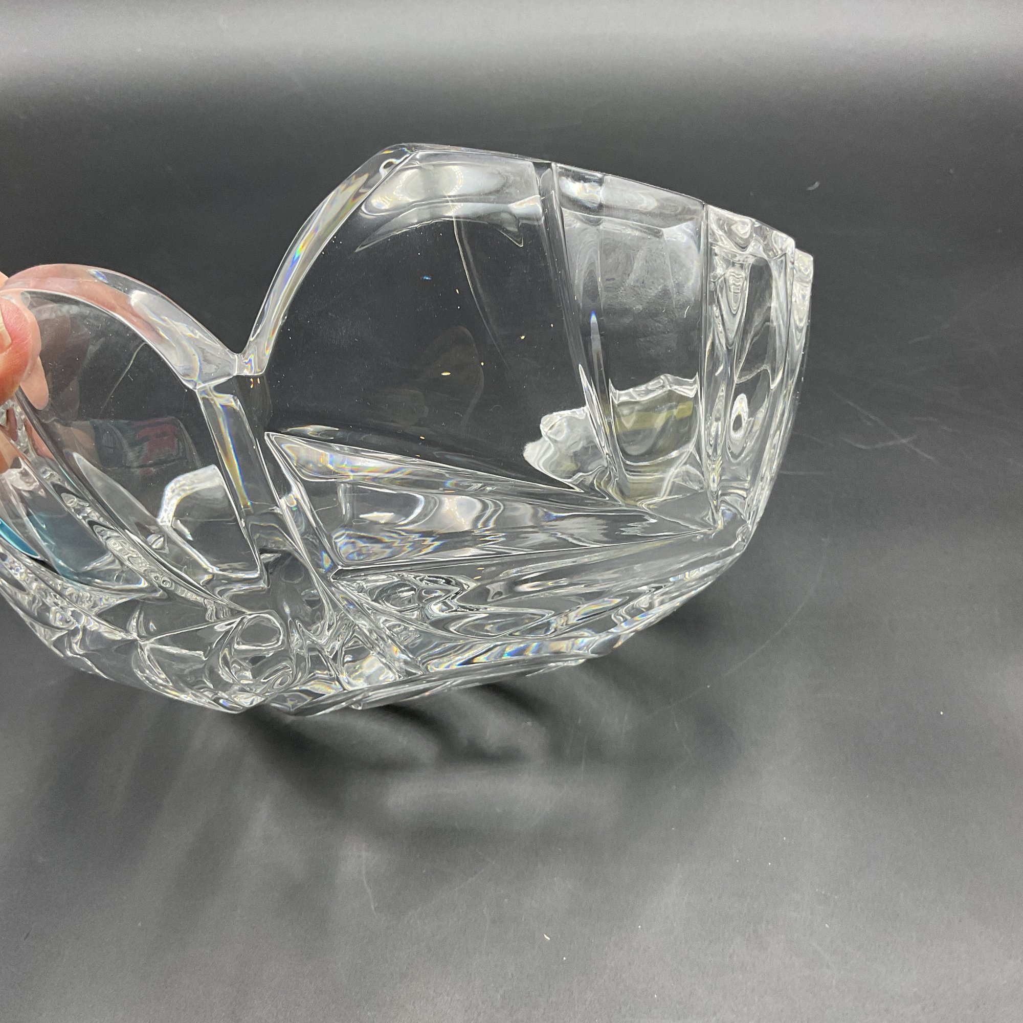 Beautiful and elegant heavy crystal bowl from Marquis by Waterford in the PALMA pattern. It features a distinctive leaf motif and three-sided design. This is the largest piece in the line and has a very thick crystal edge. This is in great condition but does have 2 tiny rim chips only discovered through a very close inspection (not seen visually). See photos.