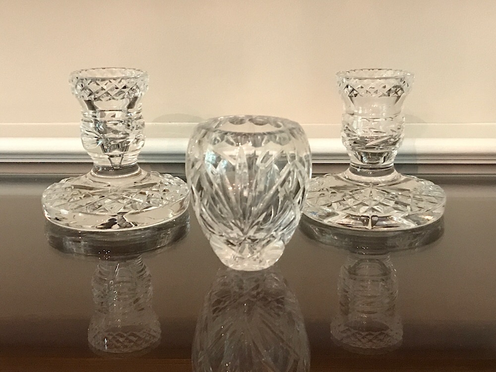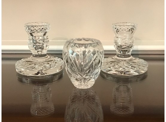 Pair of Waterford crystal candlesticks and small Waterford vase.