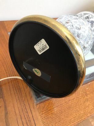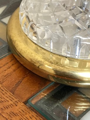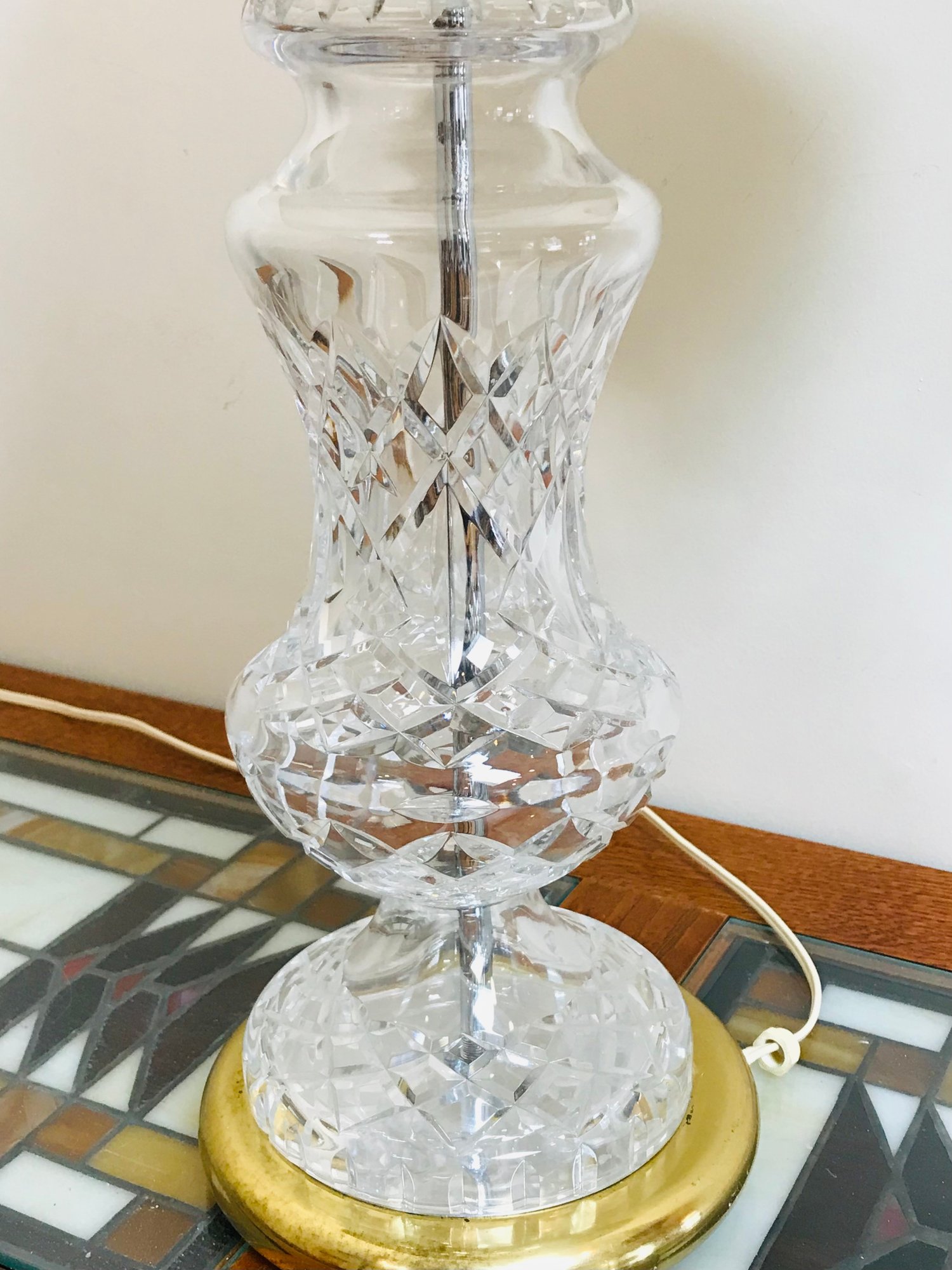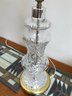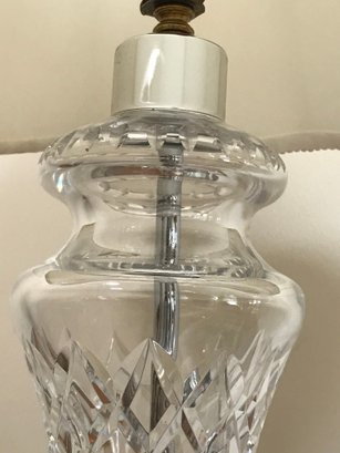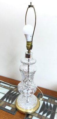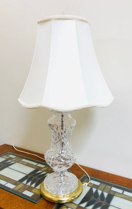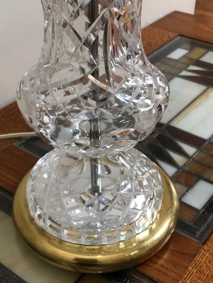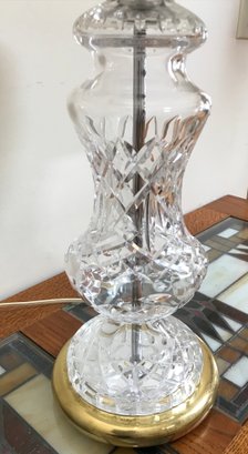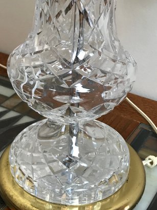 An elegant Waterford Crystal table lamp featuring the iconic Lismore pattern, known for its signature diamond and wedge cuts. The crystal body is set upon a polished brass-tone circular base. This piece retains the original green and gold seahorse "Waterford Crystal - Made in Ireland" sticker on the underside, along with a retail barcode label.