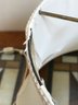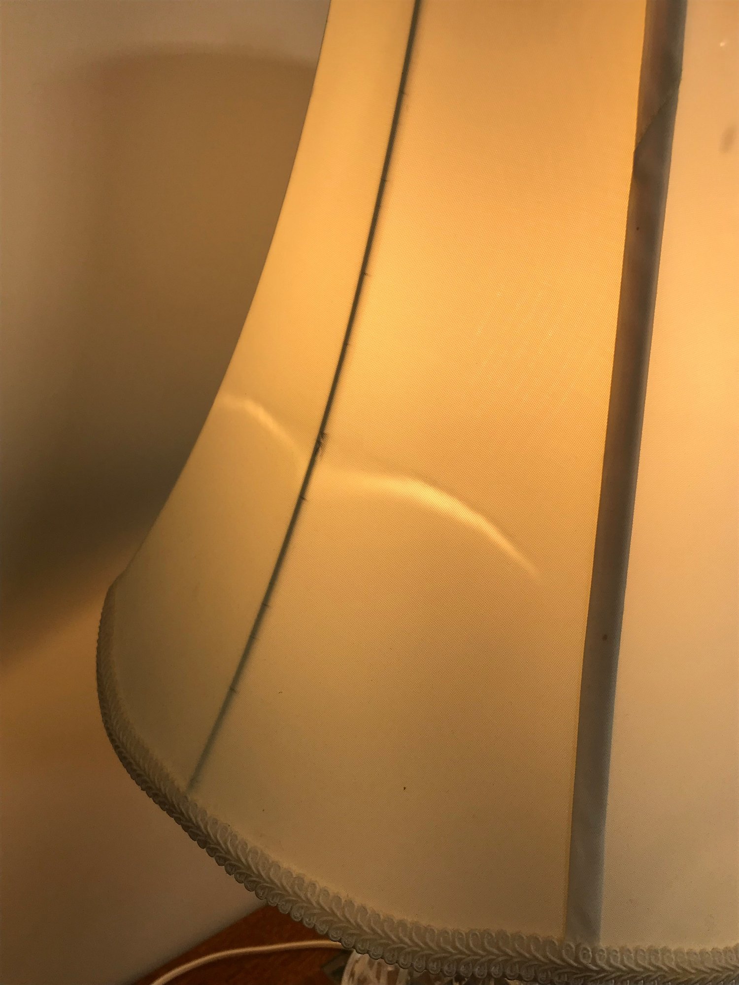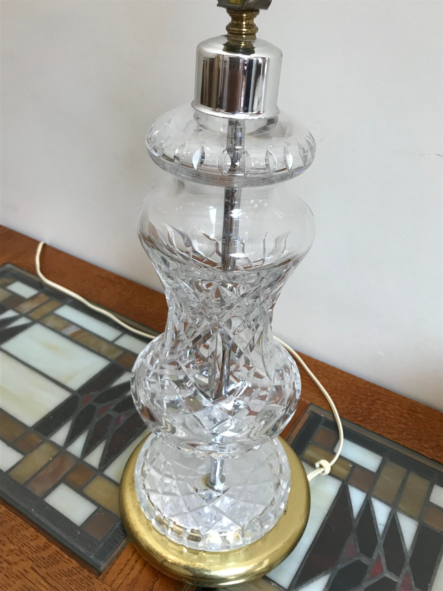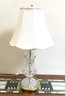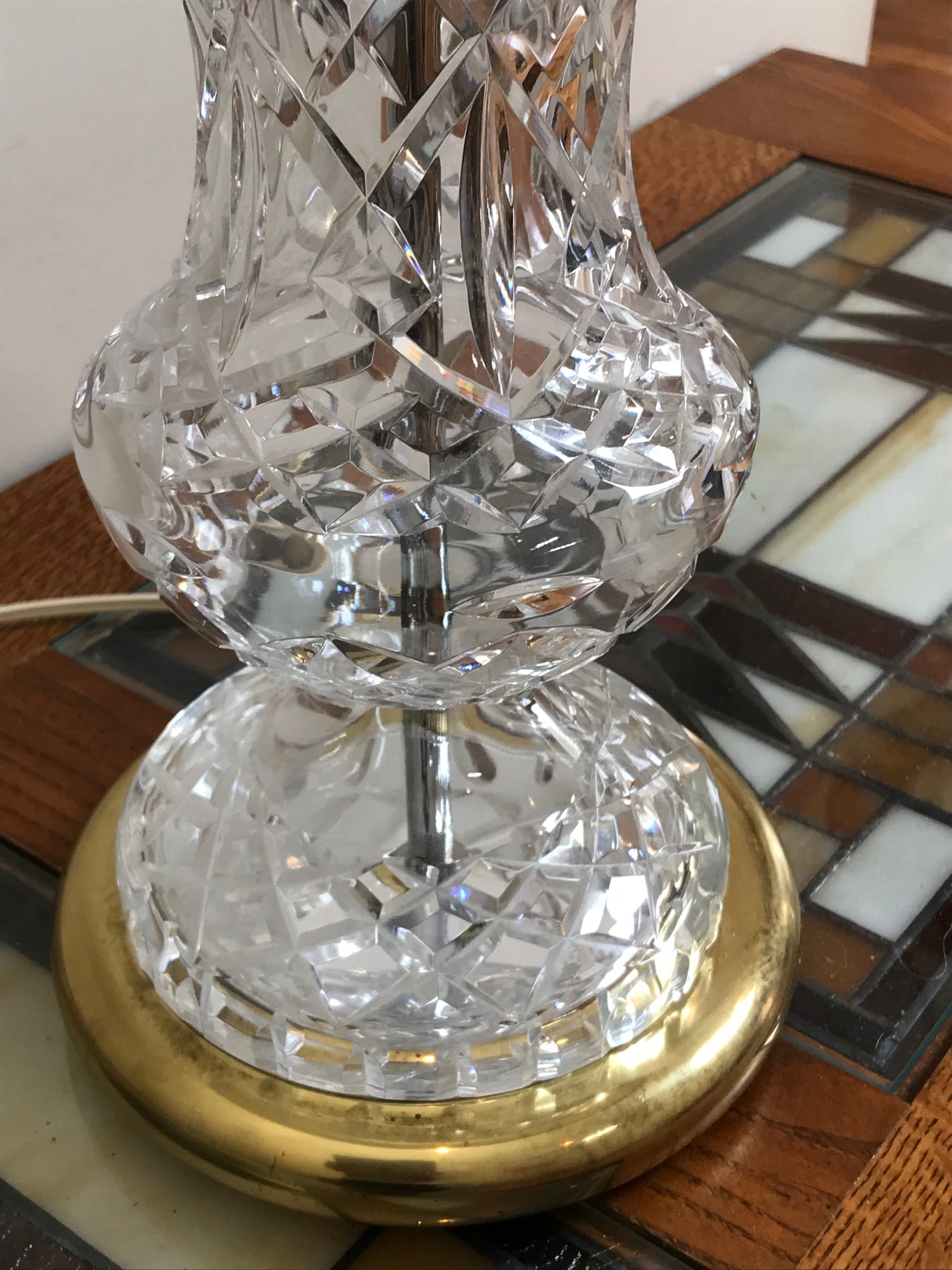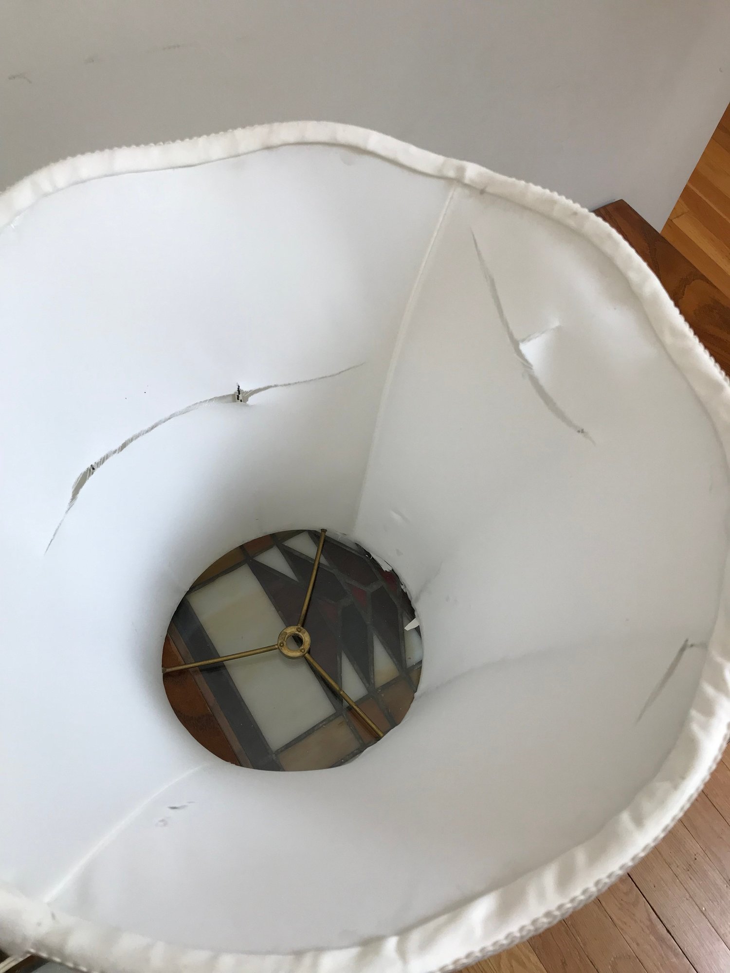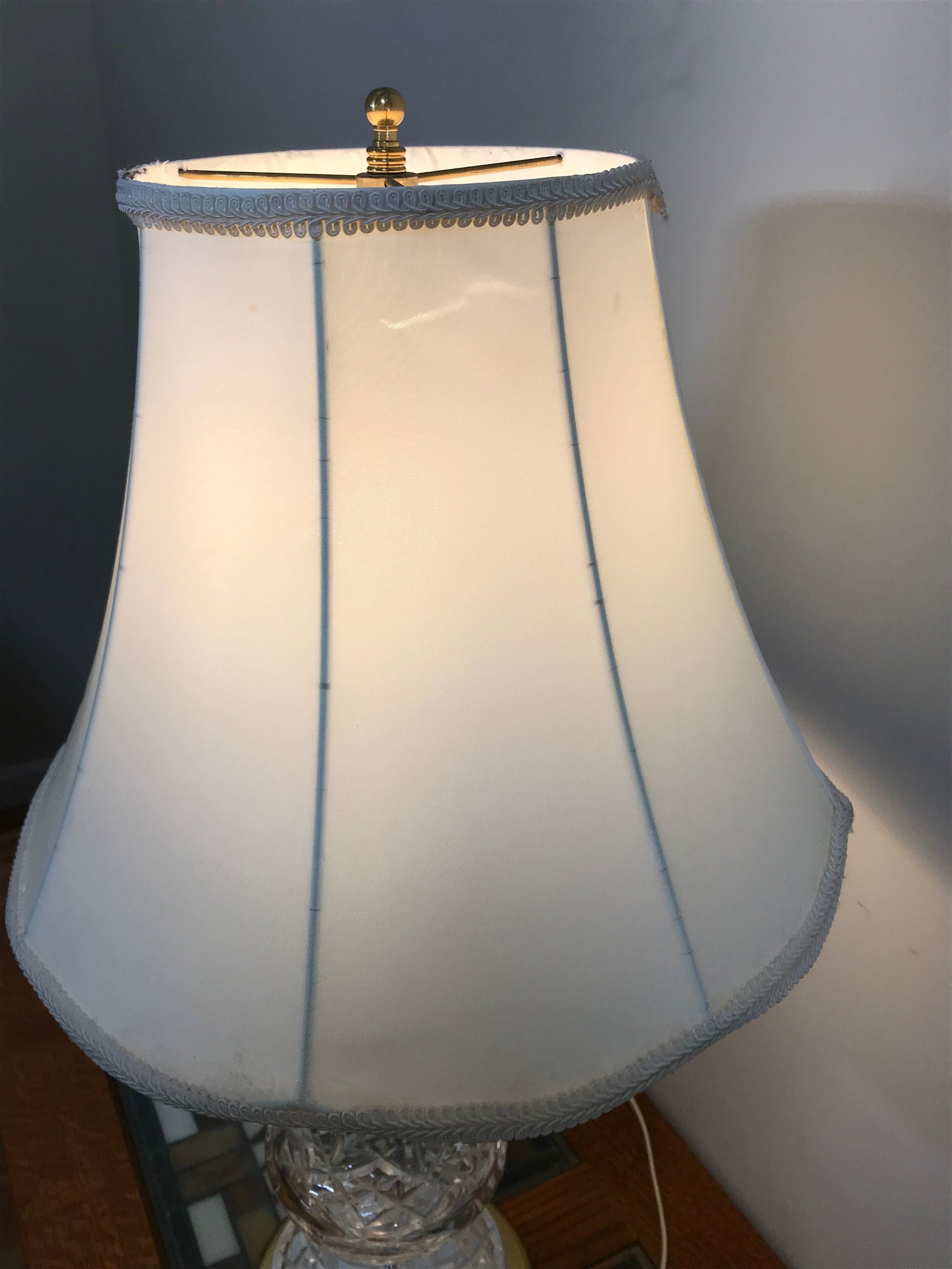 Condition: The crystal body and brass base appear to be in nice condition with minimal tarnishing. The white fabric bell shade shows significant wear, including several large tears to the inner lining and fraying along the edges (as pictured); it may require professional relining or replacement.