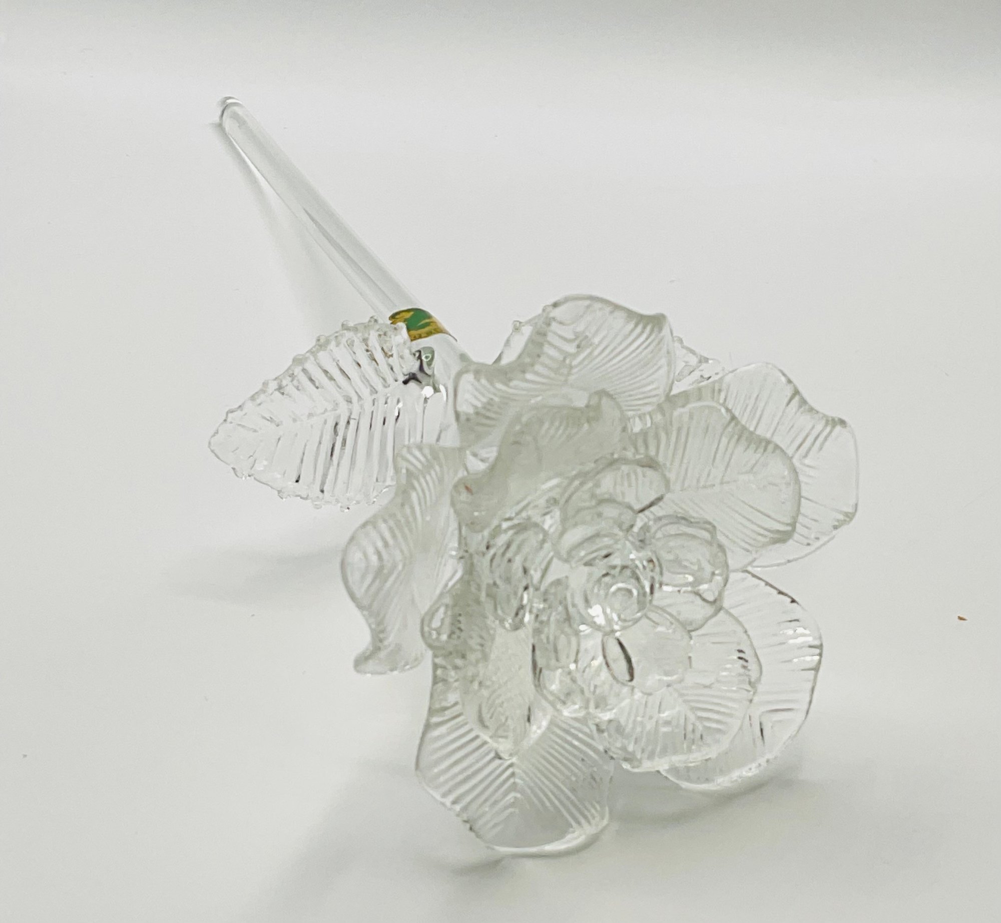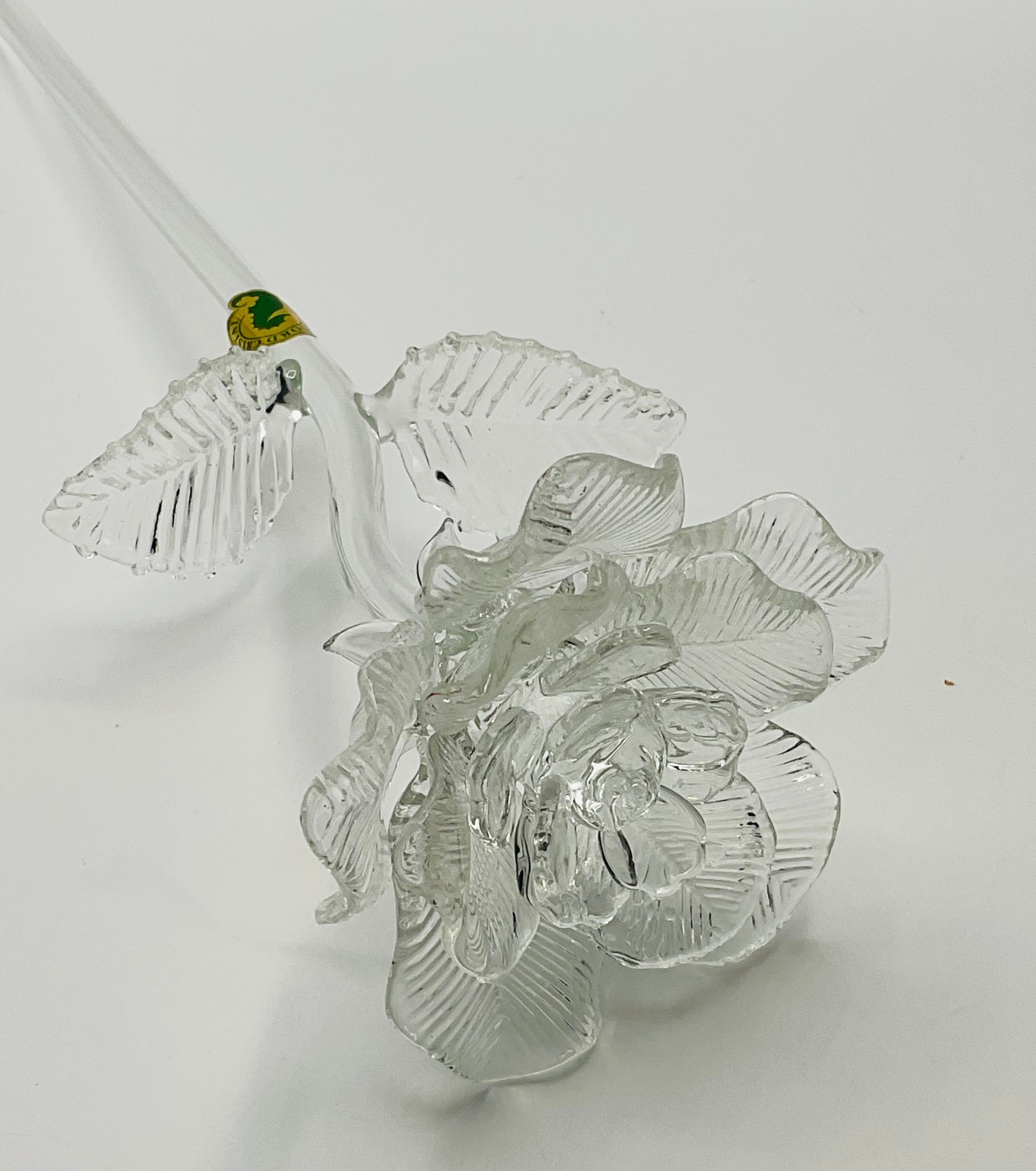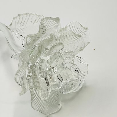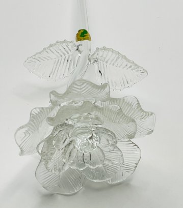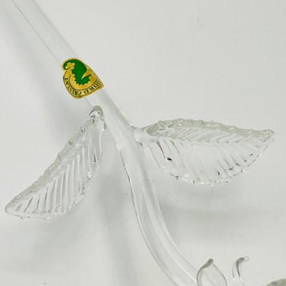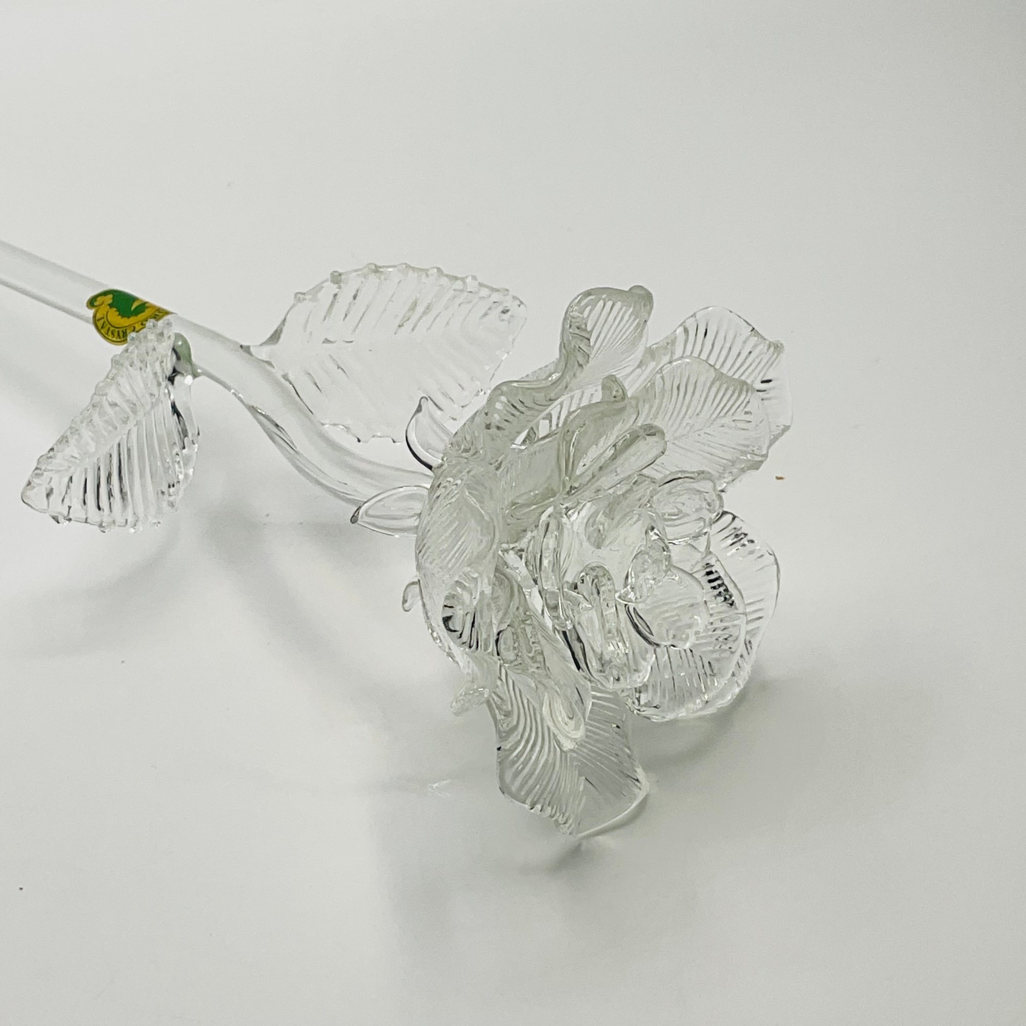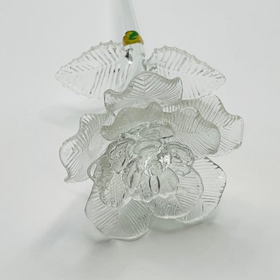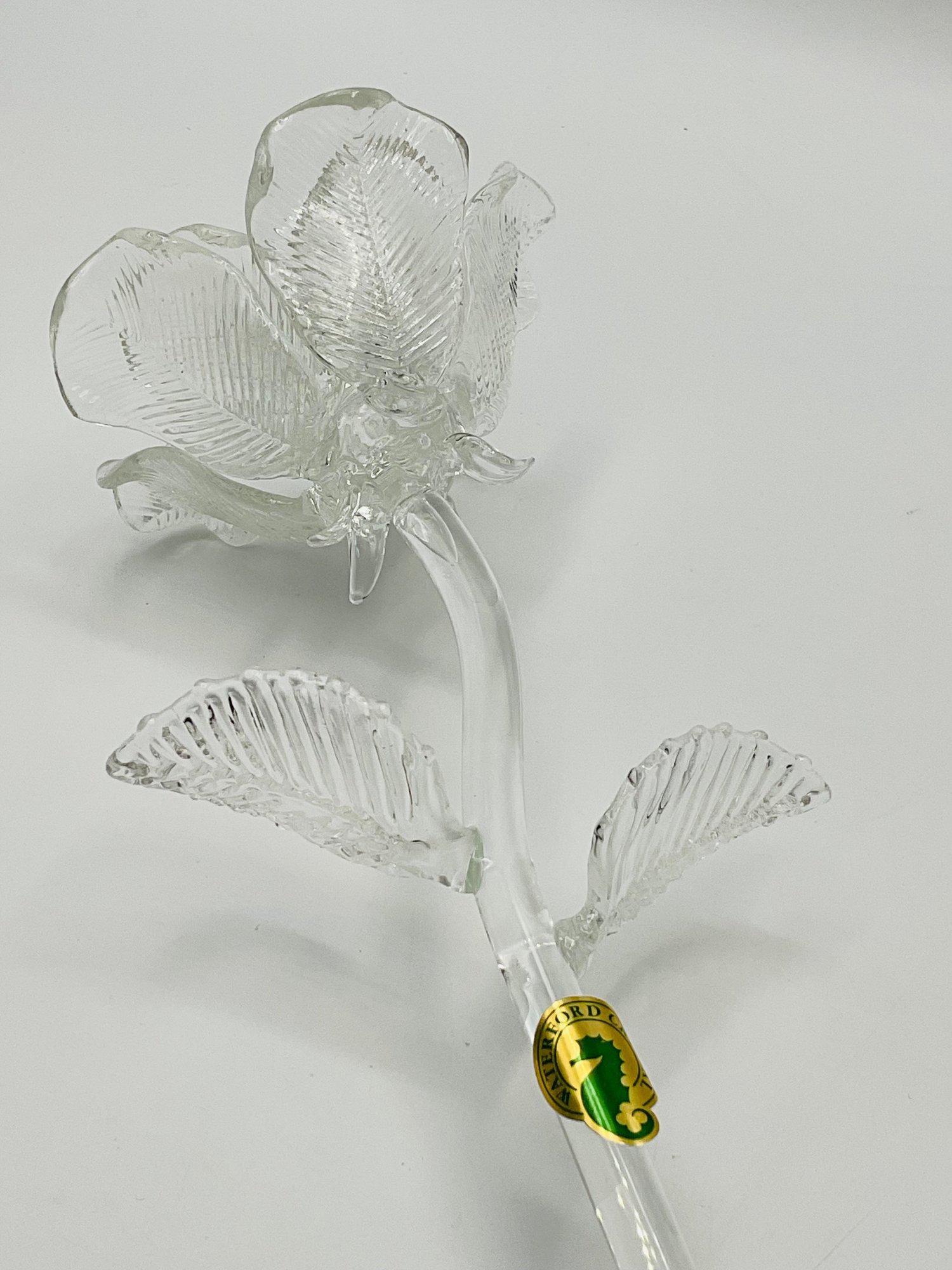 exquisite Waterford Crystal long-stemmed rose. A testament to fine craftsmanship, this piece features a beautifully detailed, multi-petaled bloom and delicate textured leaves, all masterfully crafted from clear, brilliant crystal.