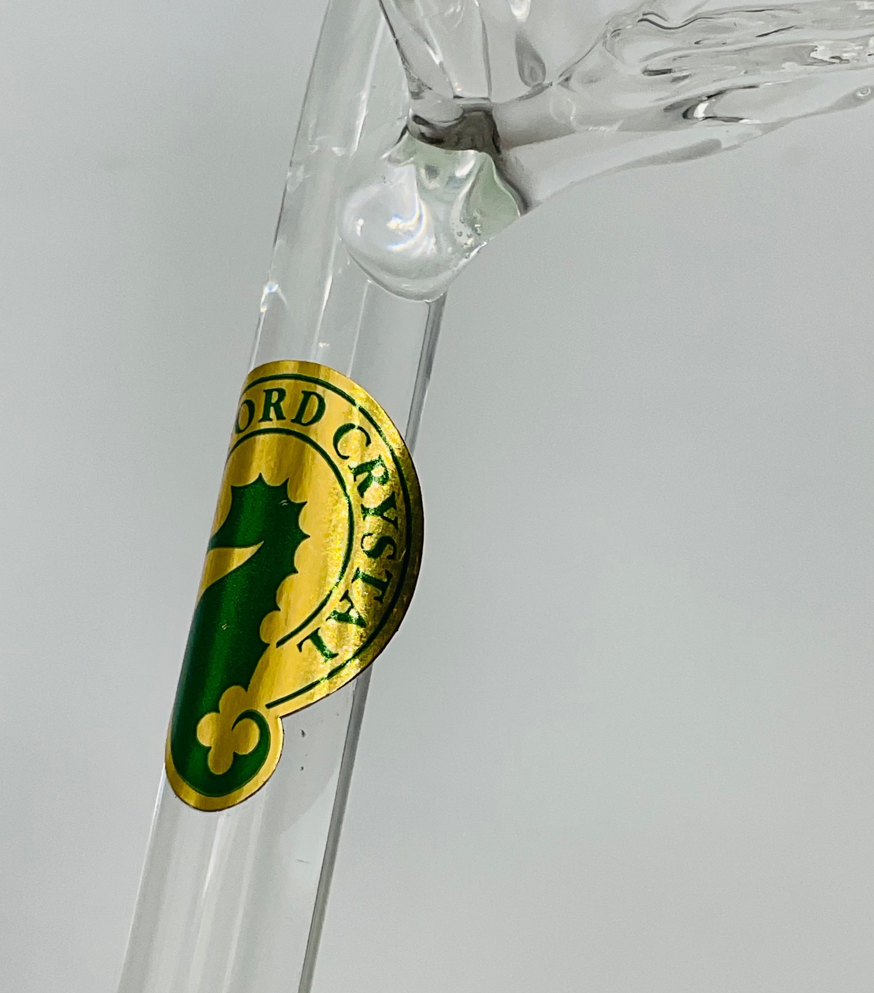 Brand: Waterford Crystal (Authentic green and gold seahorse decal attached to the stem).