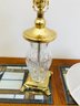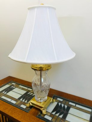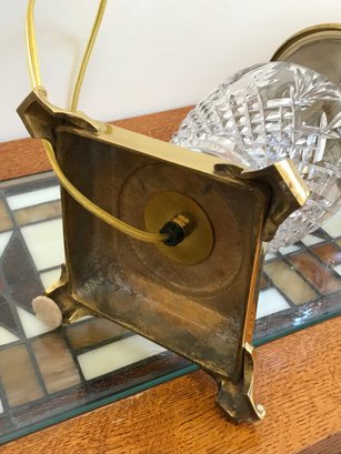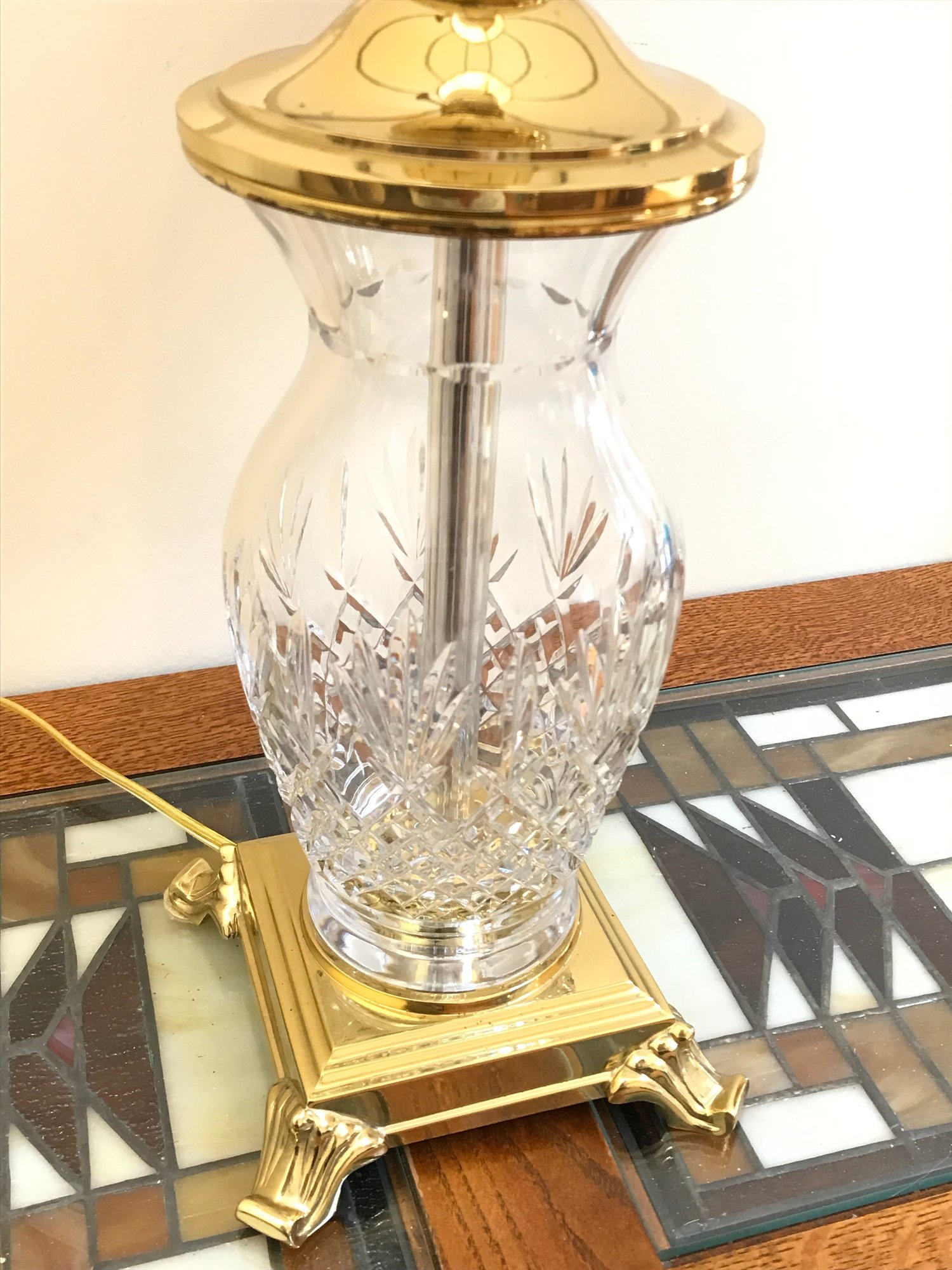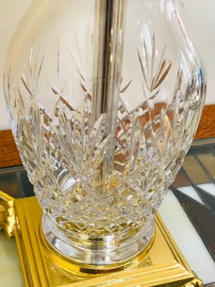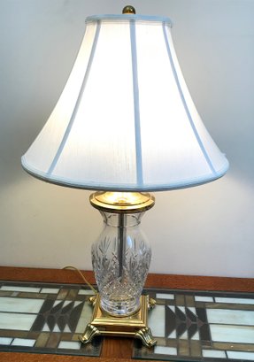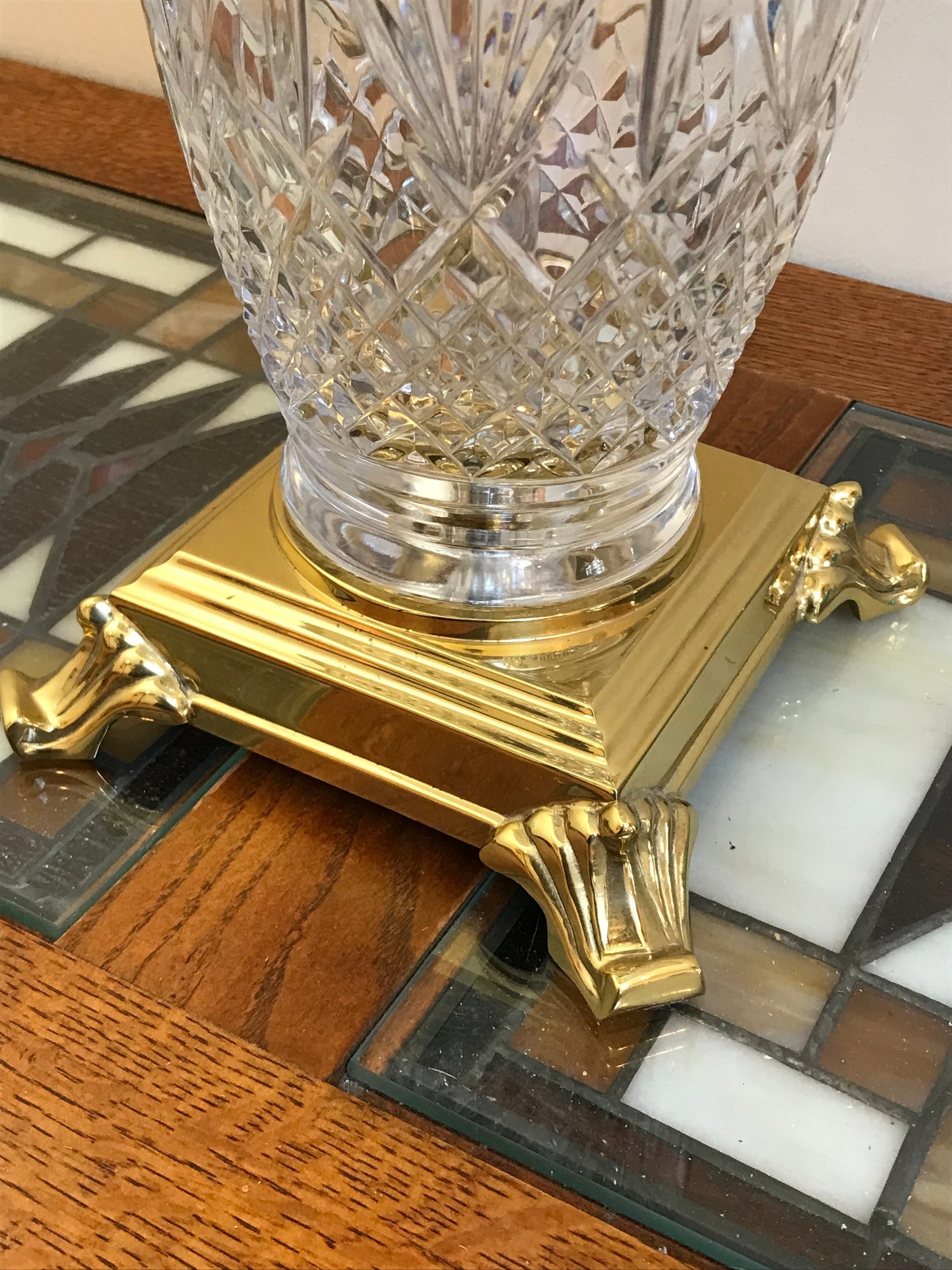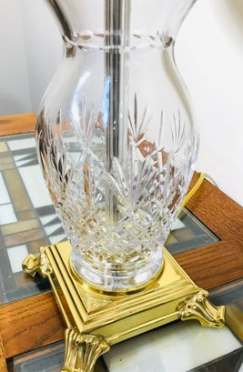 Elegant Waterford Crystal table lamp. This piece features a classic urn-shaped lead crystal body, intricately cut in a crosshatch and leaf pattern that beautifully captures and refracts light. The crystal is mounted on a heavy, polished brass square base accented with decorative scrolled feet.