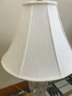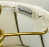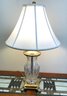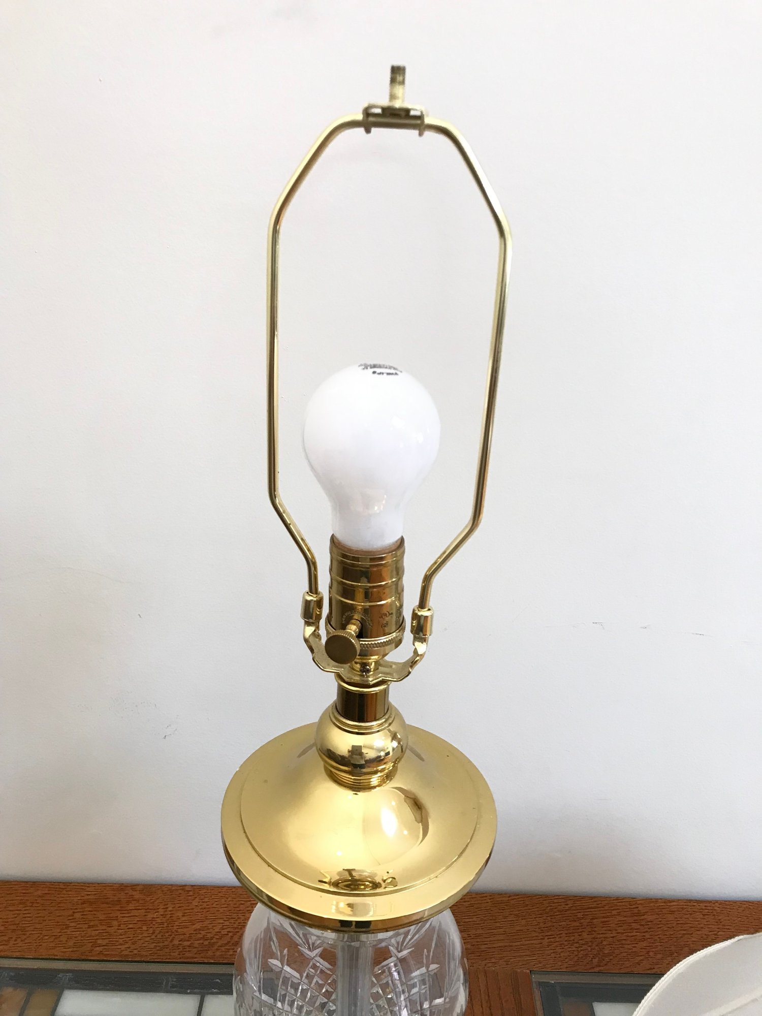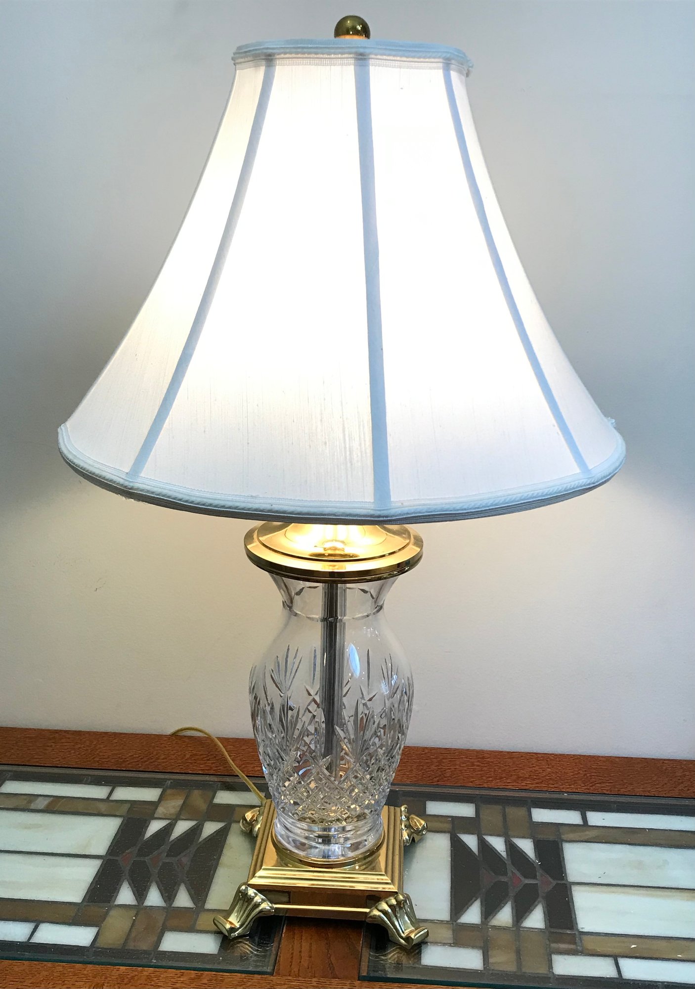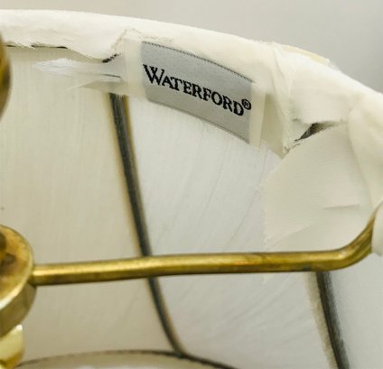 The lamp is crowned with its original Waterford branded silk-style shade, maintaining its authentic aesthetic and value. The acid-etched Waterford hallmark is visible on the crystal base, ensuring its provenance as a high-quality Irish heritage piece.