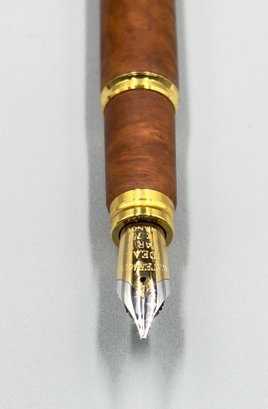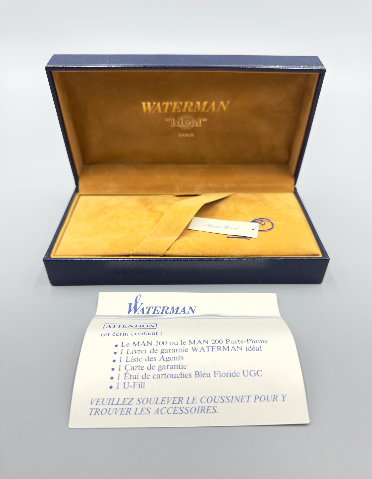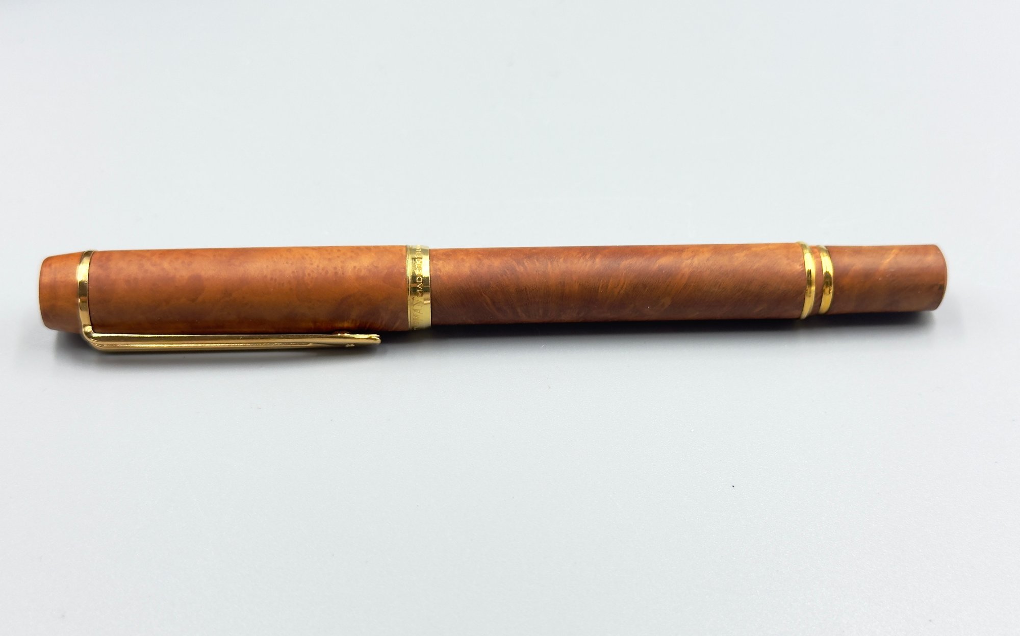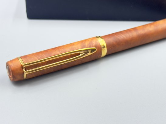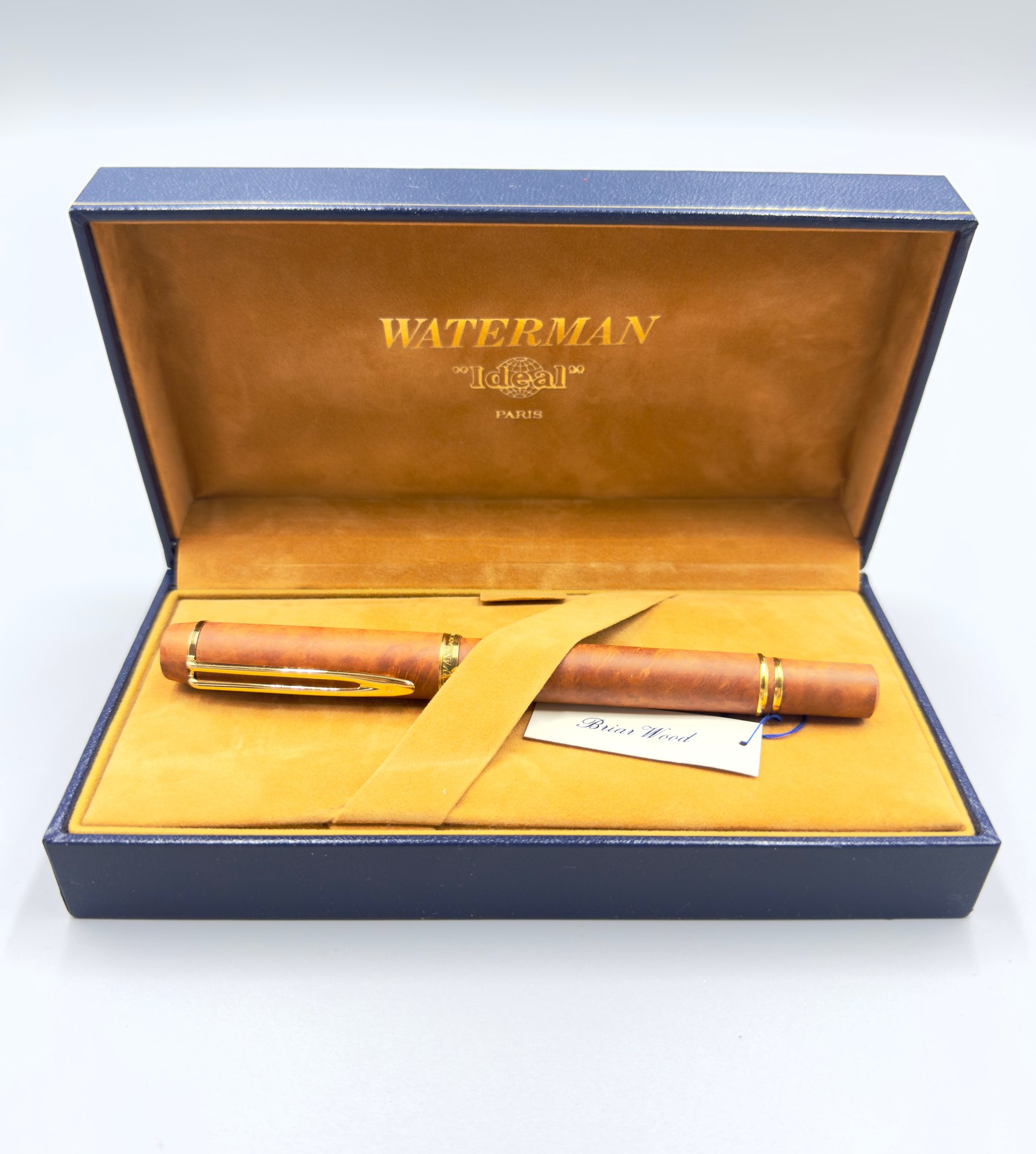 Write in handsome style with this Le Man 100 Fontainebleau, "Briar Wood" fountain pen by Waterman, France. This was the top of the line for Waterman in the 1980s, a heavy large pen. This version was released for a limited time in 1987. The color is a rich orange brown cap and barrel made of briarwood with a matte finish with gold plated trim.