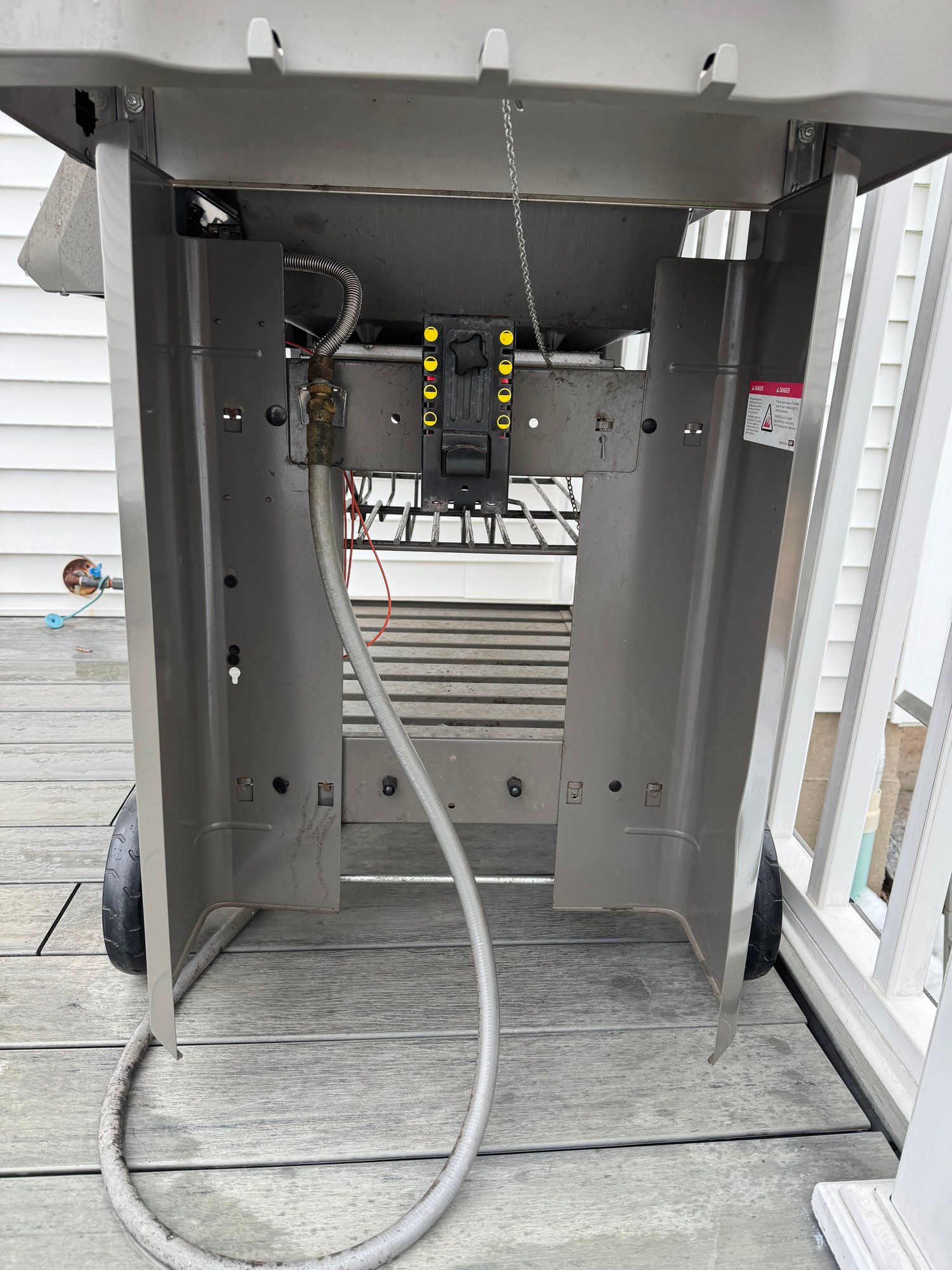The inside will need a bit of cleaning due to use but it has been tested and all burners are working well. It comes with a protective cover and measures approximately 60” wide, 46” tall and 27.5” deep.