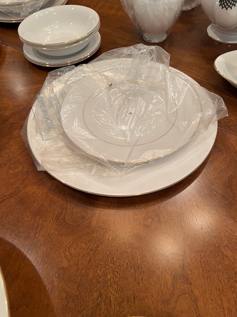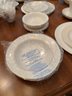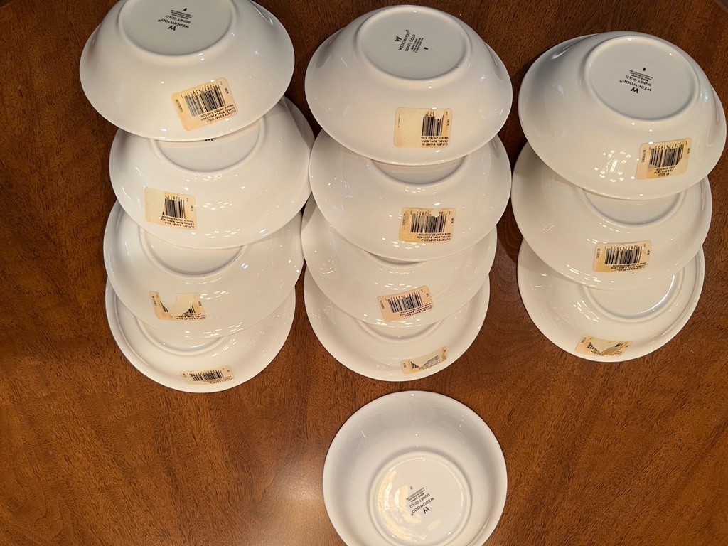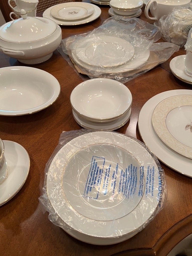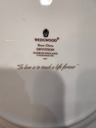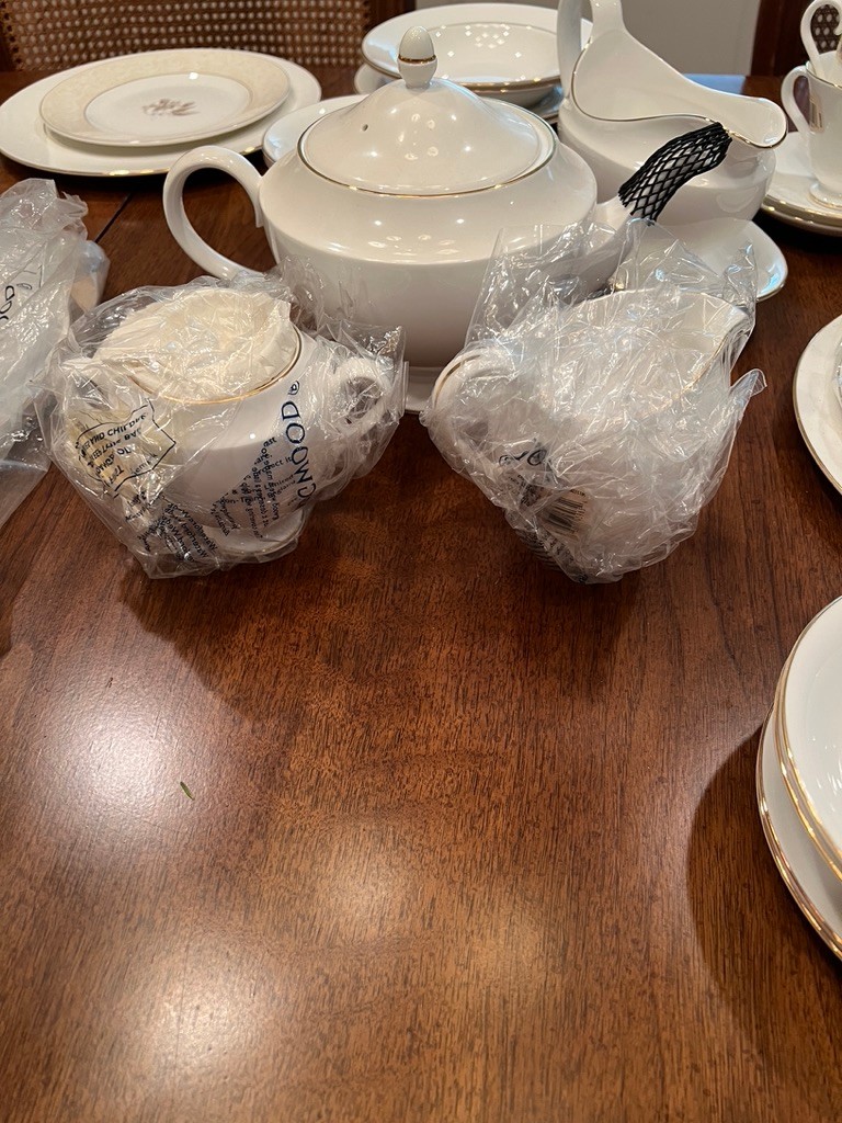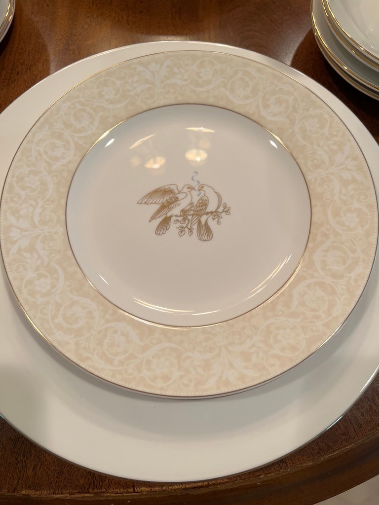 Spectacular, how classic, well defined, elegant, oozing with love and future memories, this set has 9 out of 10 pieces, STILL WITH TAGS! And, in the Wedgewood bags, the Cream & Sugar is still in the box, and plastic bags! Traditional, never outdated, simple elegance, includes 8 dinner plates, 8 devotion with love doves, plates, 14 salad/luncheon plates, 12 cereal/dessert bowls, 15 bread & butter plates, 13 sets of cup & saucer, 3 oval open serving dishes, 2 double tier serving plates,( missing the metal holders, 1 lge round covered casserole, 1 gravy boat w/under plate, 1 teapot, 1 set of cream & sugar