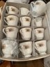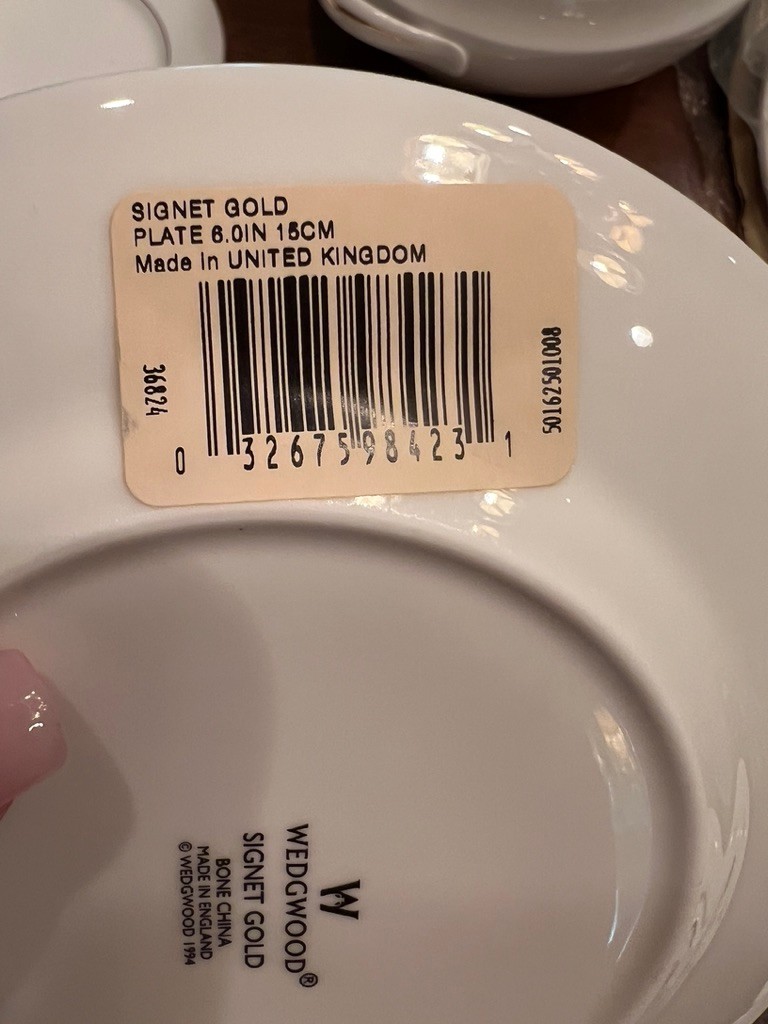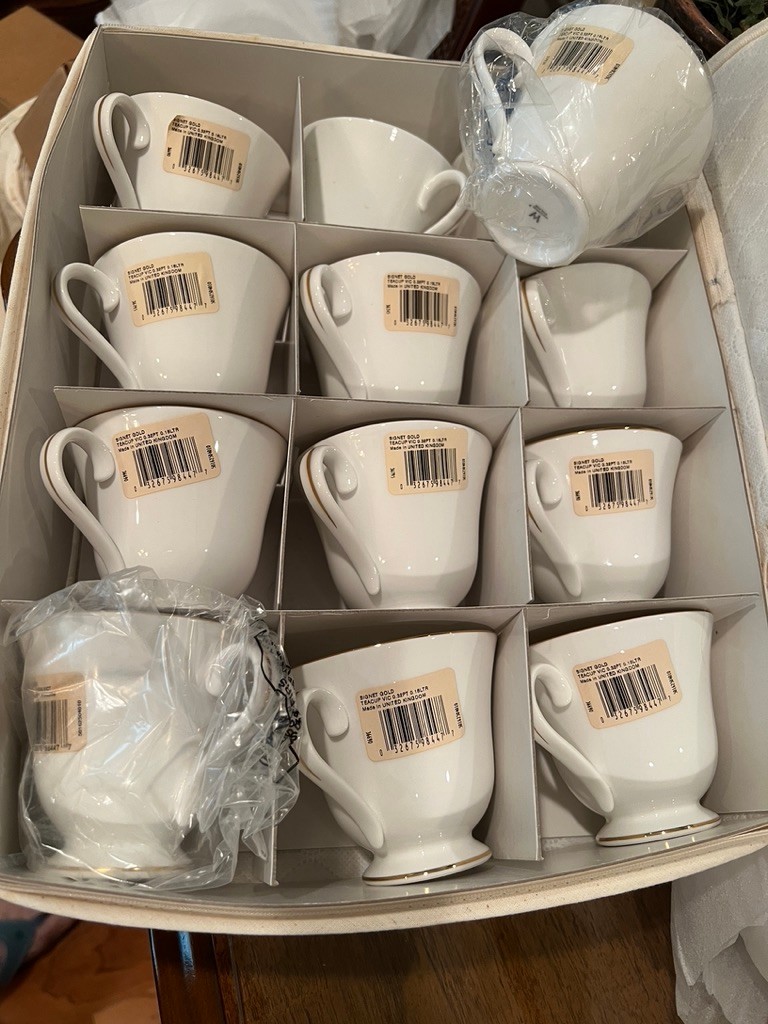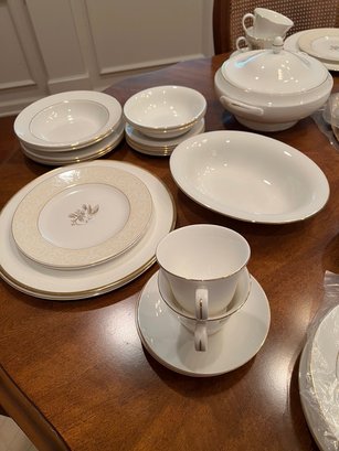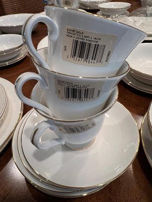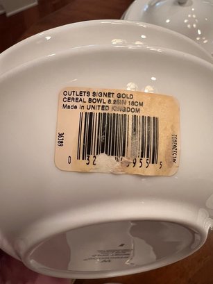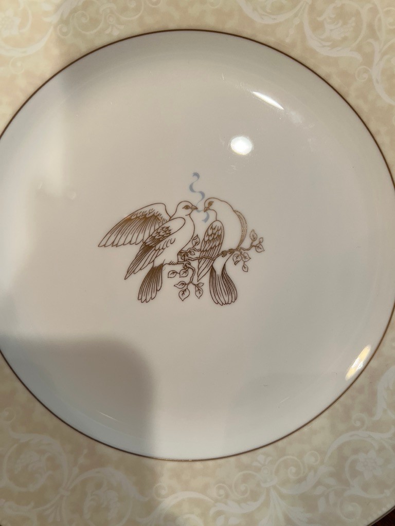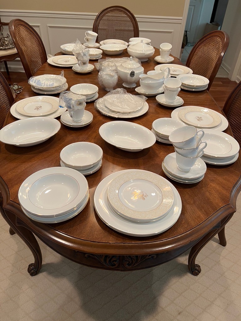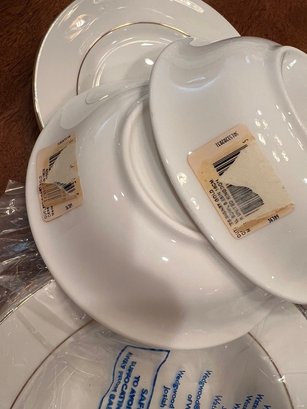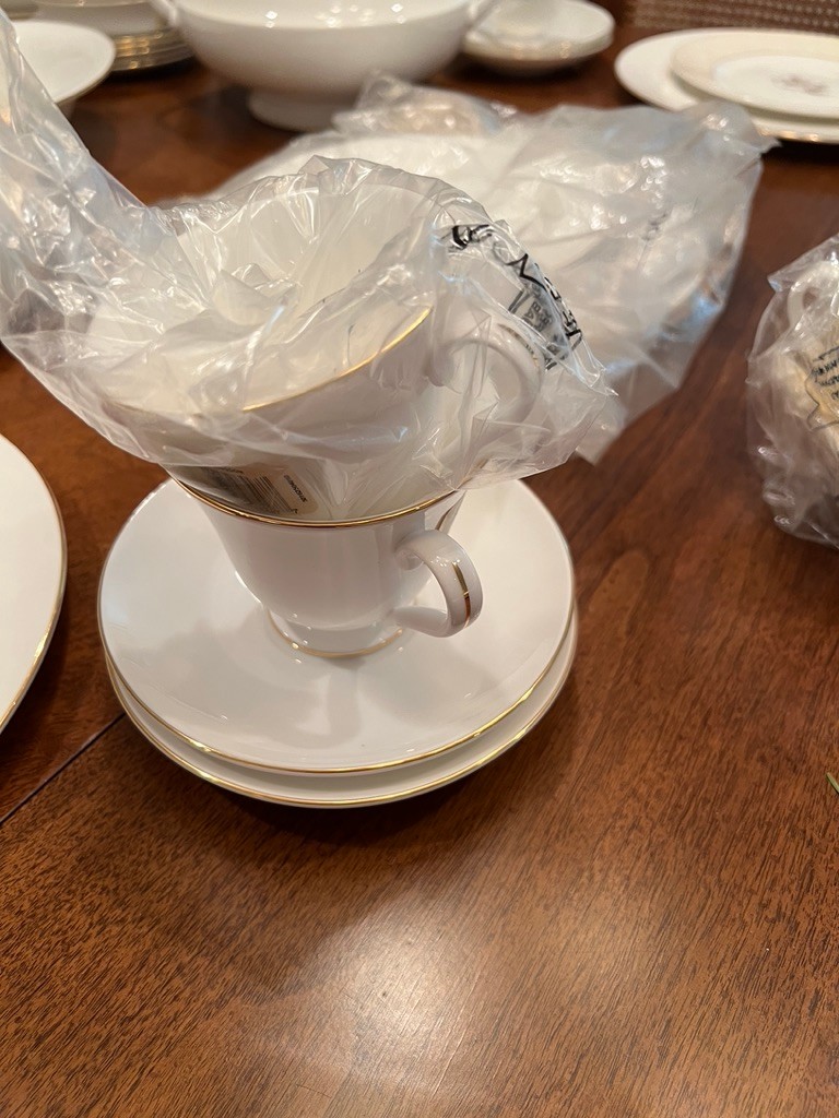 Spectacular, how classic, well defined, elegant, oozing with love and future memories, this set has 9 out of 10 pieces, STILL WITH TAGS! And, in the Wedgewood bags, the Cream & Sugar is still in the box, and plastic bags! Traditional, never outdated, simple elegance, includes 8 dinner plates, 8 devotion with love doves, plates, 14 salad/luncheon plates, 12 cereal/dessert bowls, 15 bread & butter plates, 13 sets of cup & saucer, 3 oval open serving dishes, 2 double tier serving plates,( missing the metal holders, 1 lge round covered casserole, 1 gravy boat w/under plate, 1 teapot, 1 set of cream & sugar