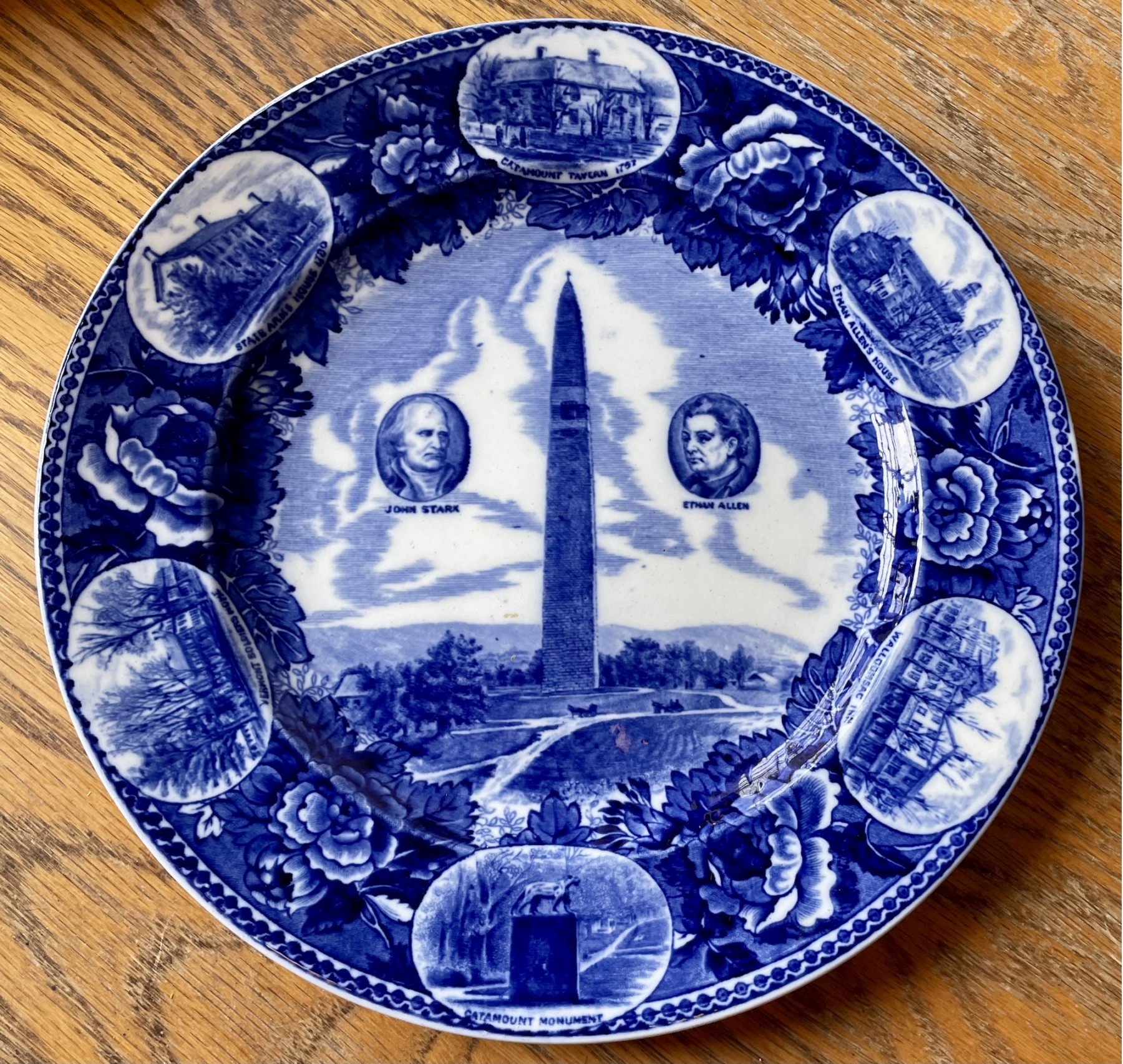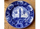 A lovely Wedgwood pottery blue & white plate. The plate is 9 3/4" in diameter and shows six different historic sites in Bennington, Vt. It also has General John Stark and Ethan Allen on either side of the Bennington Battle Monument. The plate is in excellent condition and has an impressed Wedgwood mark.