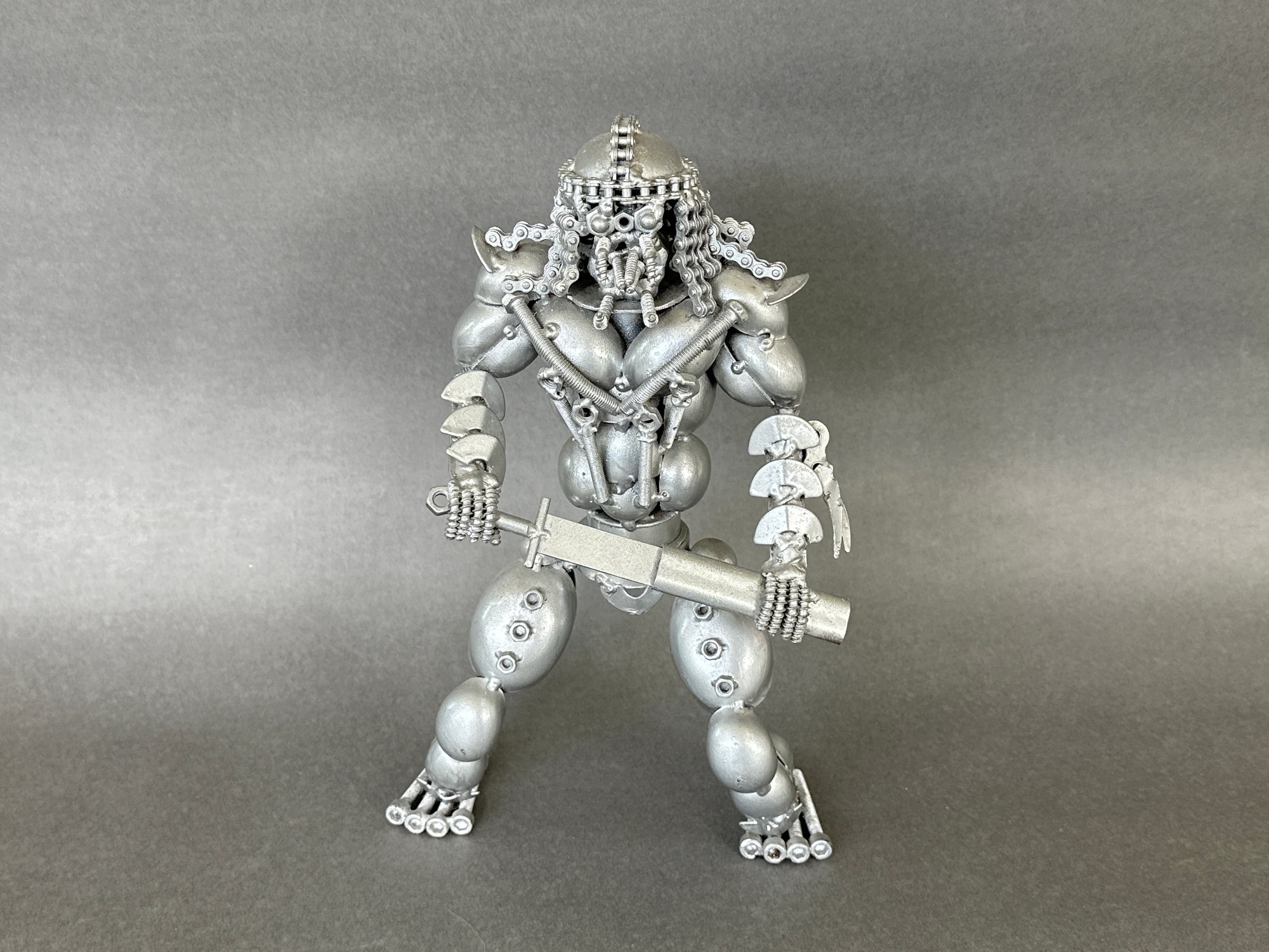 A welded metal ”Predator” figure, purchased in Dubai. This is a heavy weighted figure with tons of character. It is in good condition.