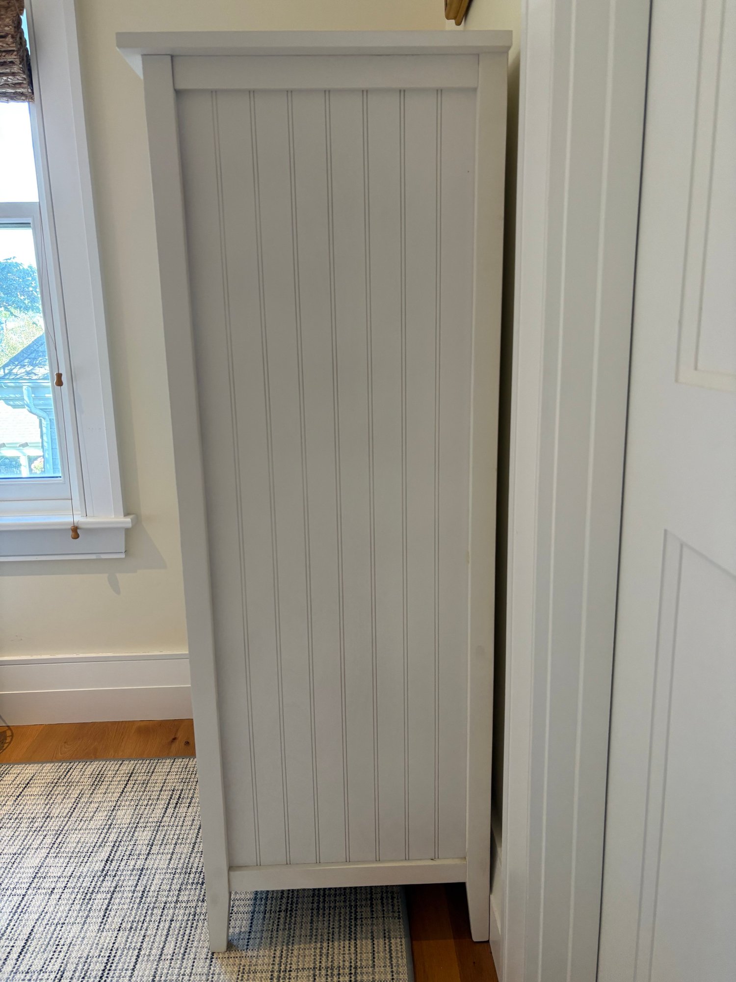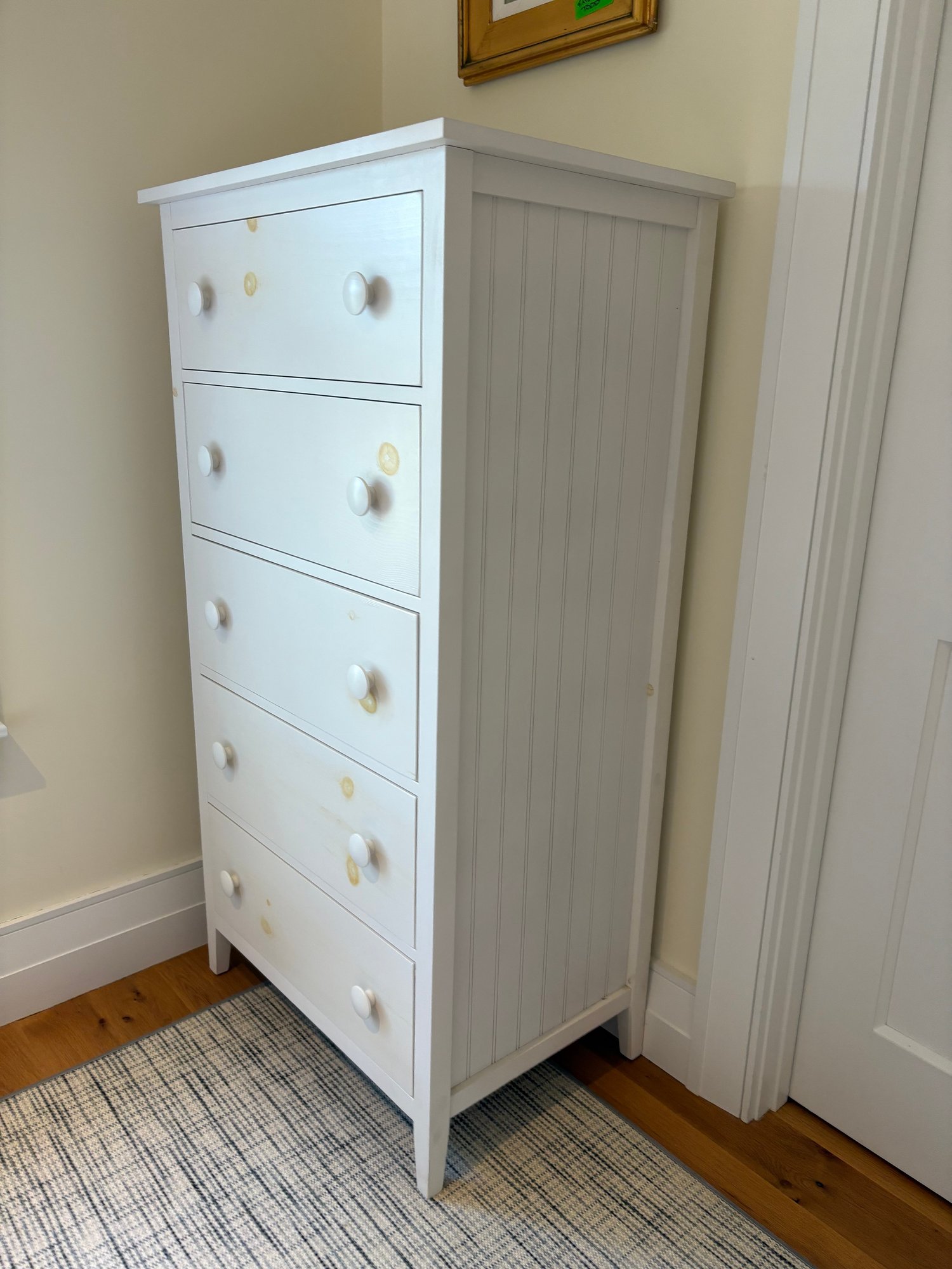 This white painted well-made solid wood five (5) drawer dresser features simple, round knobs on each drawer and a clean, minimalist design.