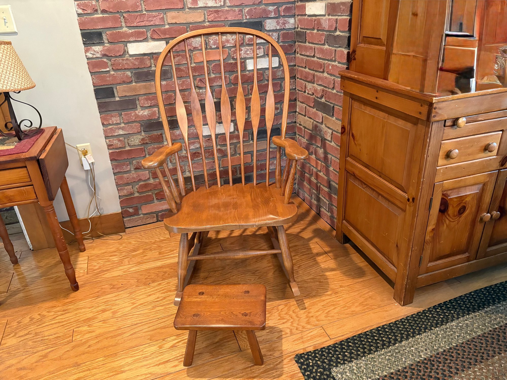 Vintage oak wood Windsor style rocking chair, featuring a high back with vertical spindles and a contoured seat. Made in Slovenia.