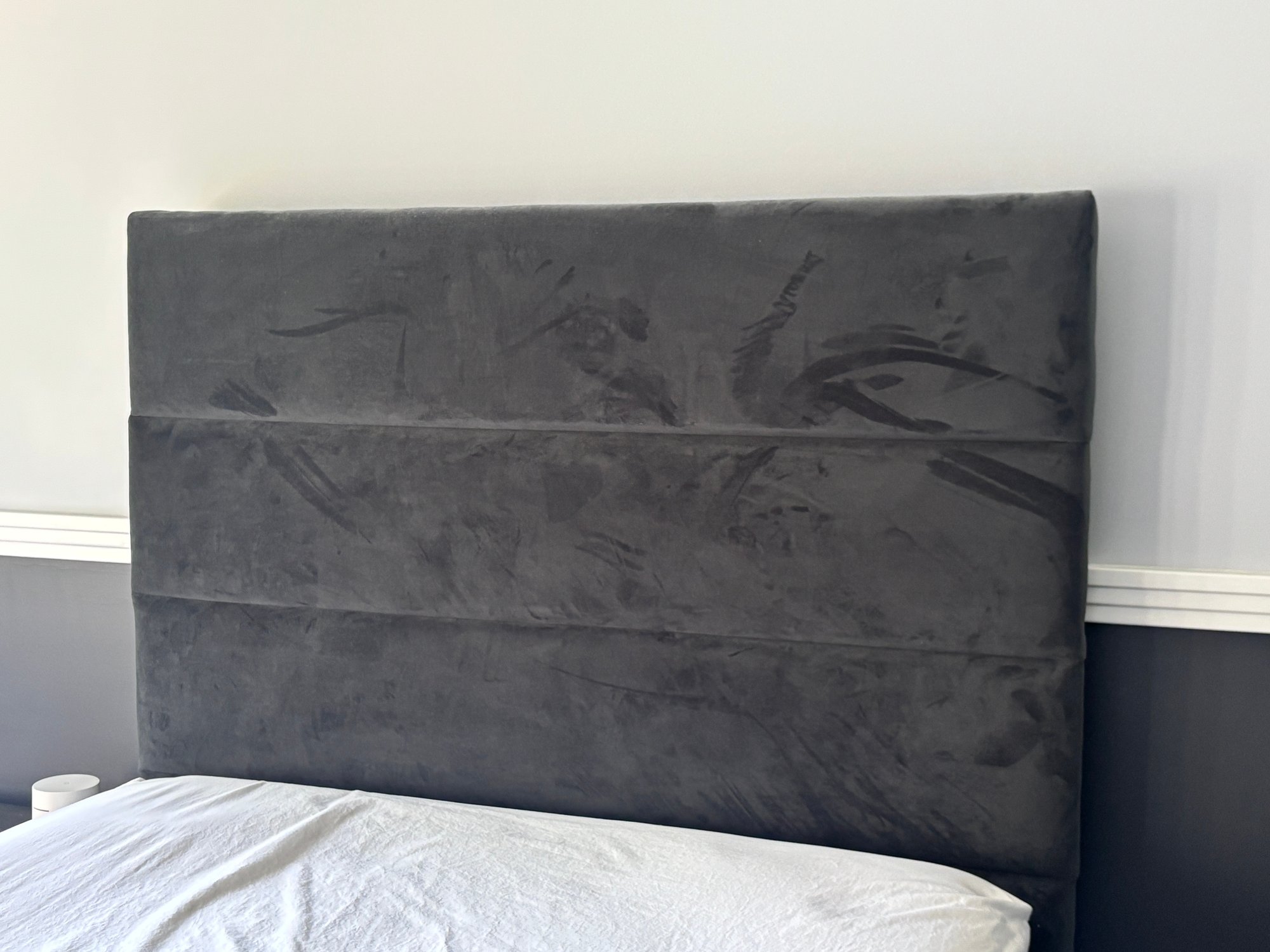 Gorgeous blue velvet, West Elm Velvet Upholstered headboard with metal frame. Can include mattress.