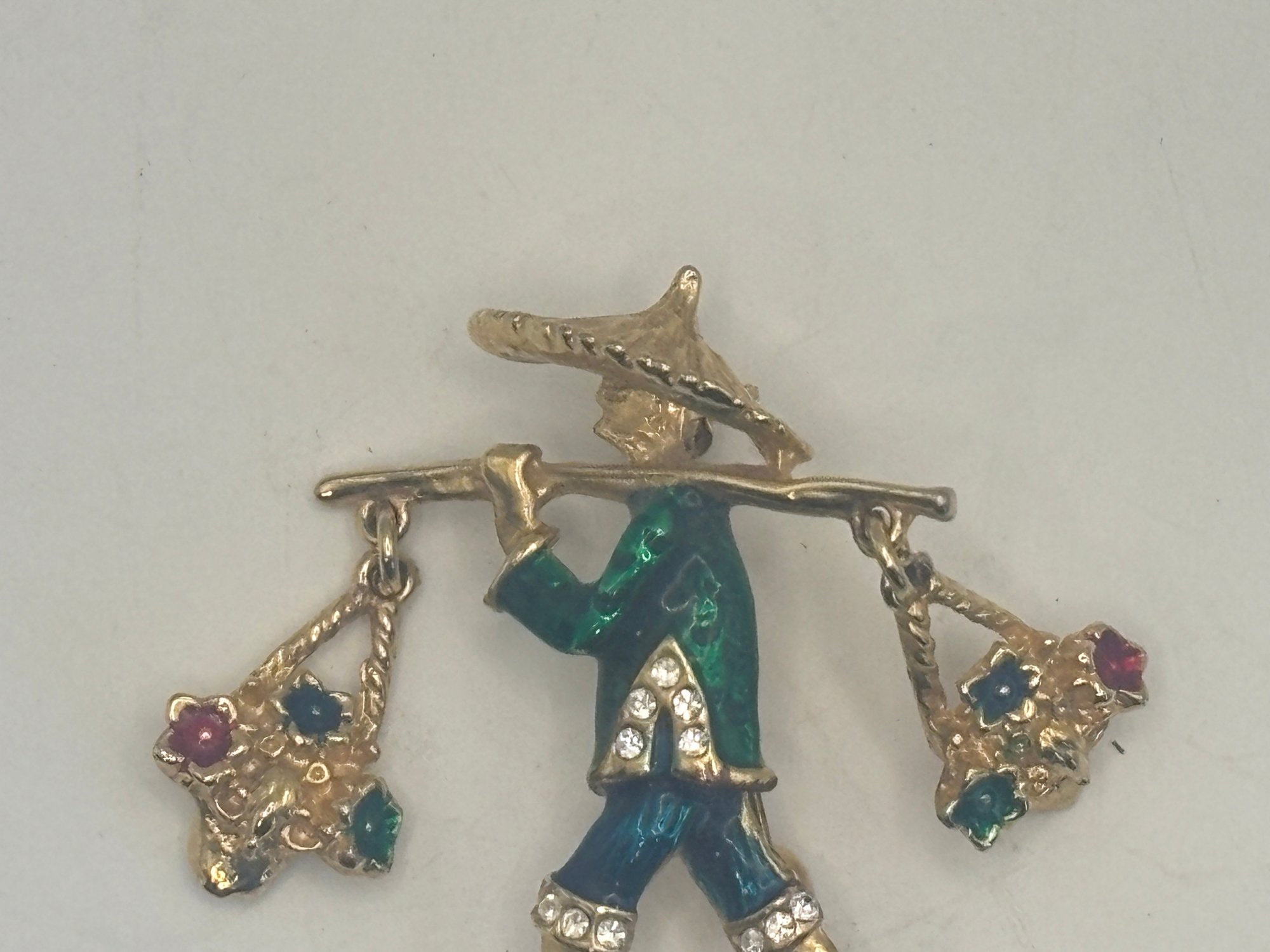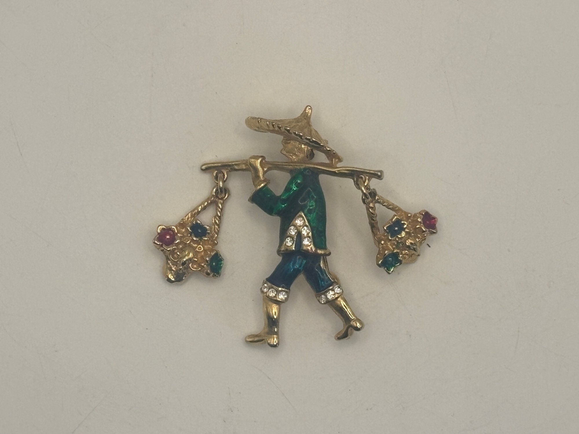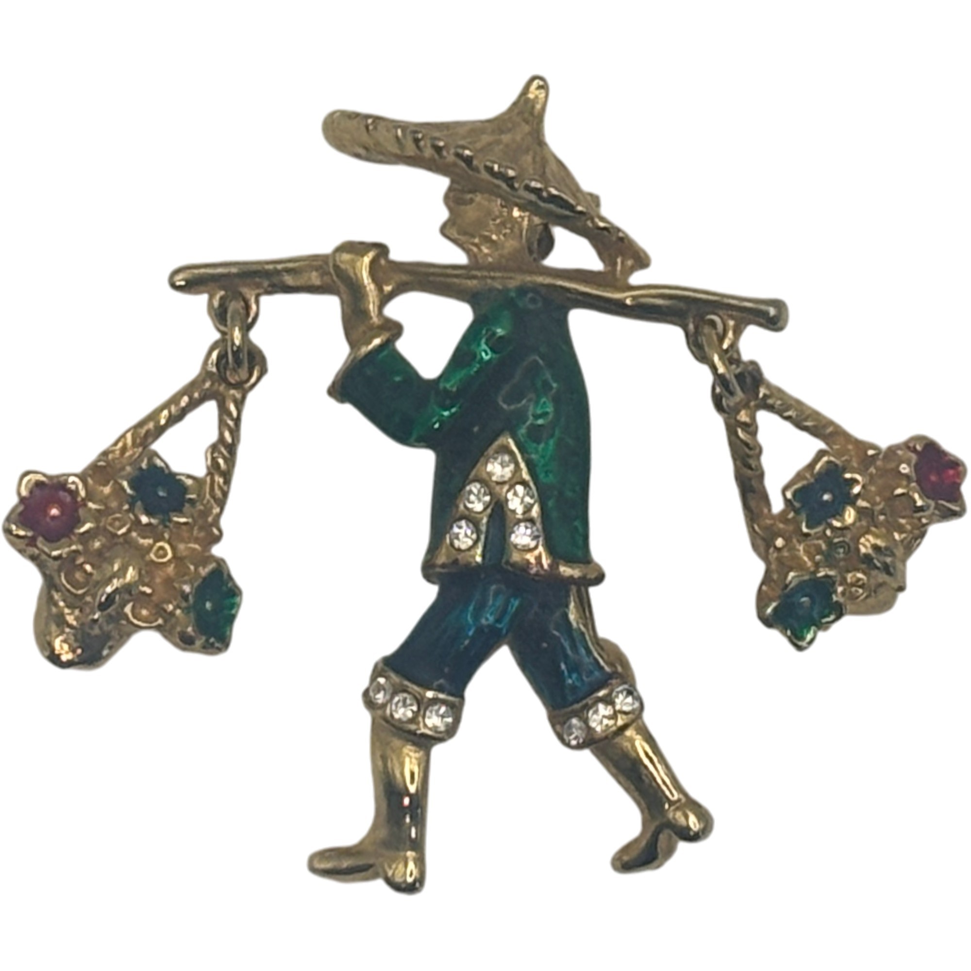 A charming figural brooch depicting a traveling peddler carrying a pole balanced with two dangling star-shaped baskets, each accented with colorful rhinestones. The figure features glossy green and blue enamel clothing, gold-tone boots and hat, and clear rhinestone accents at the cuffs and waist for a bit of sparkle. The articulated hanging elements add movement and playful dimension, giving this piece lots of character and visual interest.