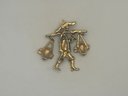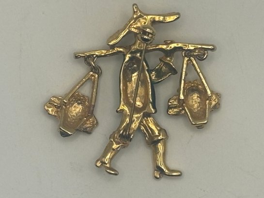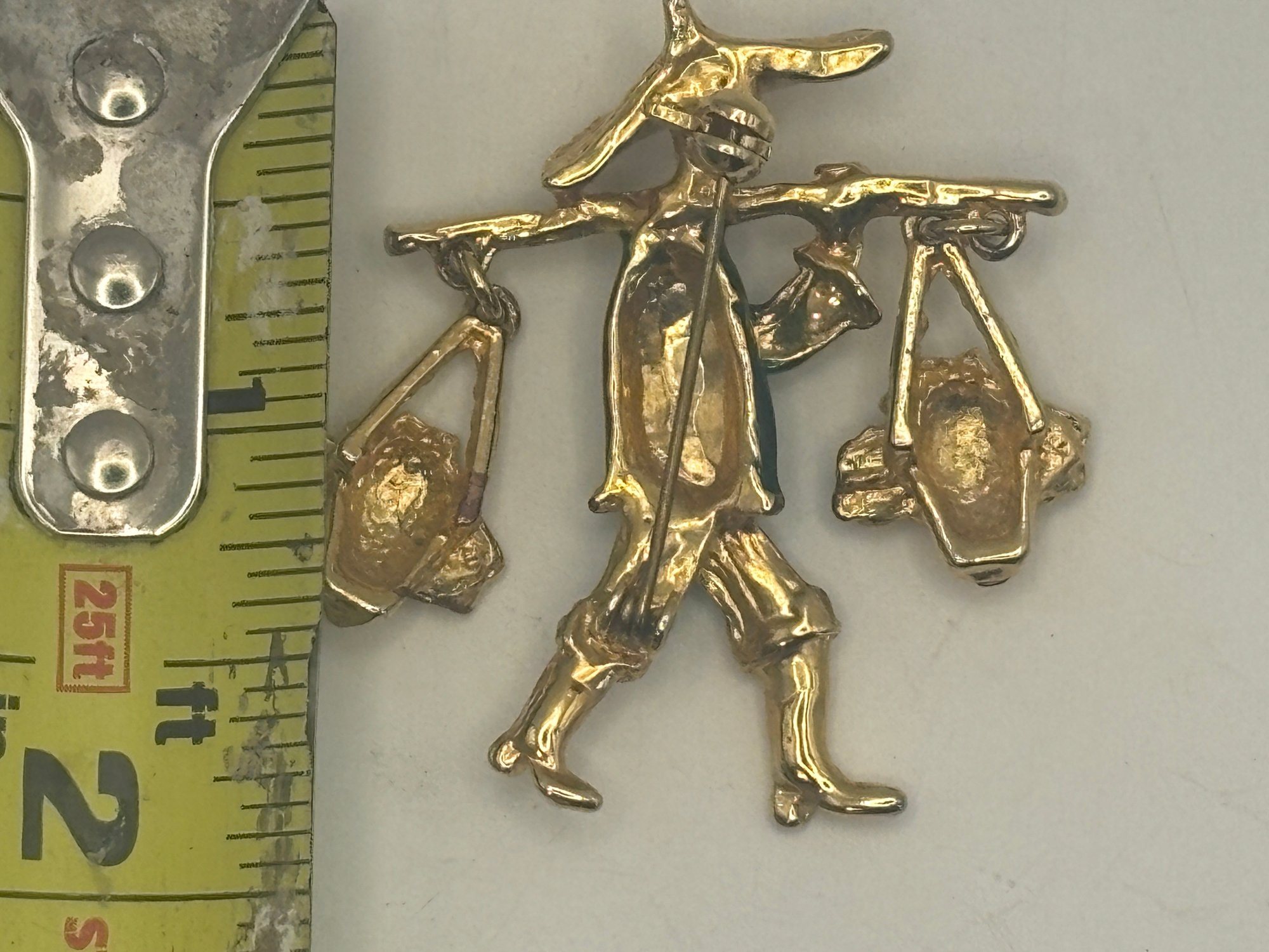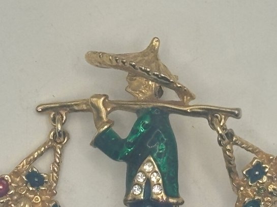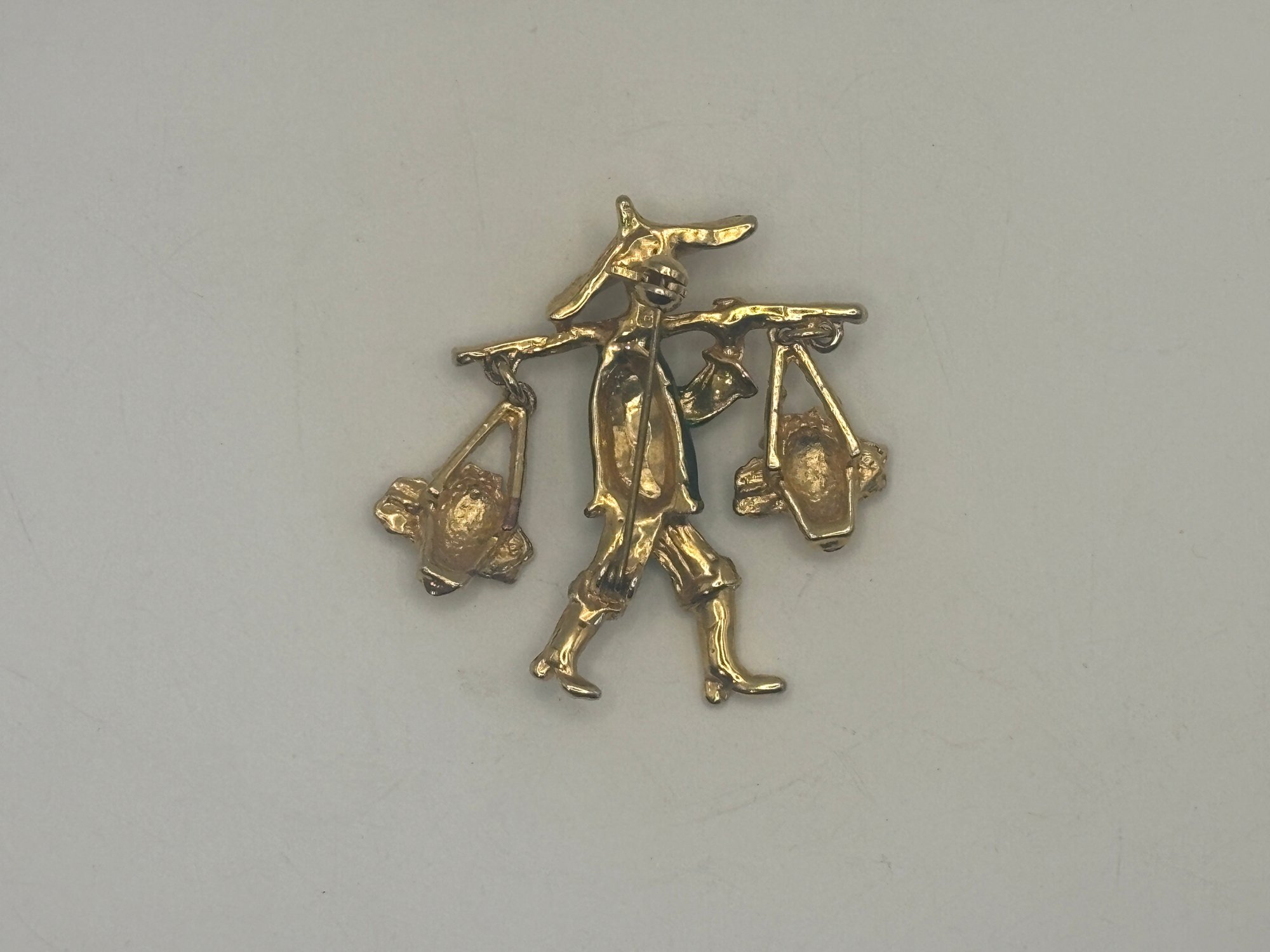 A charming figural brooch depicting a traveling peddler carrying a pole balanced with two dangling star-shaped baskets, each accented with colorful rhinestones. The figure features glossy green and blue enamel clothing, gold-tone boots and hat, and clear rhinestone accents at the cuffs and waist for a bit of sparkle. The articulated hanging elements add movement and playful dimension, giving this piece lots of character and visual interest.