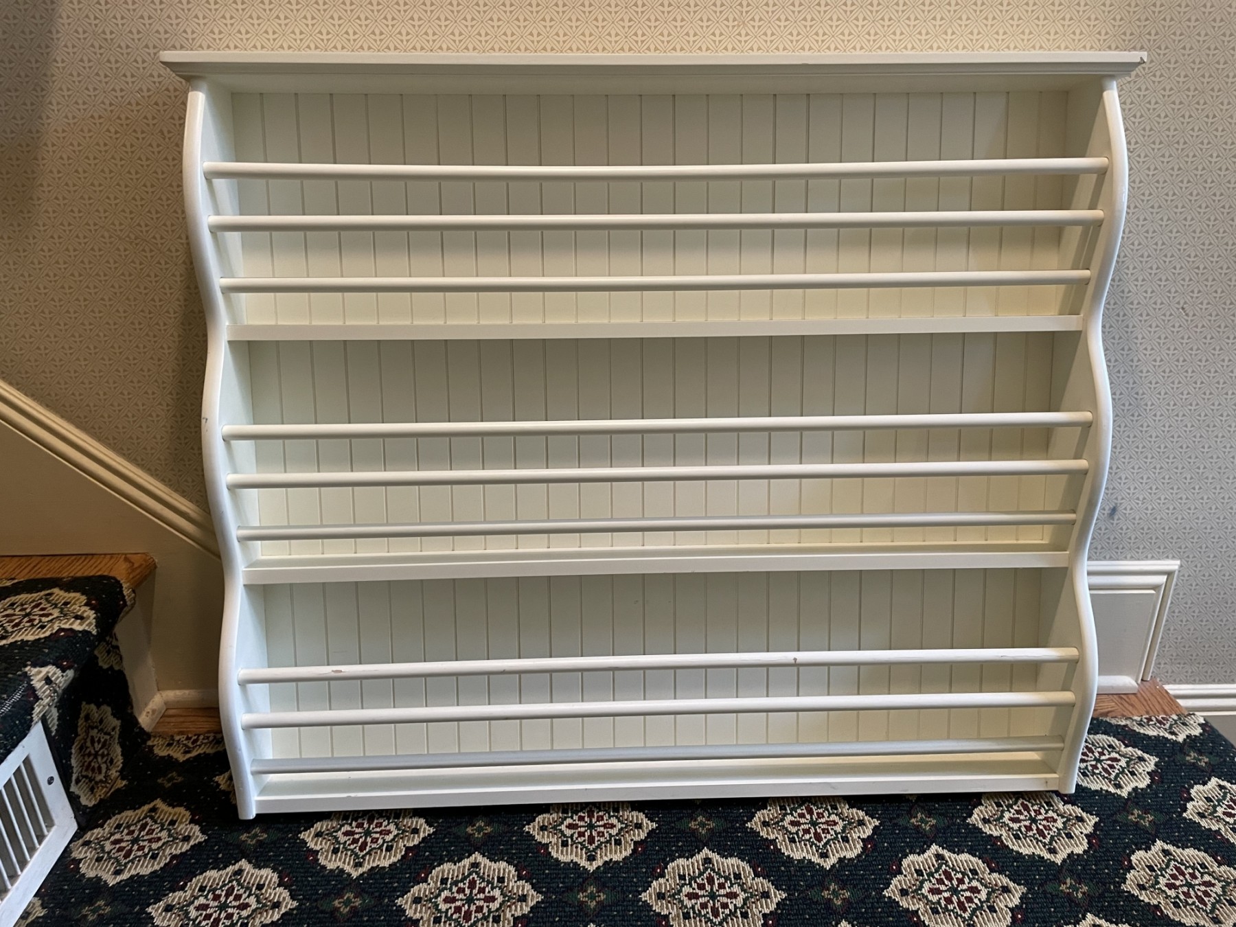 Three rows of shelves. Great in the kids room. Cream or off white. Width is 36 inches. Height is 30.5”. Depth is approximately 8”. Great condition. Has hanging books on the top left and right. Great for display. Small chips to pain. As photographed.
