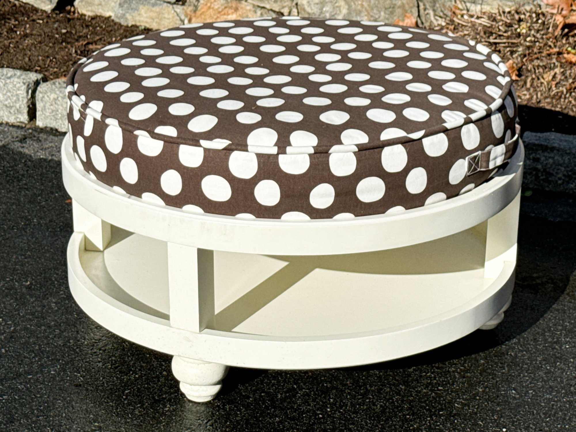 White finished frame with openwork body for storage with a lovely polka dot upholstered seat cushion.