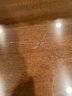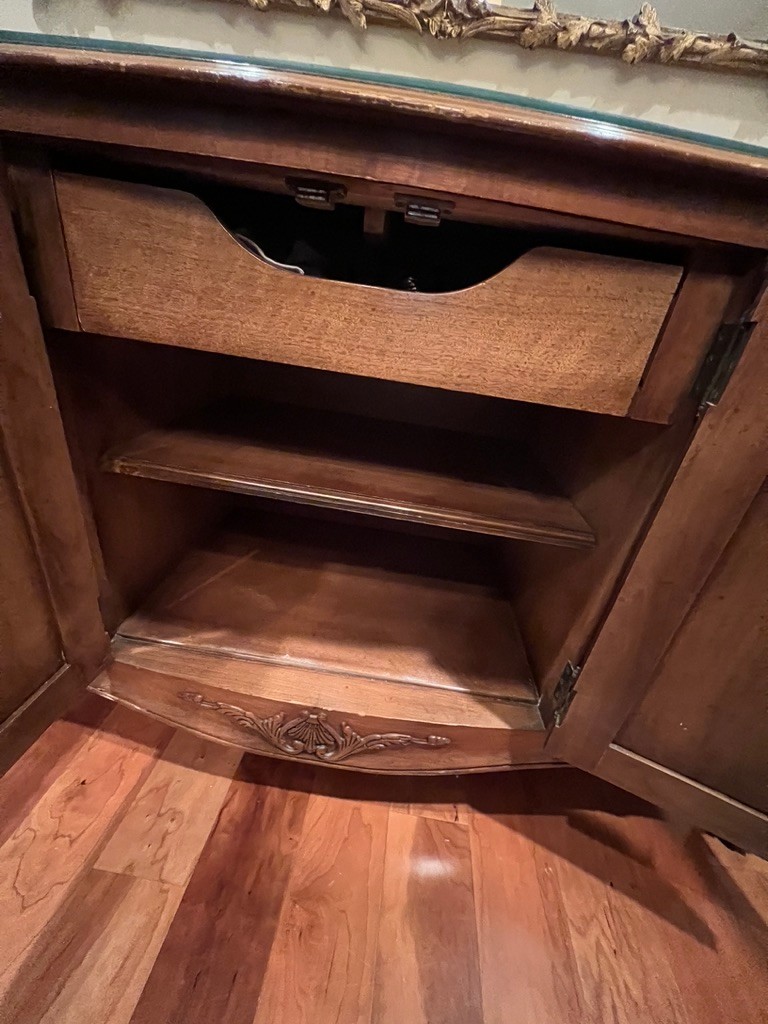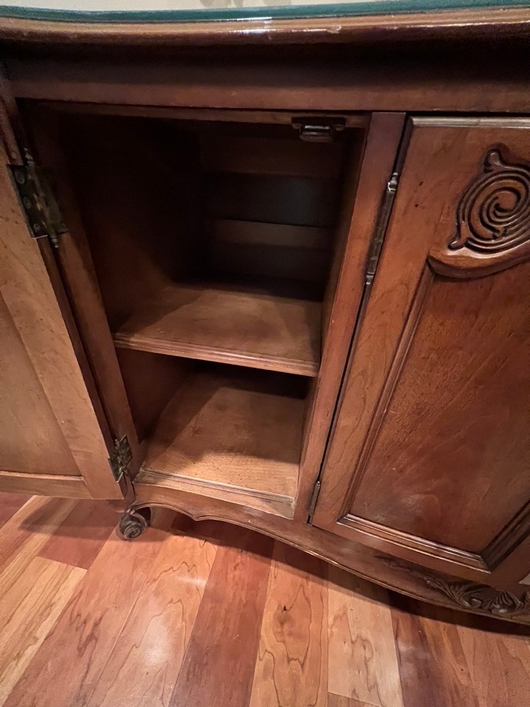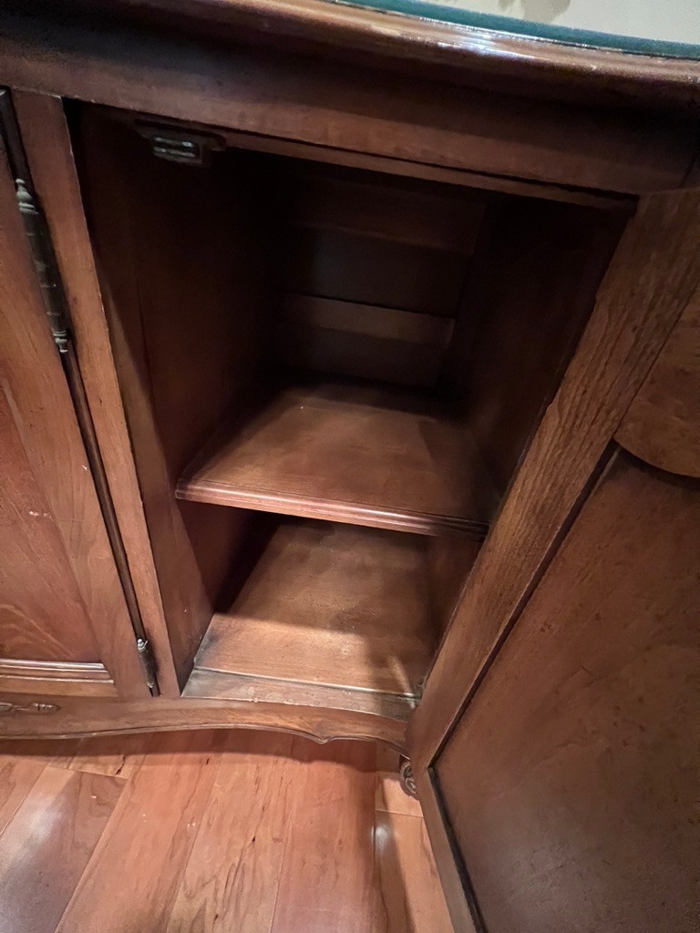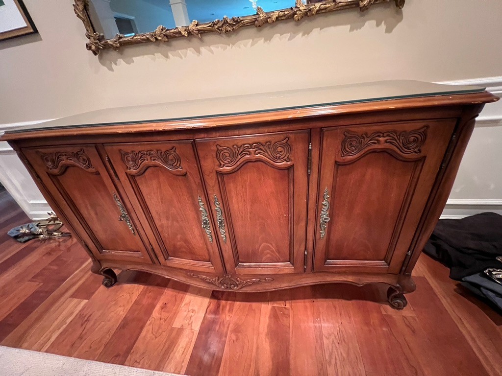 White Furniture Manufacturer, side board, walnut, 2 dise cabinets with shelves, 1 center cabinet w/2 doors, pull out drawer for your sterling silver, in lovely condition. This has been covered with a glass top, the top is wonderful, the glass has a fracture, BUT the TOP IS GREAT!
