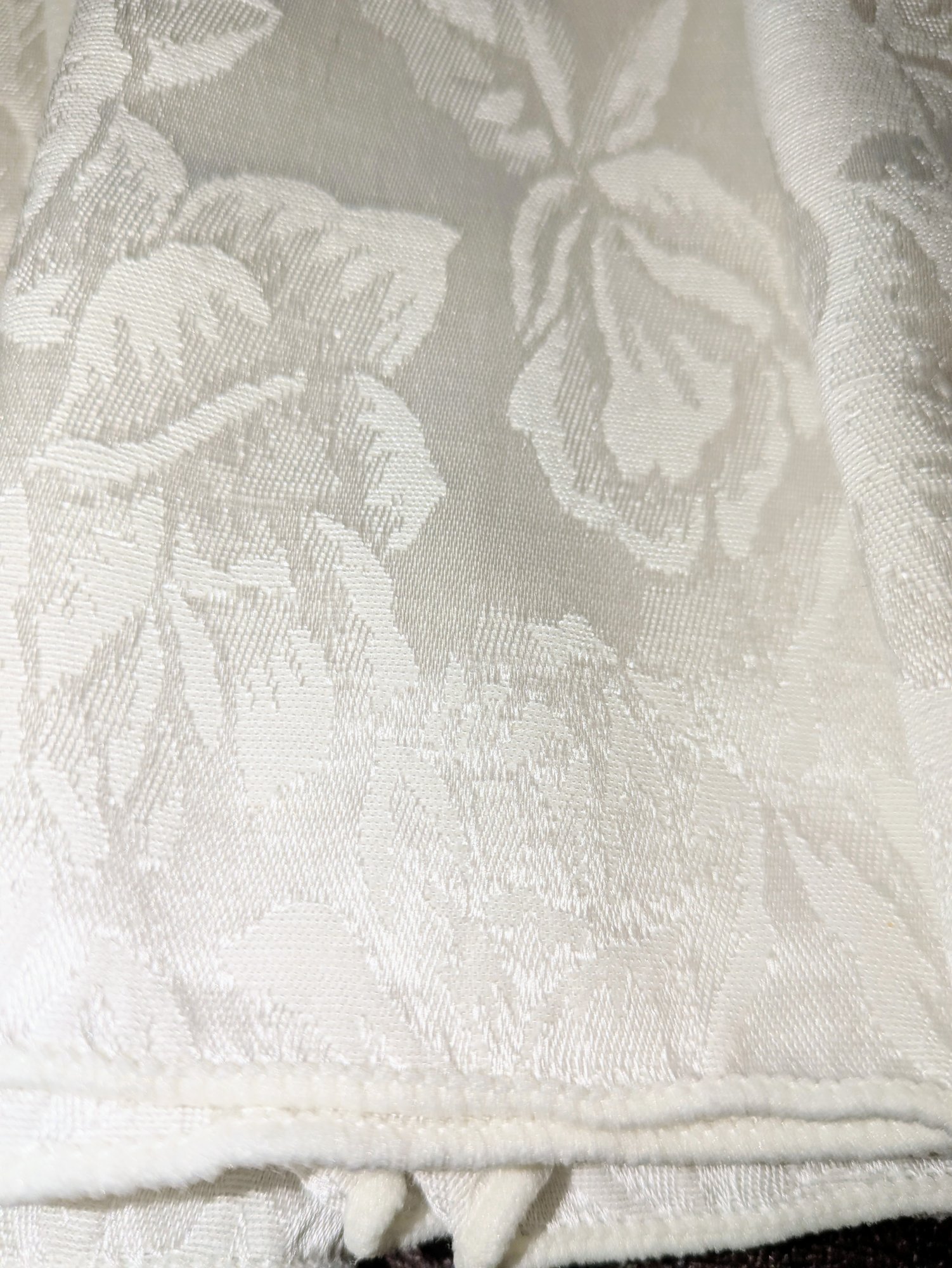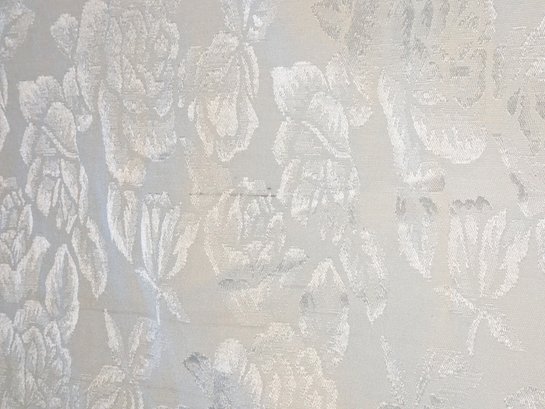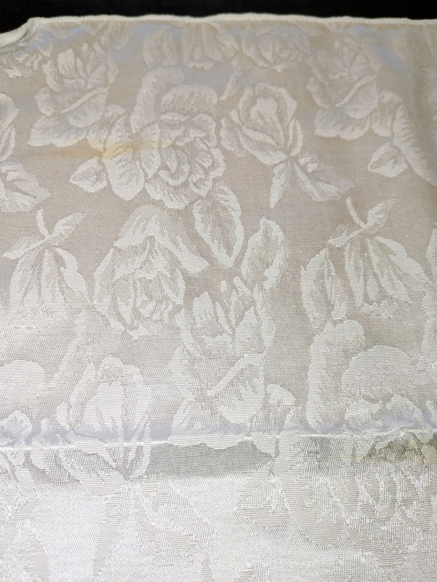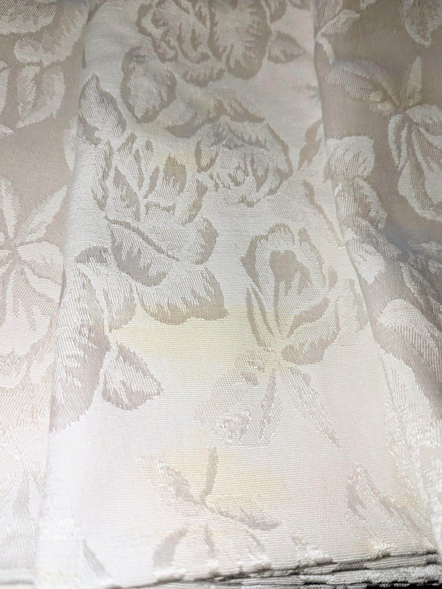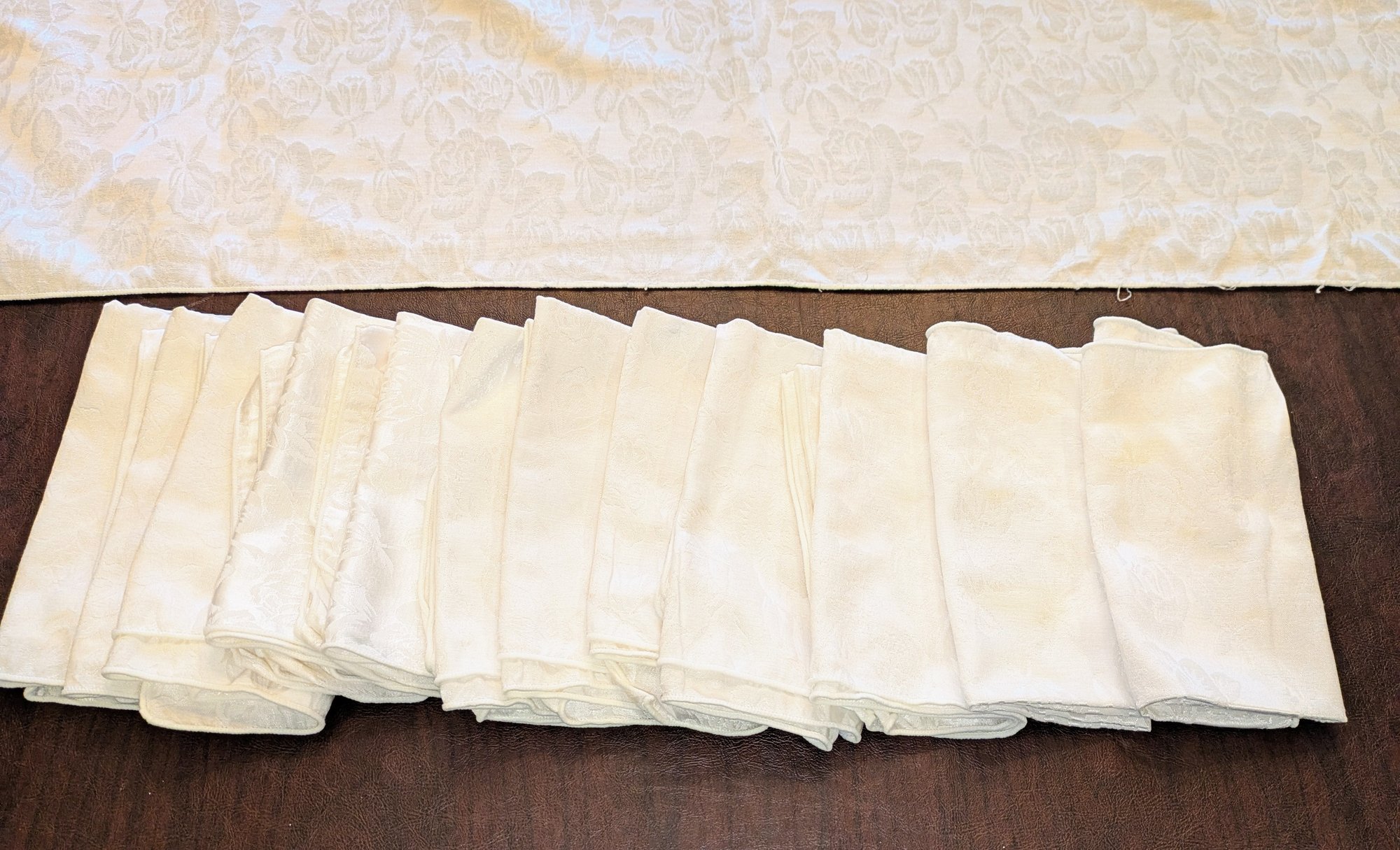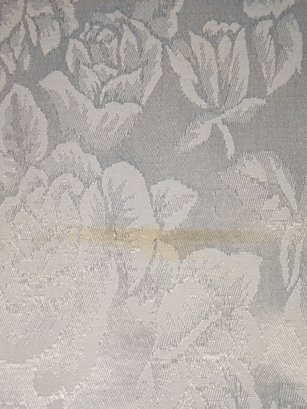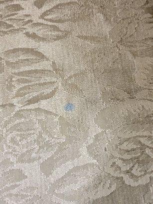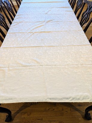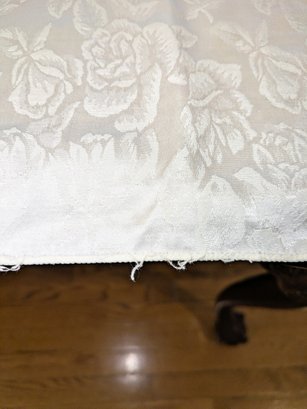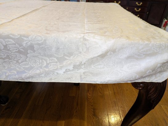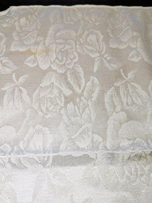 White Poly/Sateen Look Rose Design Rectangular Tablecloth With (12) Matching Napkins. Beautiful Rose Design in a Sateen Look. There are some marks on the tablecloth and on 4 napkins, consistent with age and use. Please see all photos as part of the description and condition. Tablecloth 98.5" x 55" / Napkins 16" Square.