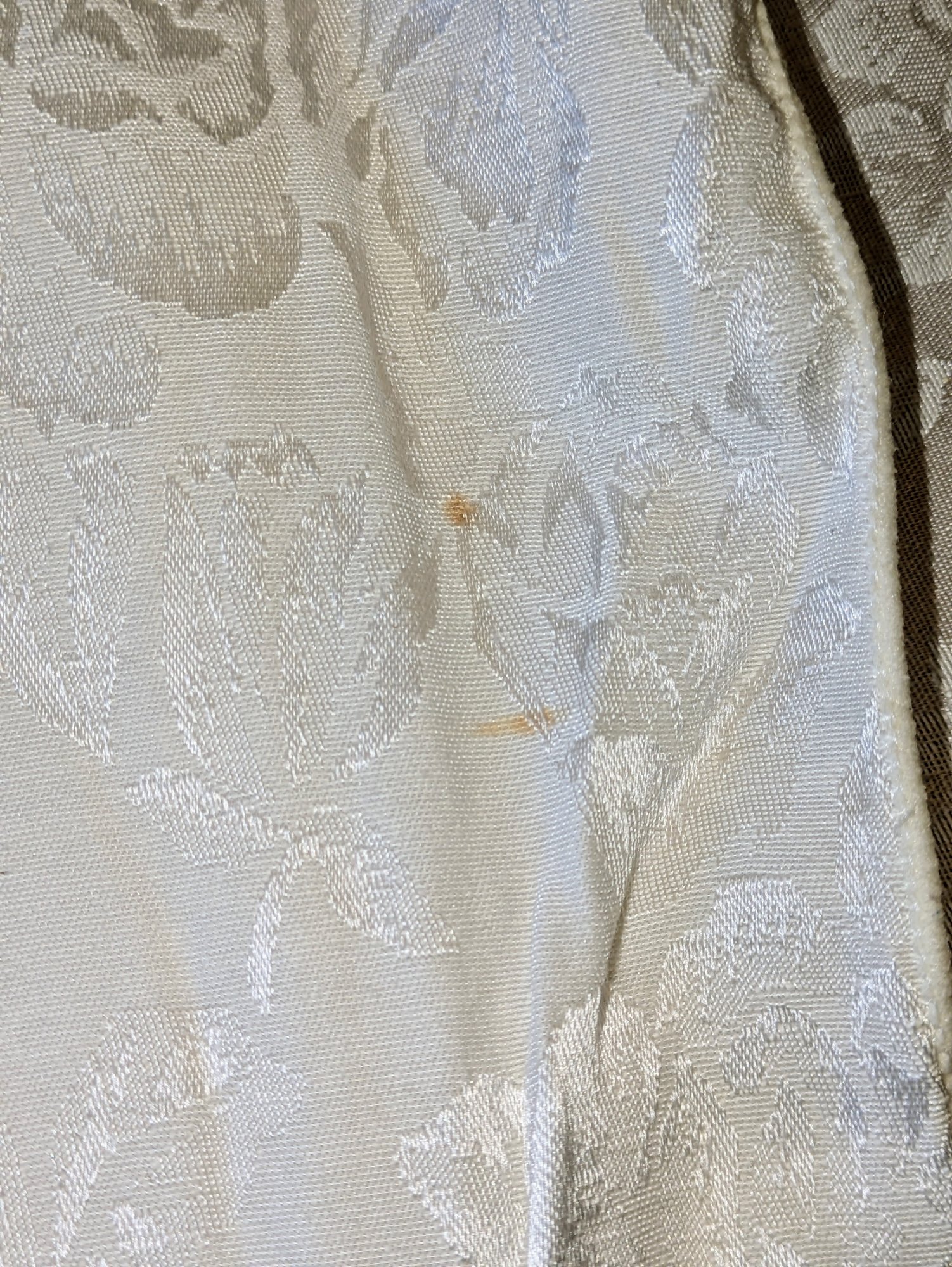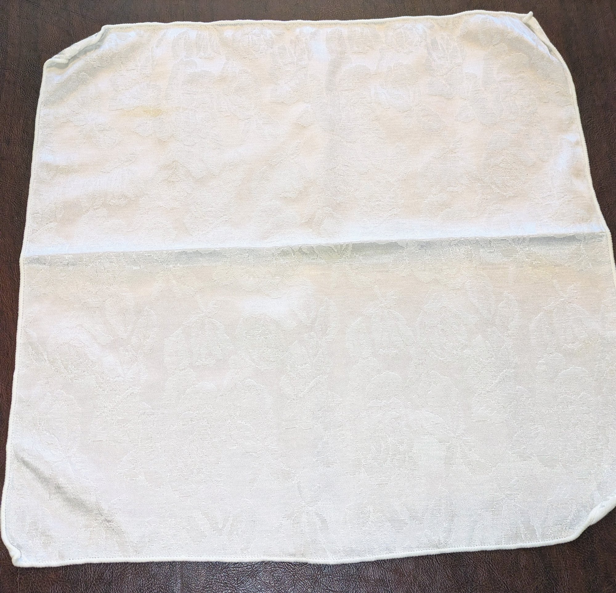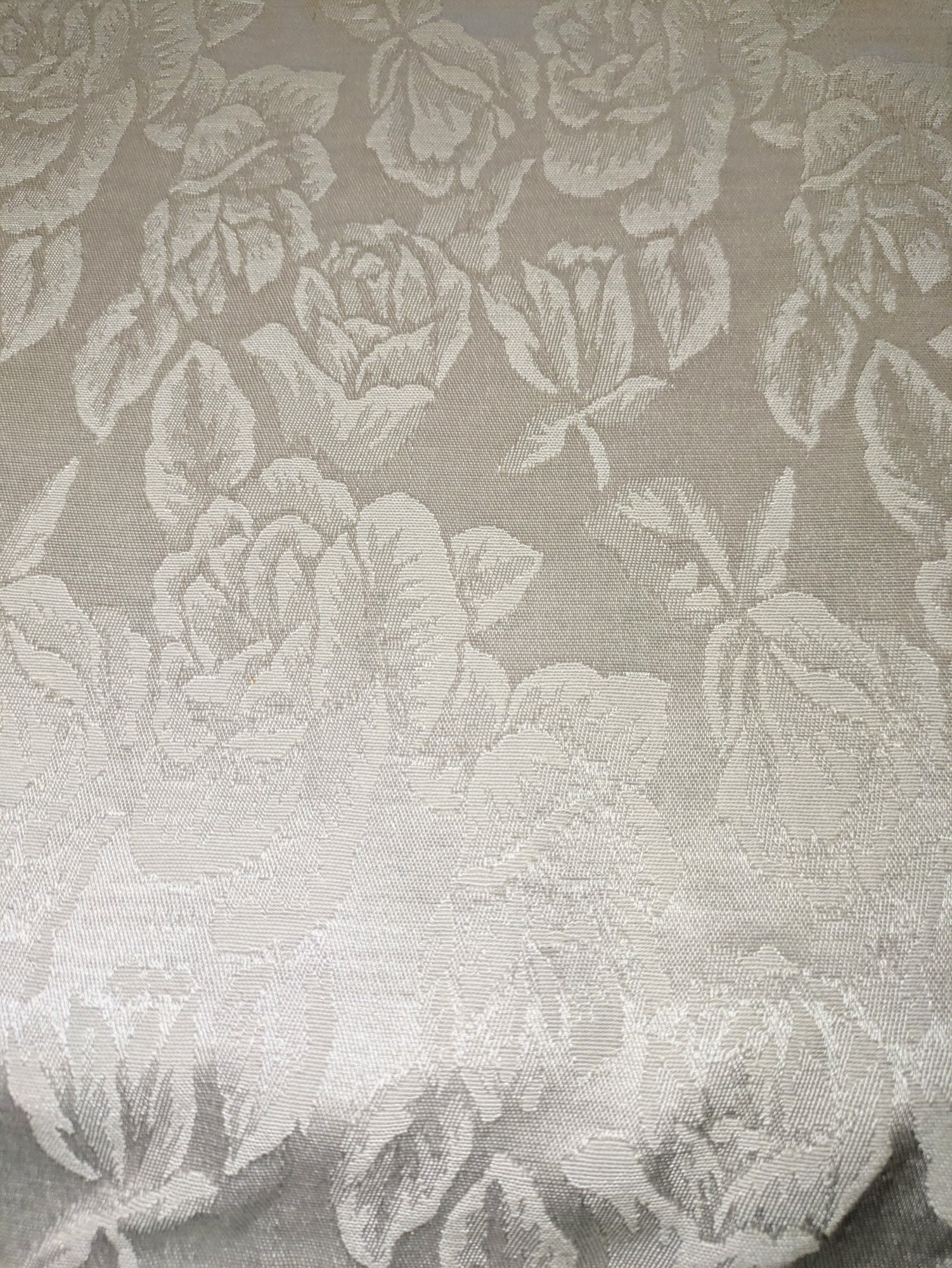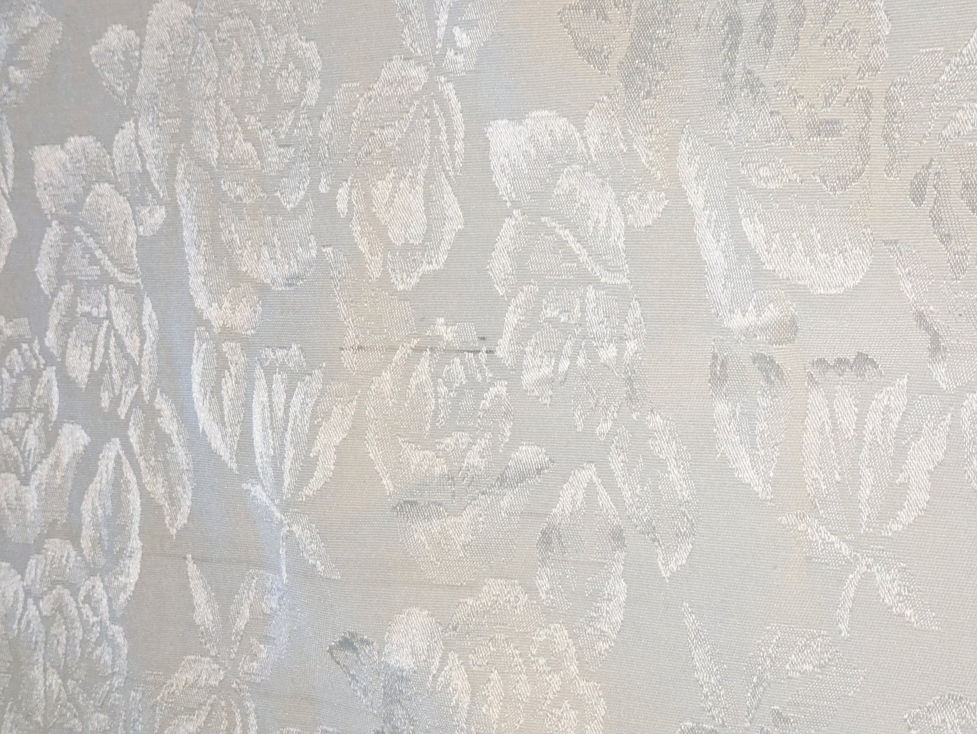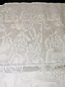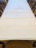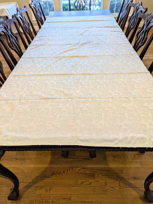 White Poly/Sateen Look Rose Design Rectangular Tablecloth With (12) Matching Napkins. Beautiful Rose Design in a Sateen Look. There are some marks on the tablecloth and on 4 napkins, consistent with age and use. Please see all photos as part of the description and condition. Tablecloth 98.5" x 55" / Napkins 16" Square.