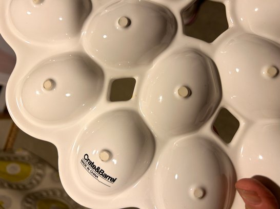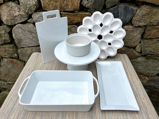 All in very good condition. All pieces are Crate & Barrel except cake plate-Tag, and small fluted bowl unmarked. 8.5 x 13.5" x 3.5 " H- large casserole. Long Rectangle 14" L