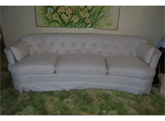 A nice, comfortable upholstered white couch. Has some small stains on fabric, see pictures for details.