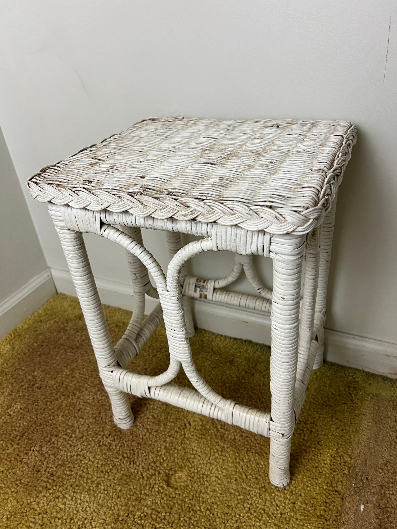 Petite white painted wicker plant stand with a demilune design on each side.