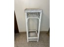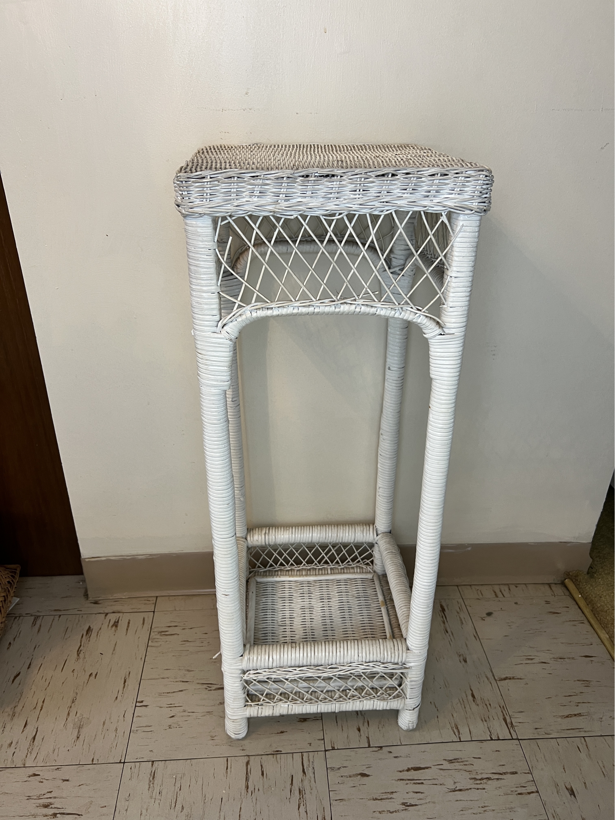 White painted square wicker plant stand with a lower shelf.