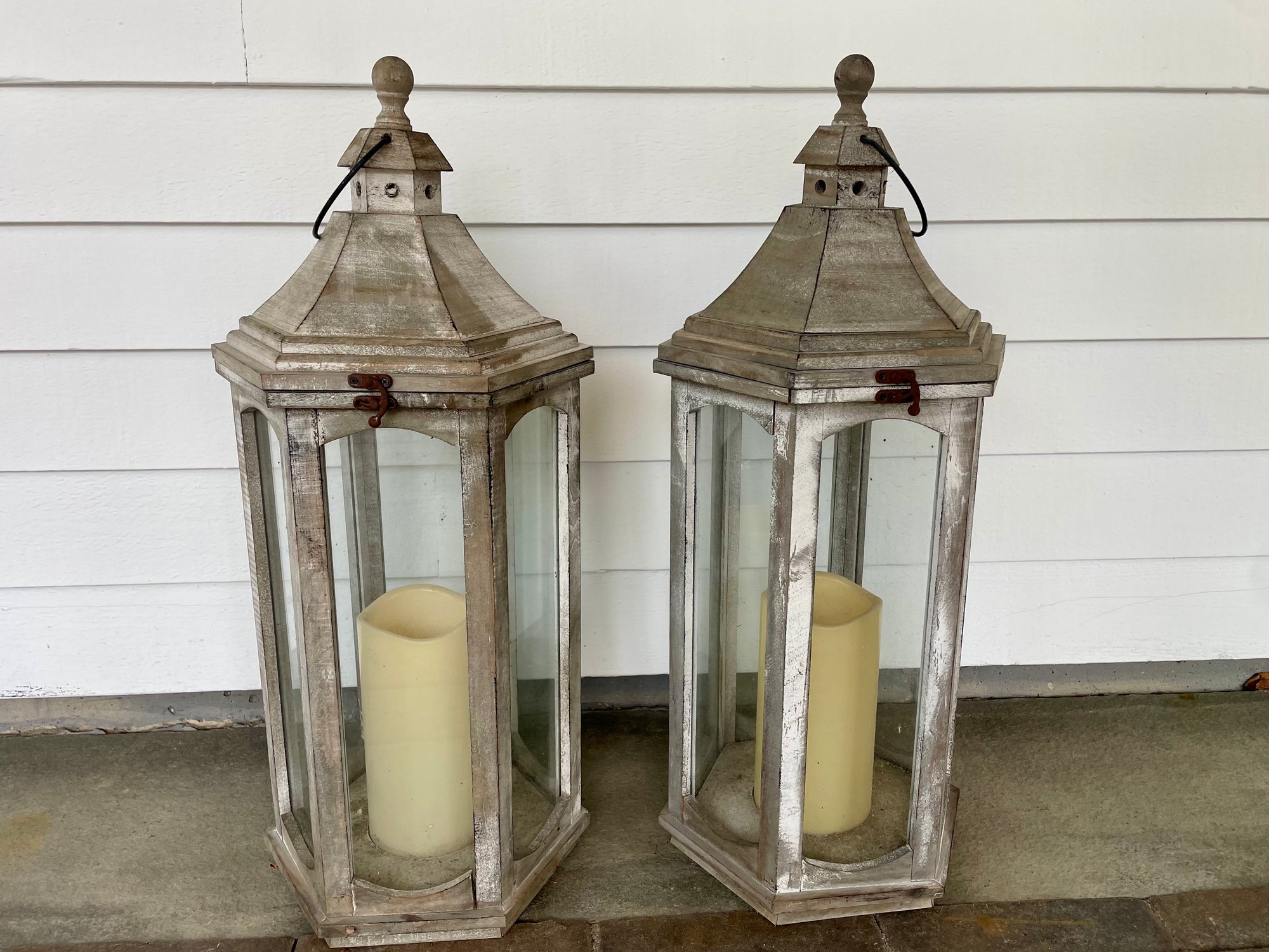 Pair of whitewashed wood and glass floor lanterns.