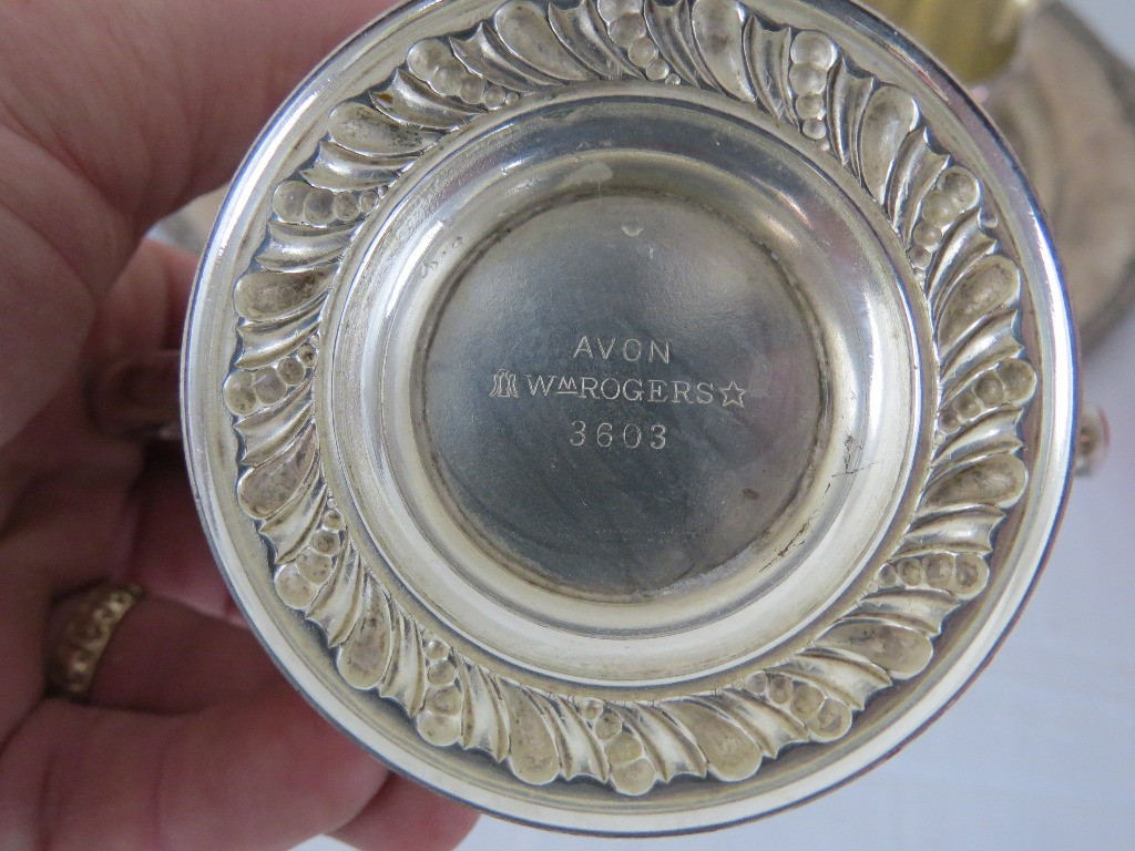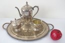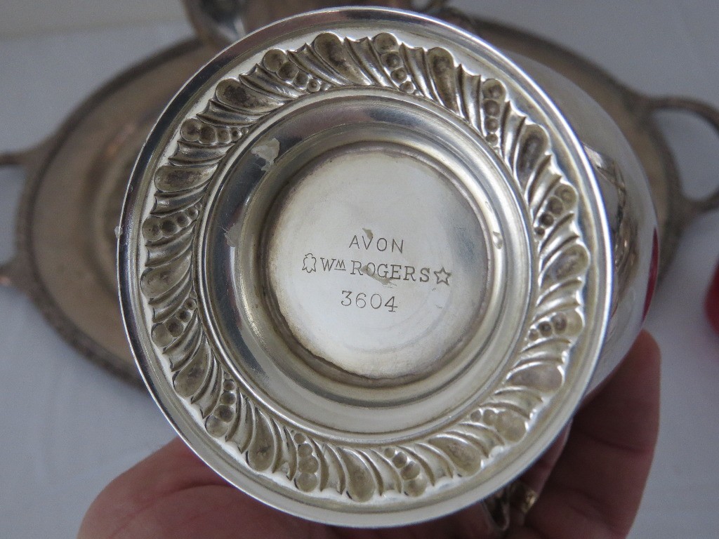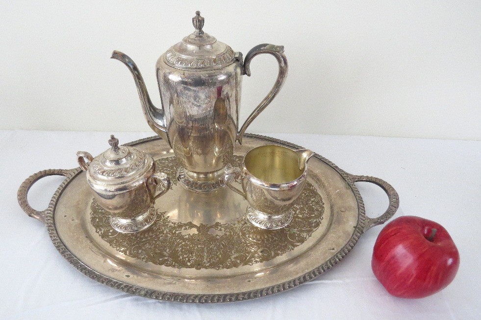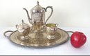 A 4 part coffee service by Wm. Rogers silverplate in their Avon pattern includes tray, coffee pot, creamer and covered sugar bowl. Light tarnish but otherwise in good shape.