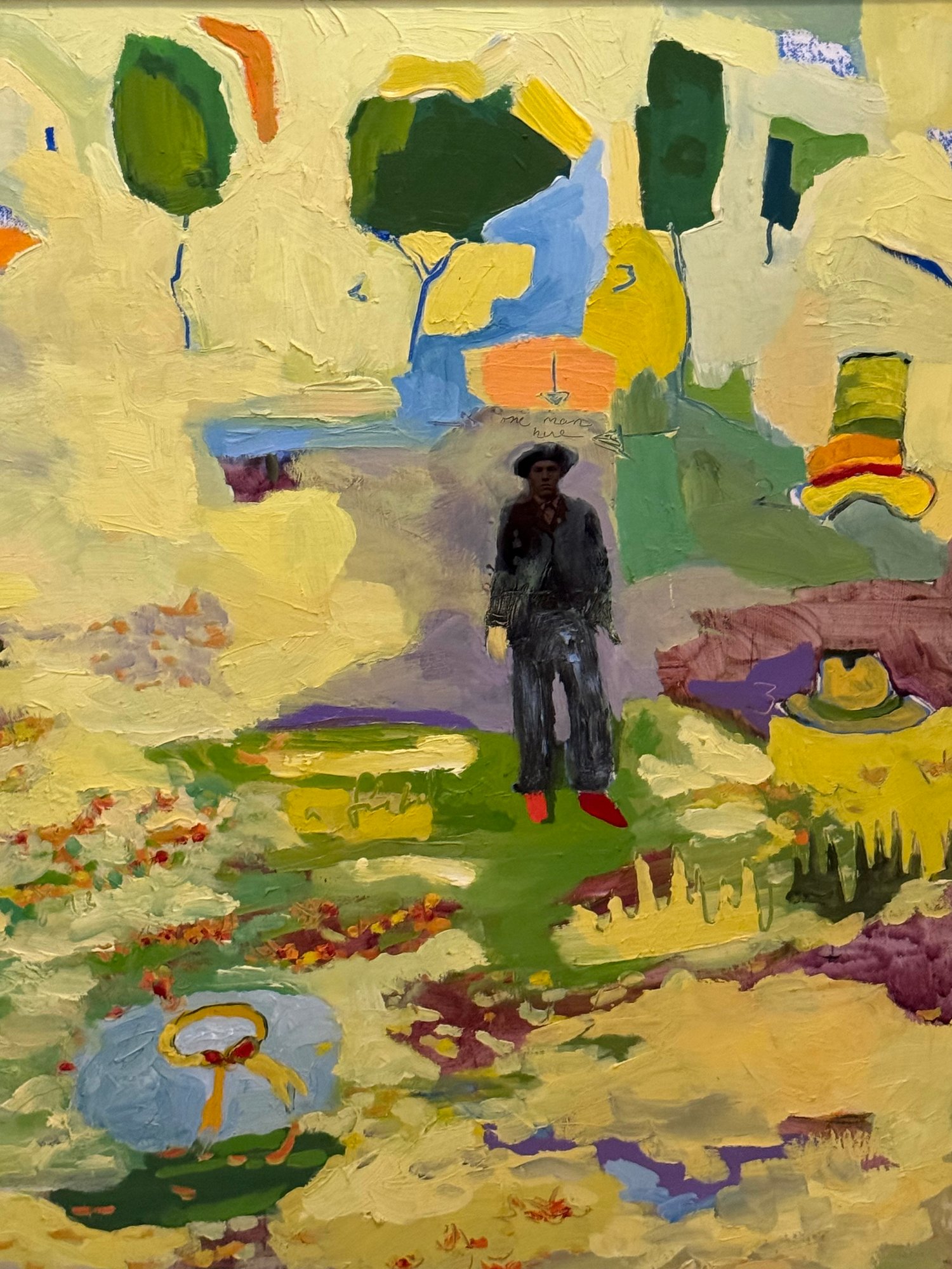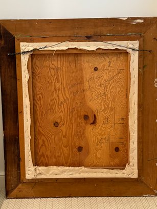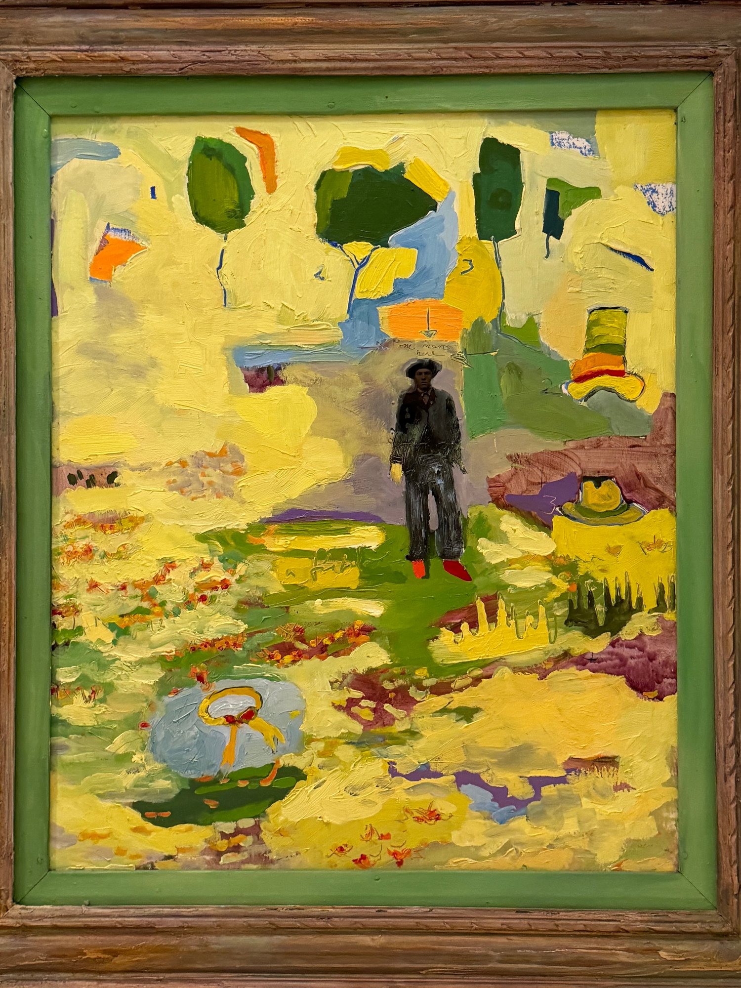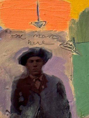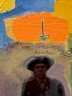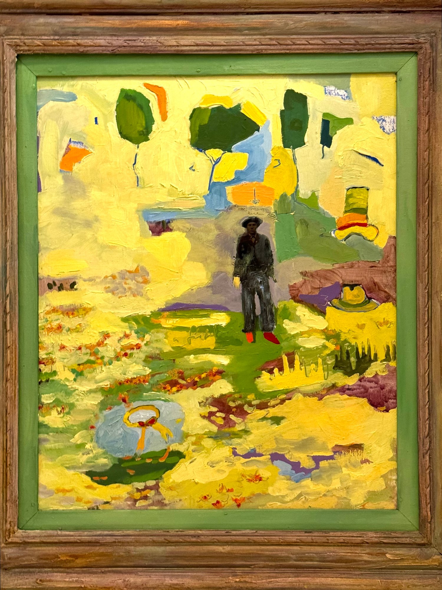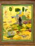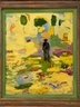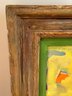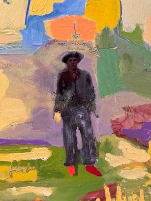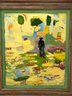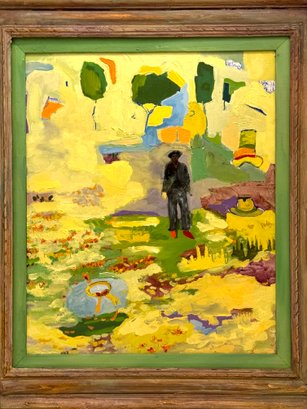 This very well done and slightly quirky painting depicts a man / artist surrounded or in a pond with a duck (possibly :) of bright yellows, orange and green shapes layered upon one another in a thick impasto. The figure appears to be a vintage collages into the painting with the written words above his head - One Man Here. There is much to unpack in this utterly charming work. Signed on back 1993 to a Louis Ray and framed in a rustic wood style frame.