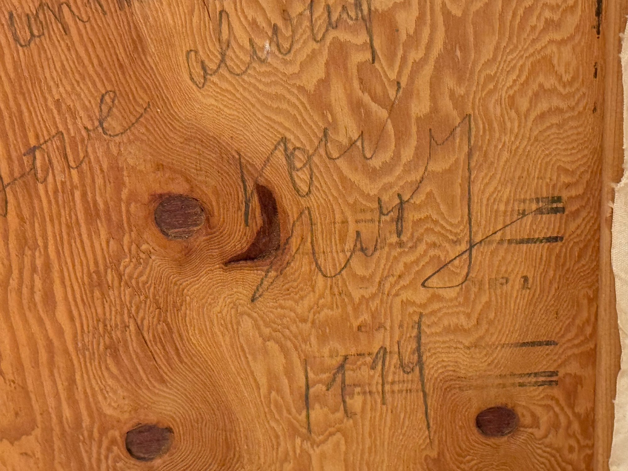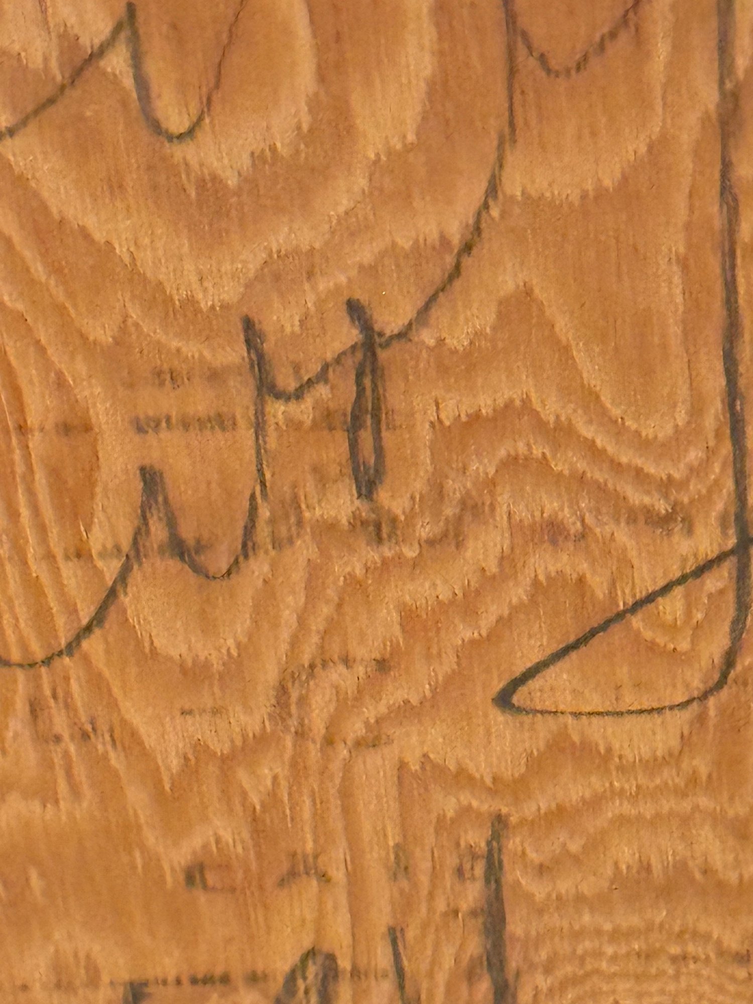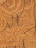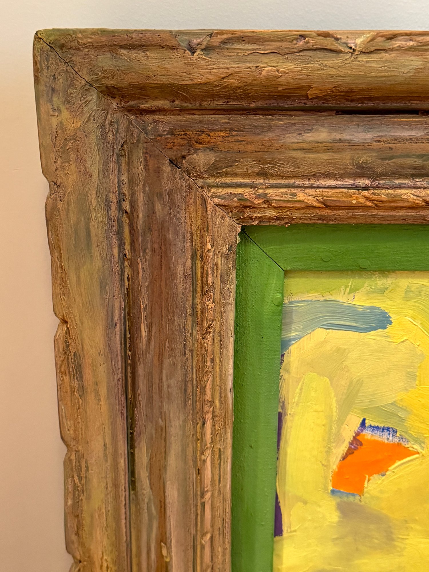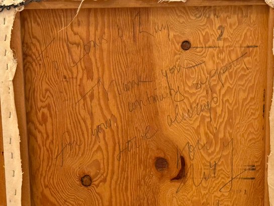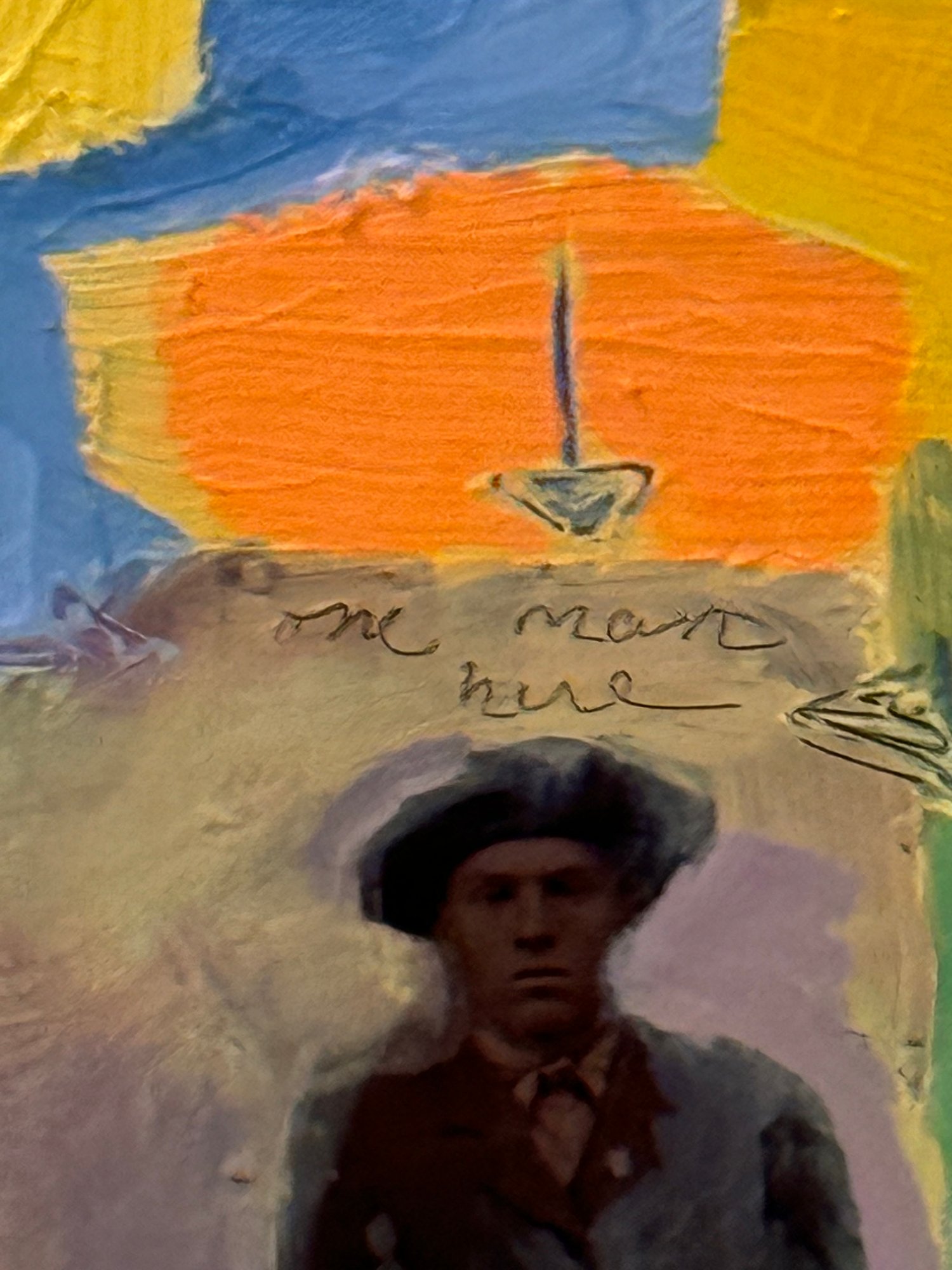 This very well done and slightly quirky painting depicts a man / artist surrounded or in a pond with a duck (possibly :) of bright yellows, orange and green shapes layered upon one another in a thick impasto. The figure appears to be a vintage collages into the painting with the written words above his head - One Man Here. There is much to unpack in this utterly charming work. Signed on back 1993 to a Louis Ray and framed in a rustic wood style frame.