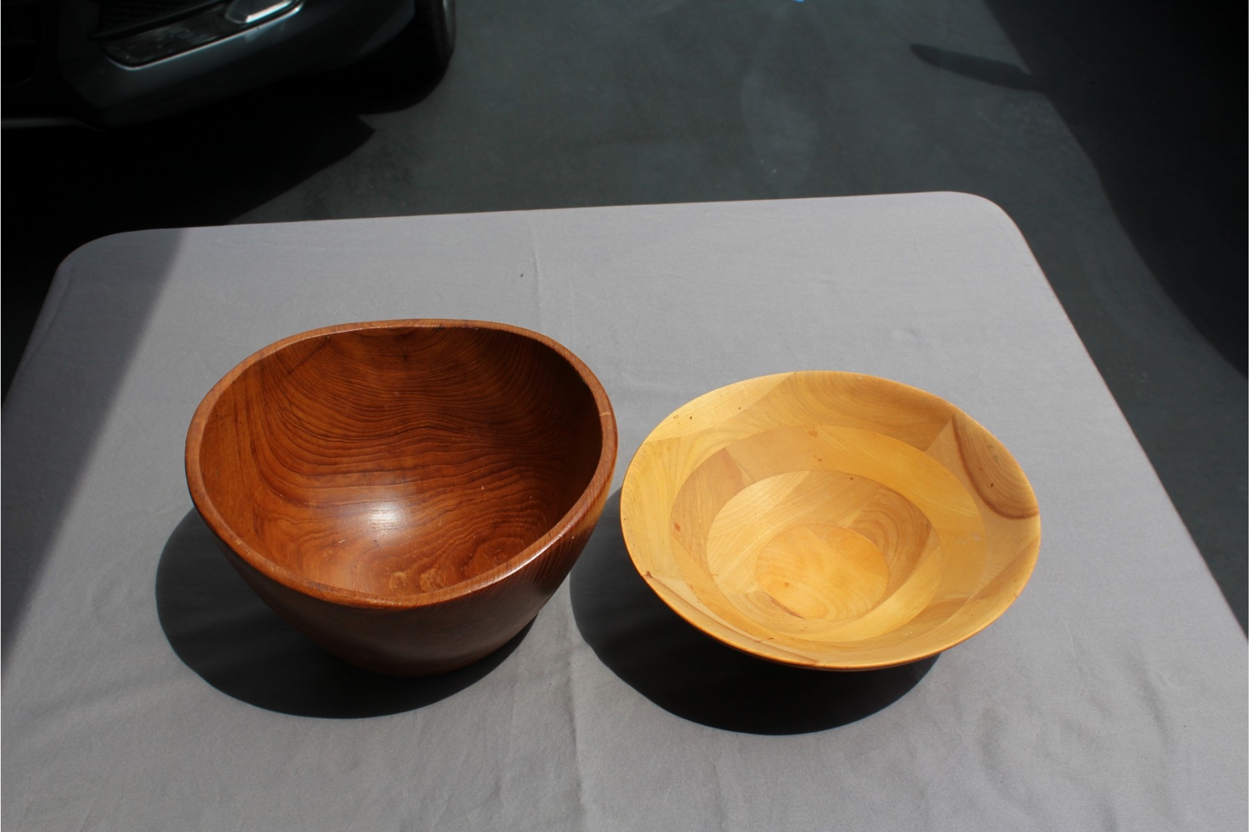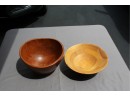 2 Wooden bowls very different, one is a beautiful composite style, the other is shaped bowl from one piece of wood very vintage look. The composite is 10" dia. the other more like a fruit bowl is about the same diameter.