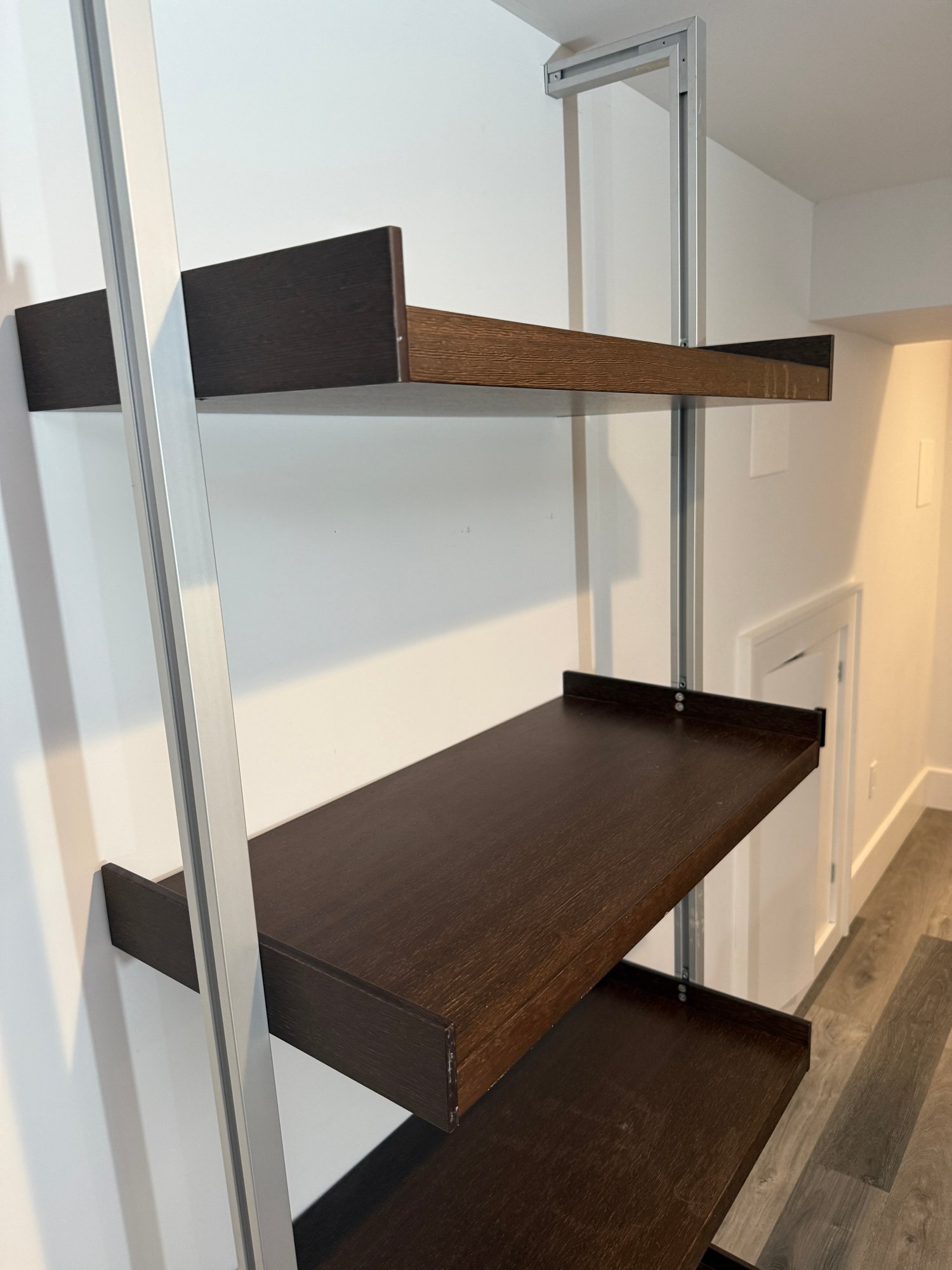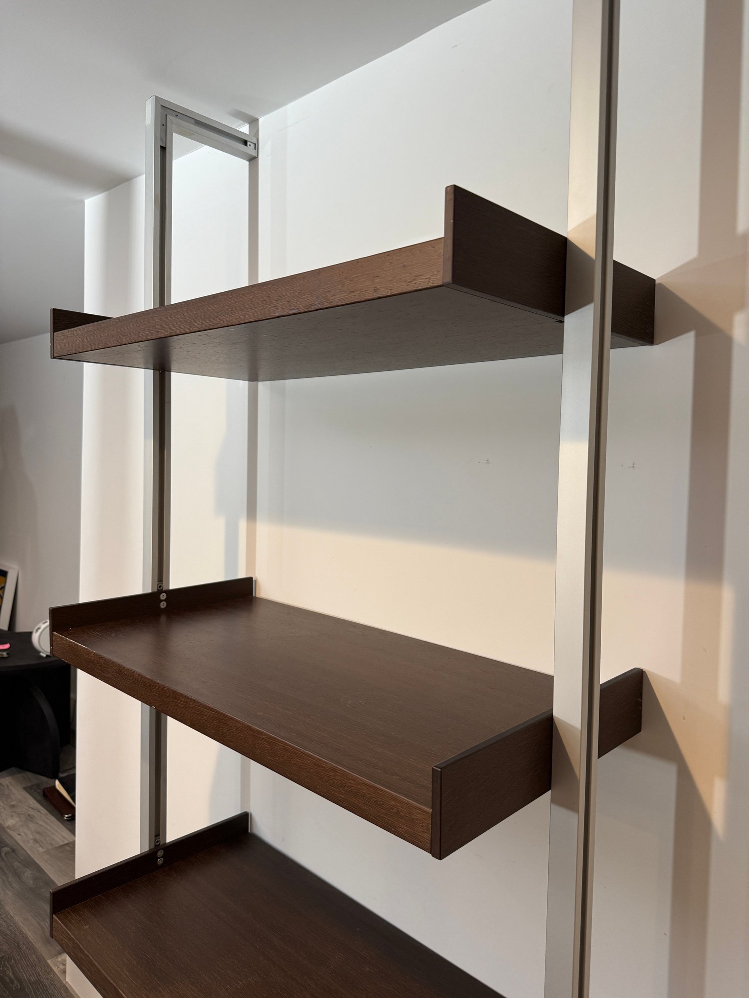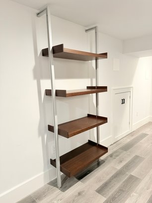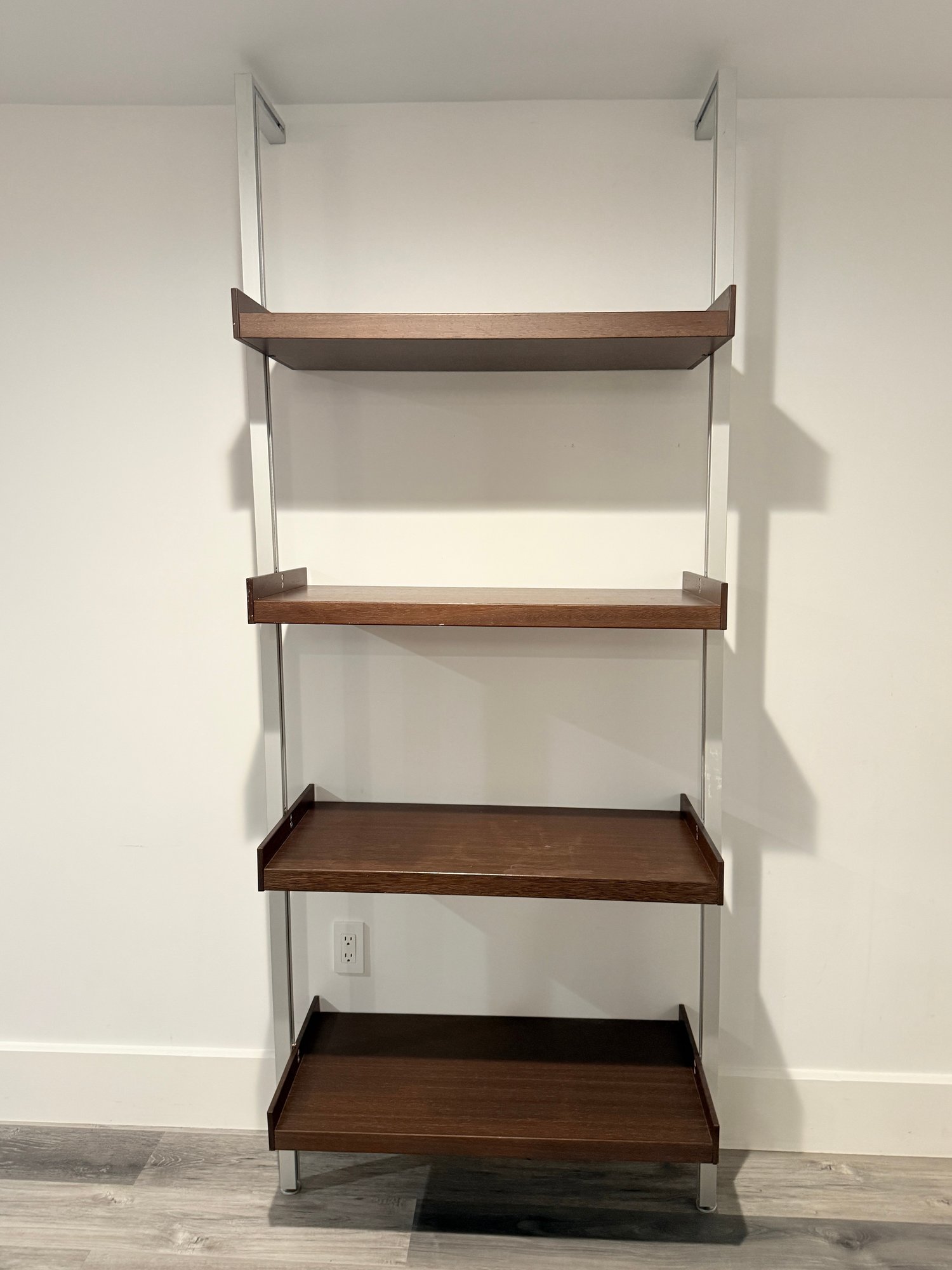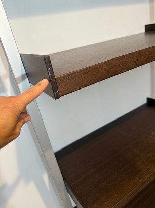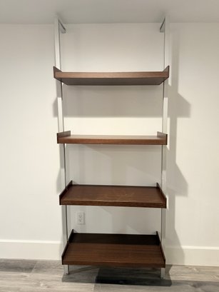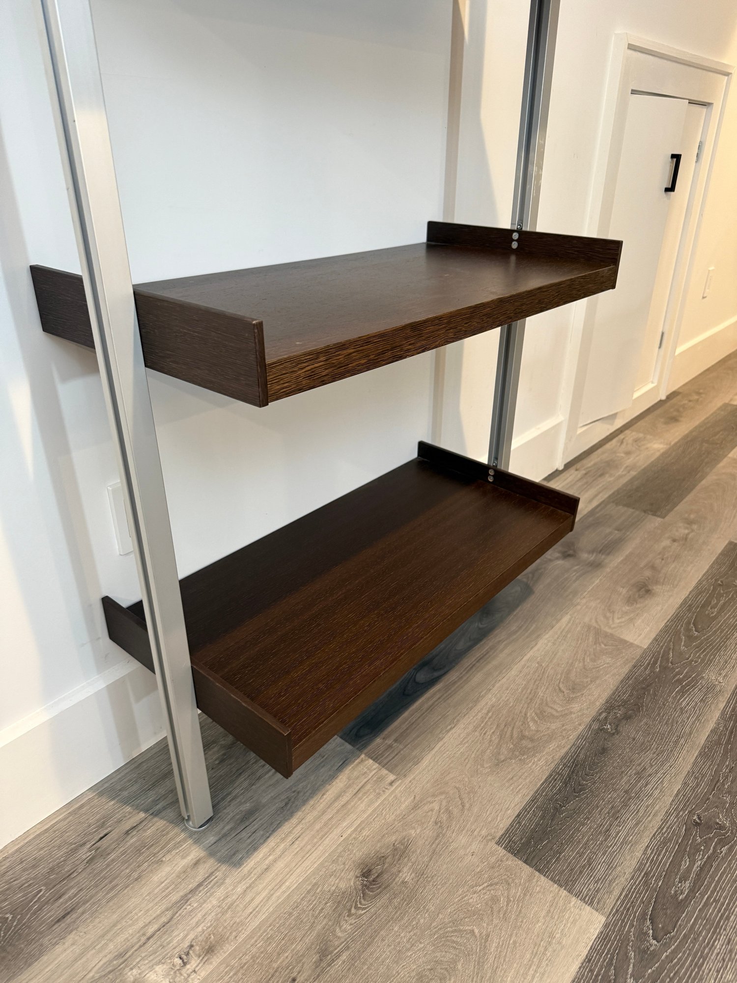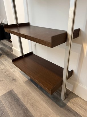 Believed to be Design Within Reach Treku wall shelving system. Brushed stainless steel with wood shelves