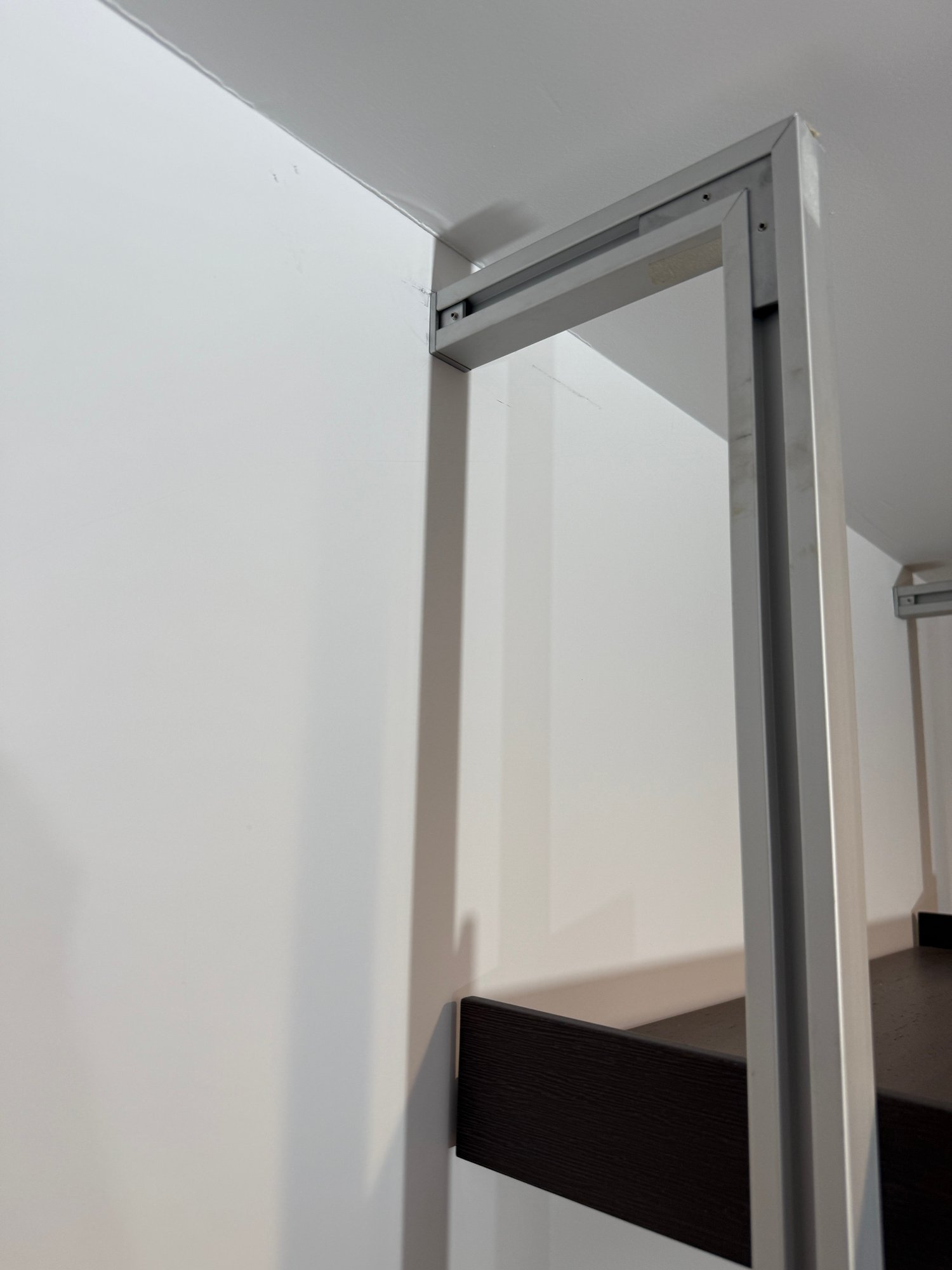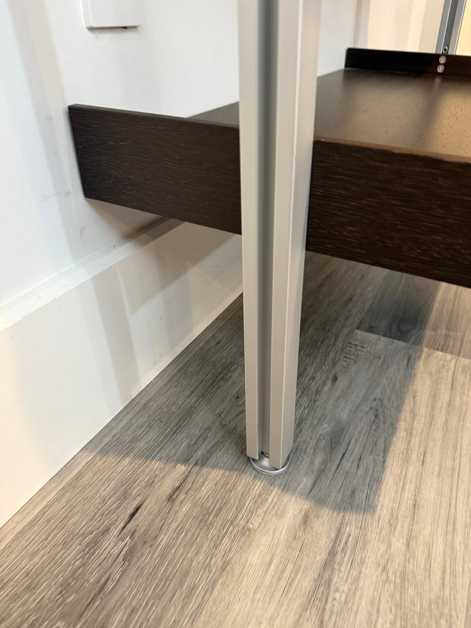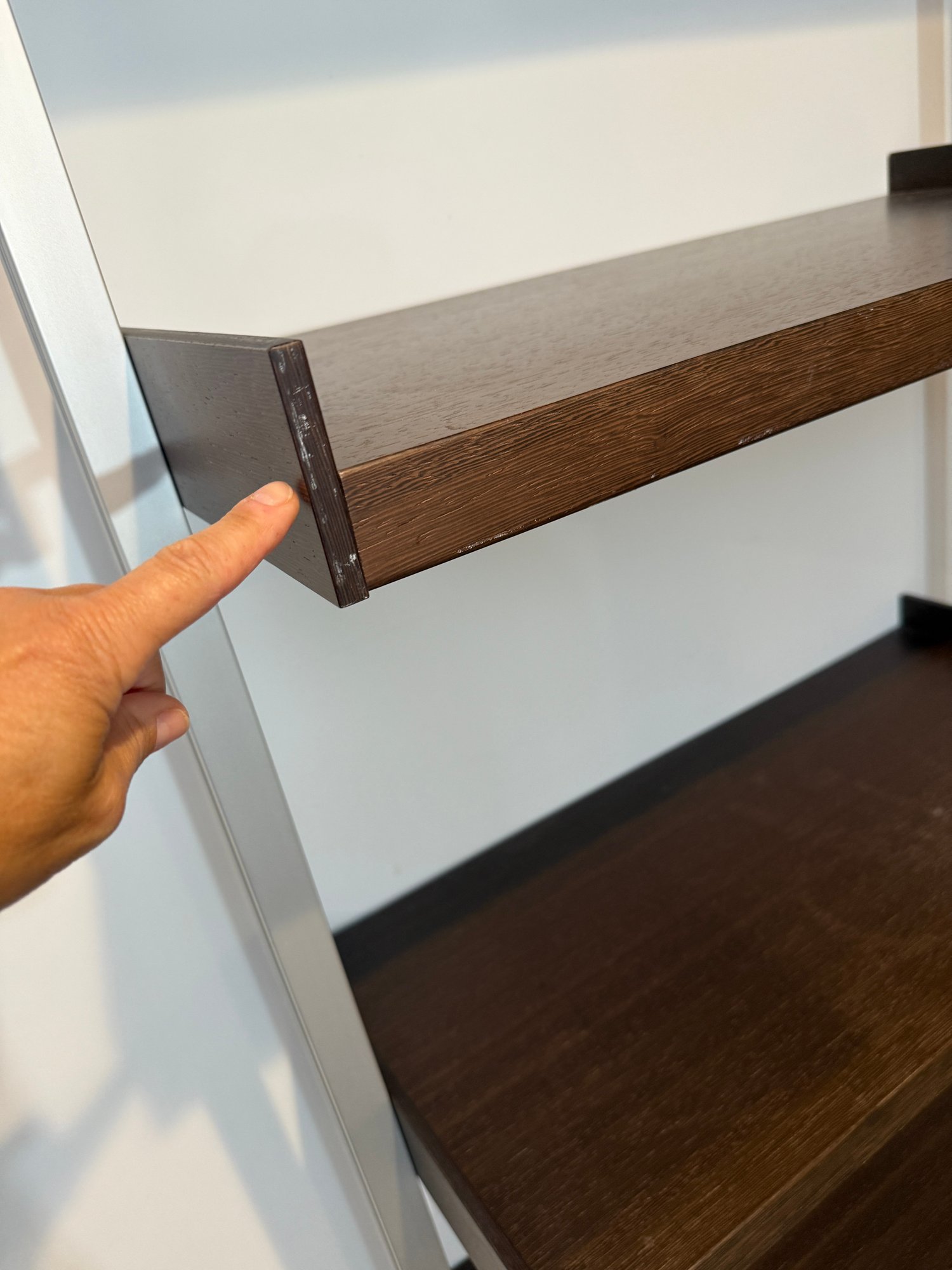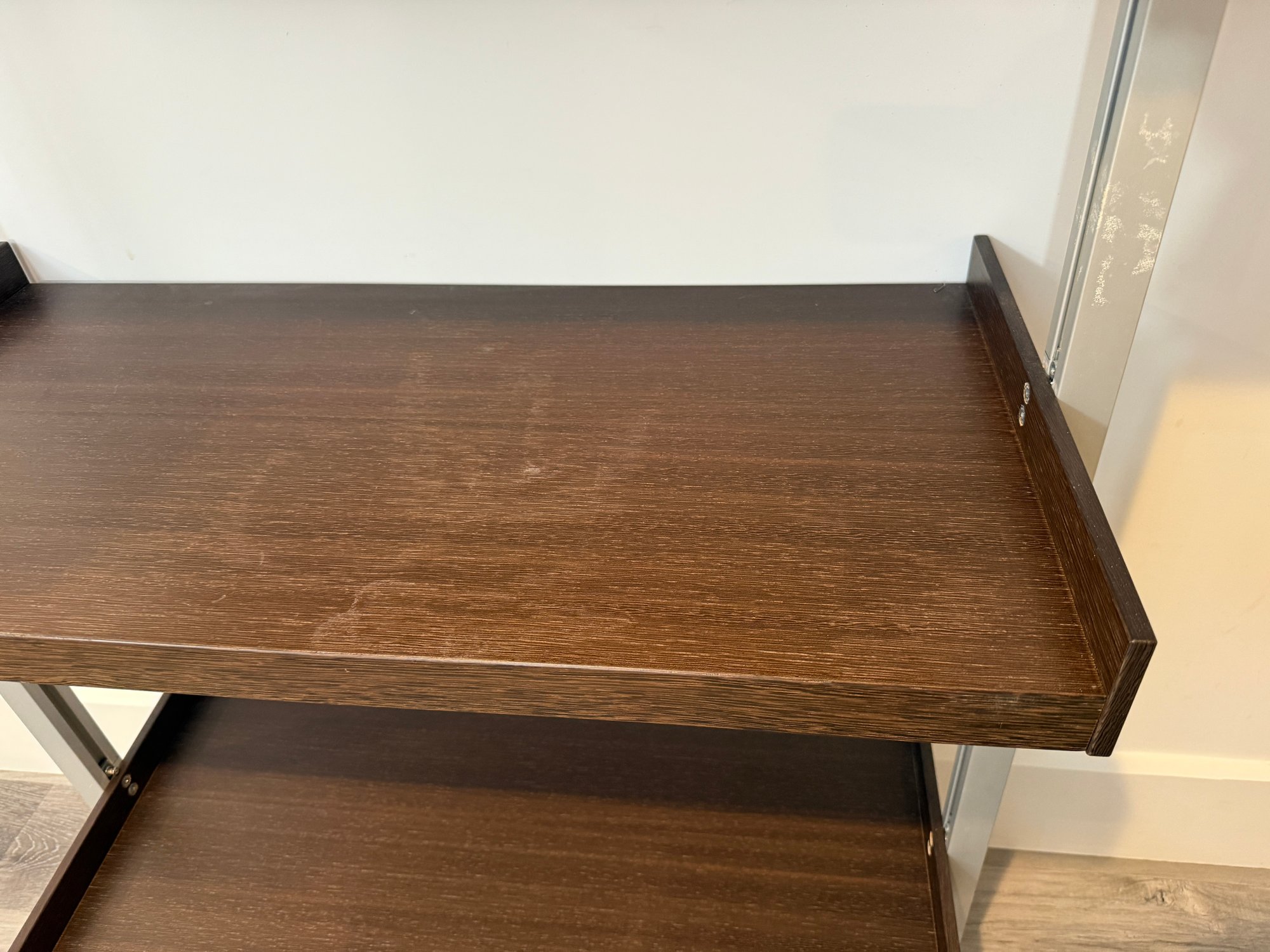 Believed to be Design Within Reach Treku wall shelving system. Brushed stainless steel with wood shelves